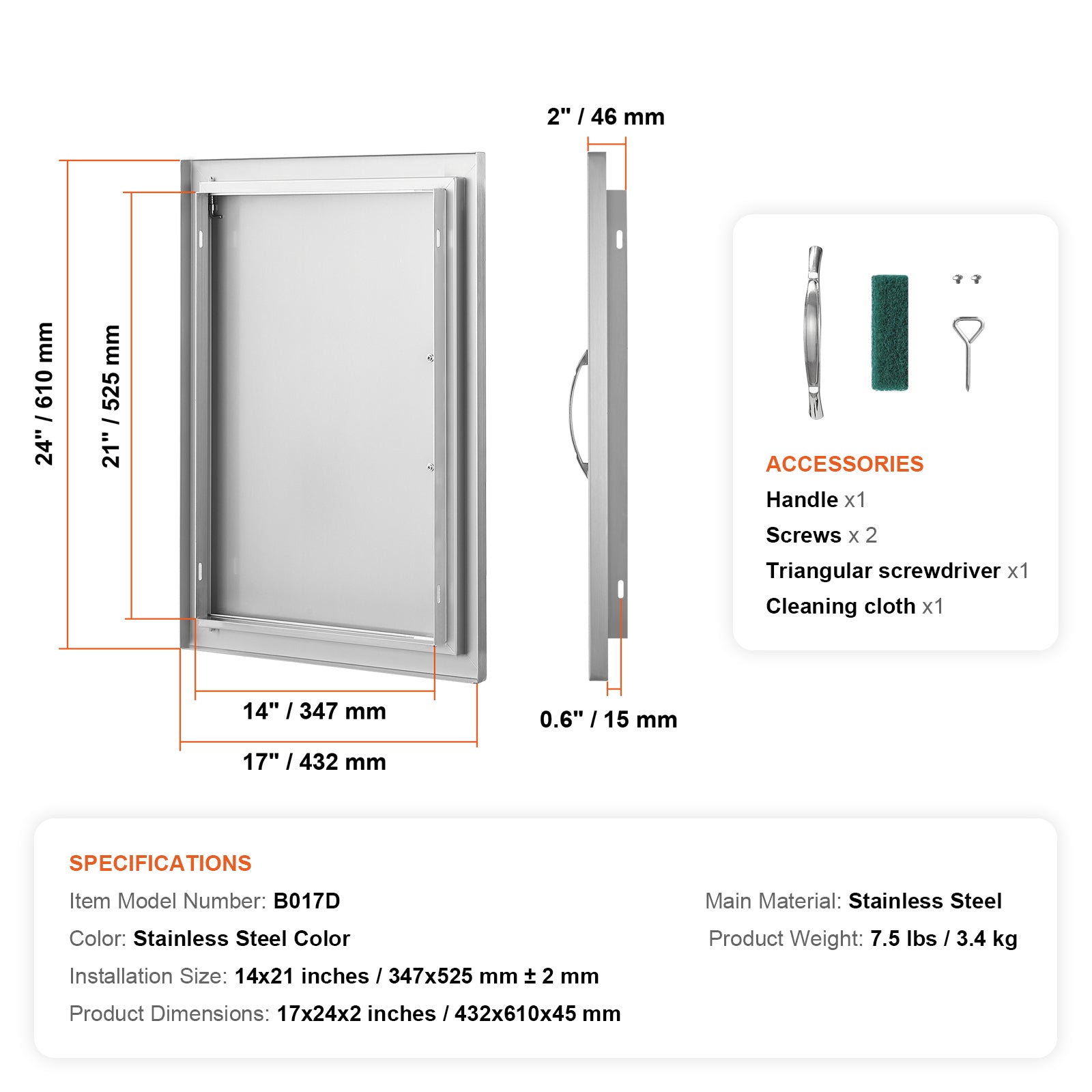 BBQ Access Door, 17W x 24H Inch Single Outdoor Kitchen Door, Stainless Steel Flush Mount Door, Wall Vertical Door with Handle, for BBQ Island, Grilling Station, Outside Cabinet