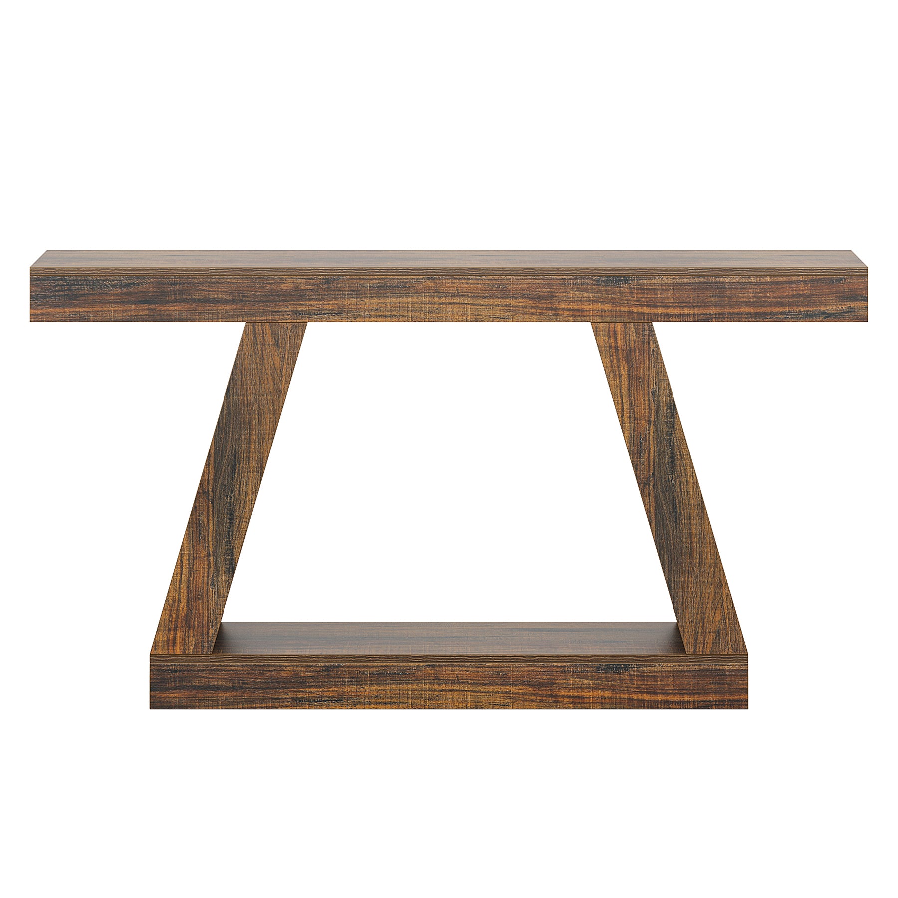 Product Description: Add a touch of rustic charm and functionality to your home with this 55" farmhouse console table. Its spacious surface is perfect for displaying decor, while the integrated storage shelf provides a convenient space for books, baskets, or other essentials. The rich dark brown finish and sturdy wooden construction make this an ideal industrial accent table for your entryway, hallway, or living room.