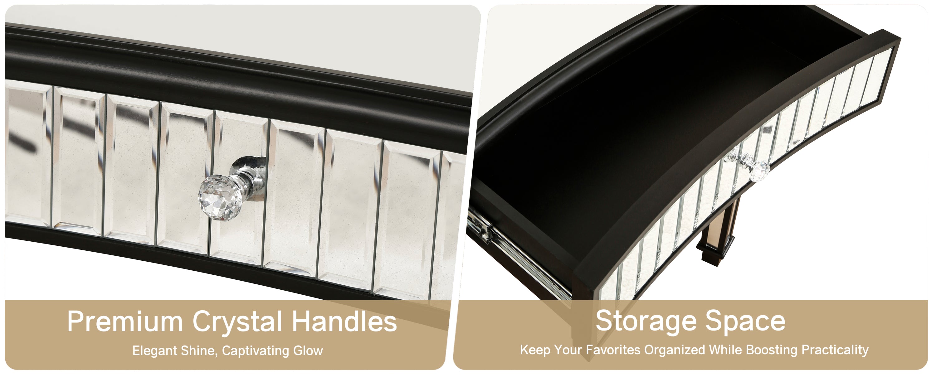 47" Half-Moon Mirrored Console Table with Fluted Glass & Crystal Knob Drawer, Silver Entryway Vanity Desk for Bedroom or Dressing Room (Black+Silver)
