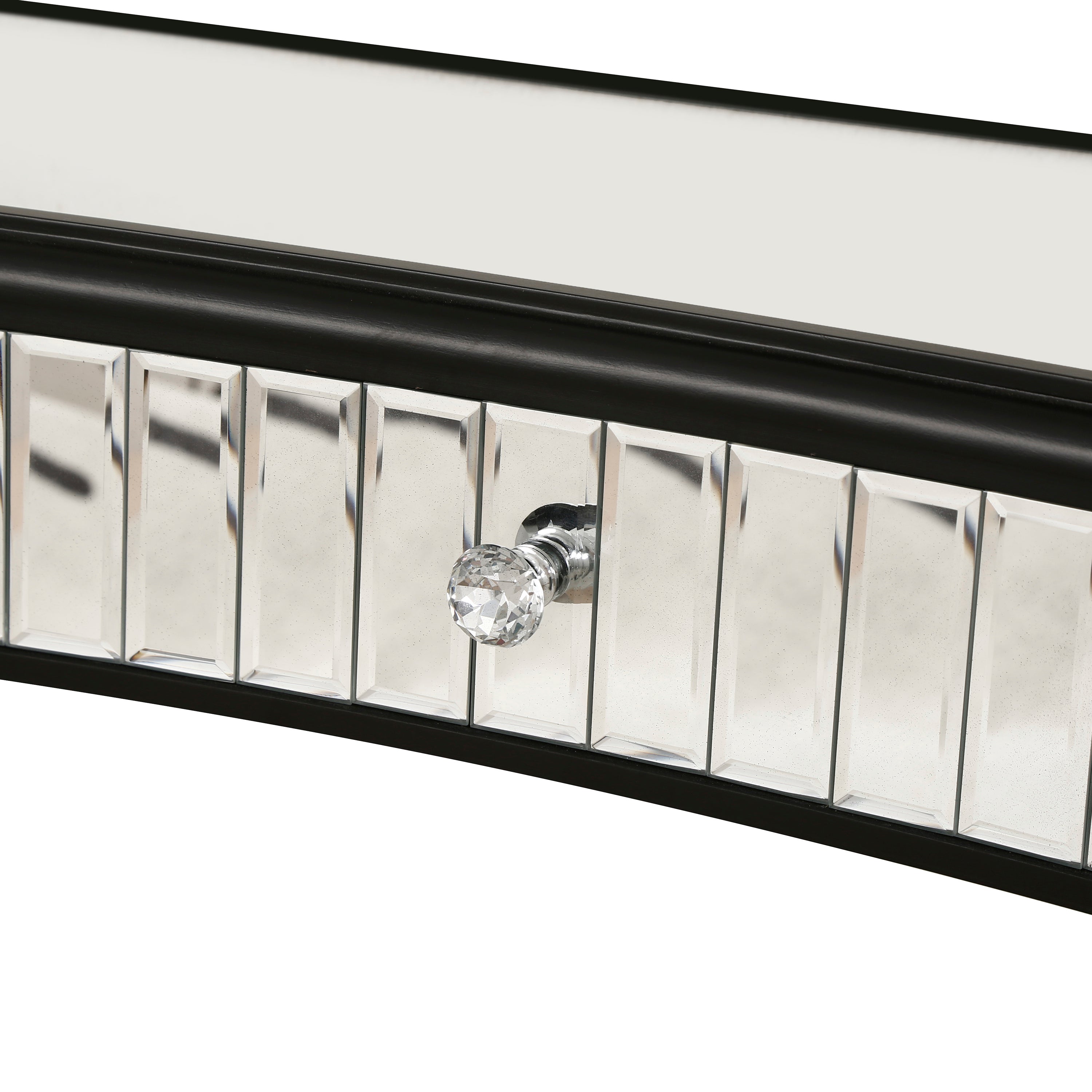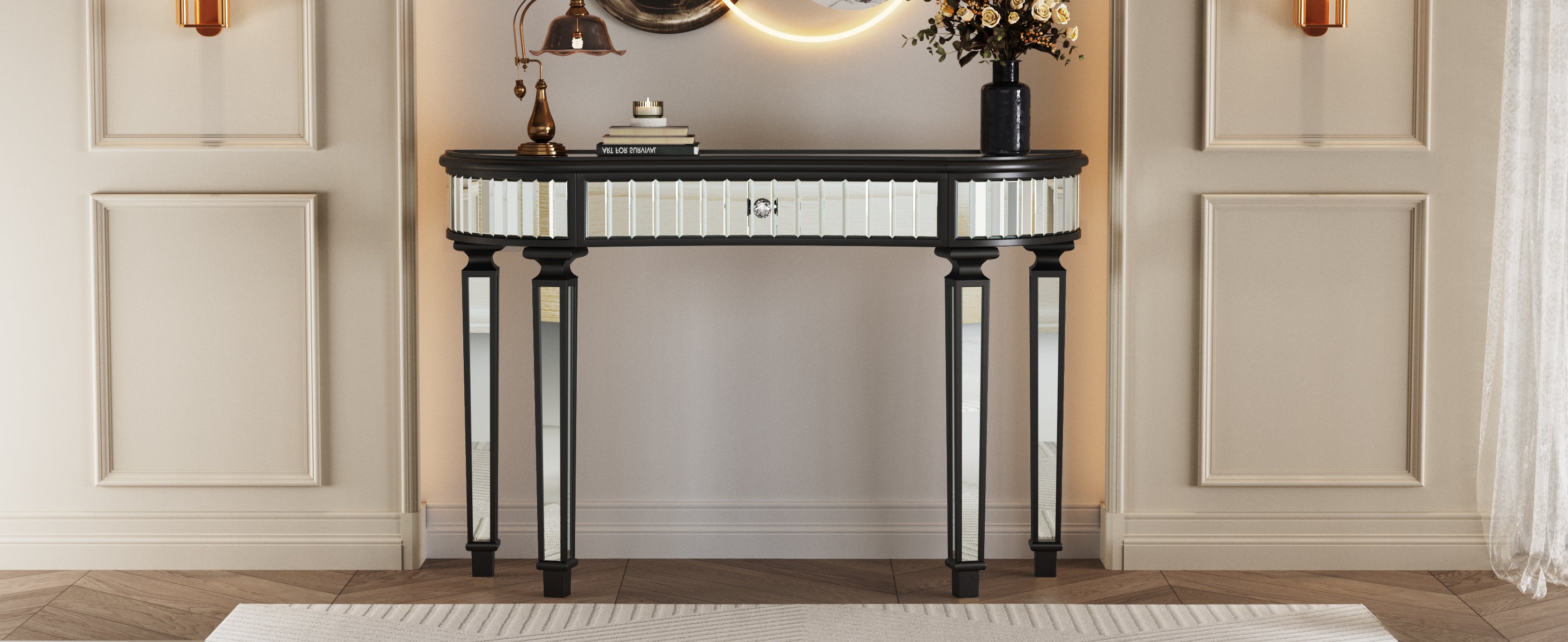 Add a touch of elegance to your home with this 47" Half-Moon Mirrored Console Table, featuring fluted glass panels and a crystal knob drawer for timeless sophistication. The silver mirrored finish and black accents create a stunning reflective look that brightens any space. Perfect as an entryway table, vanity desk, or dressing room accent, this piece combines luxury design with functional storage. Crafted with high-quality materials, it offers both durability and style—ideal for modern, glam, or contemporary interiors.