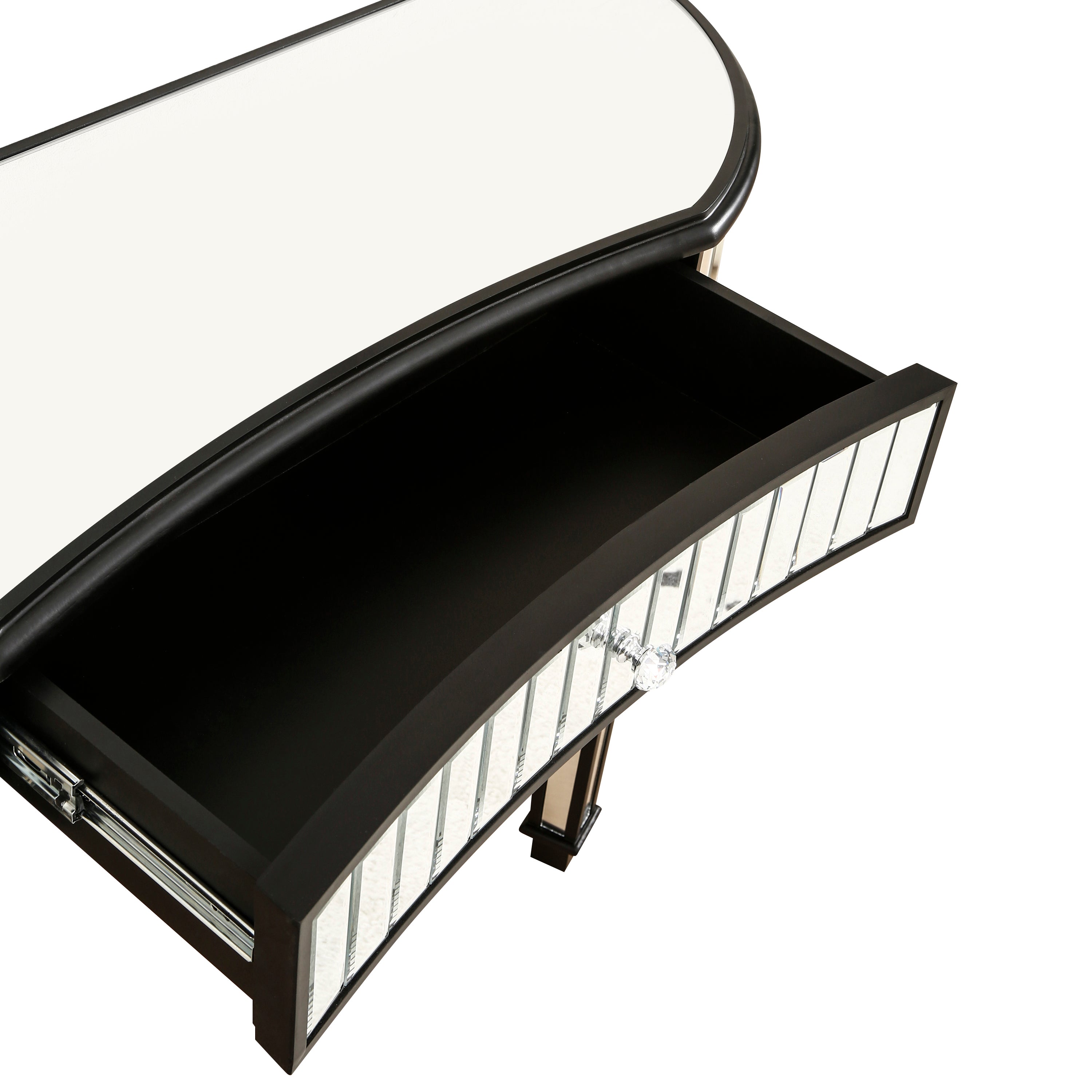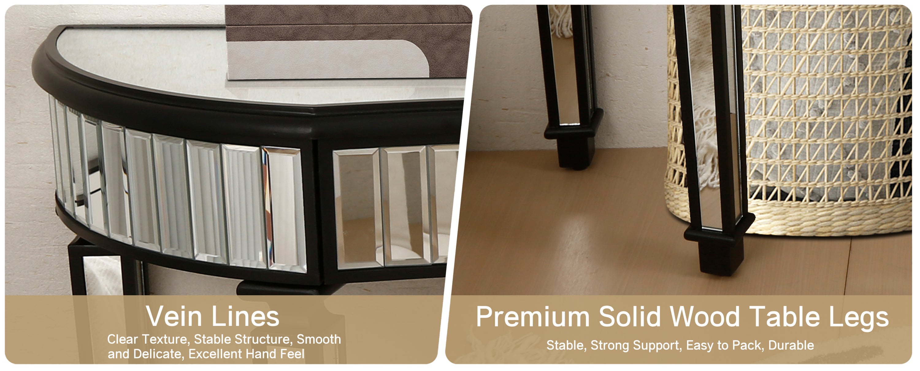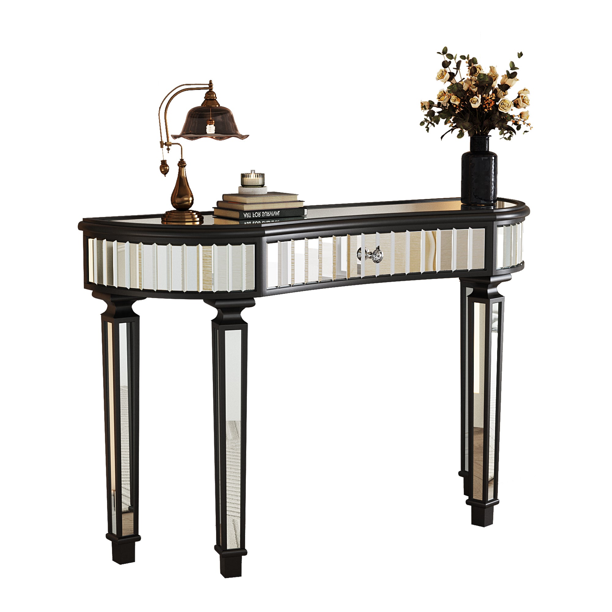 Elevate your space with the 47' Half-Moon Mirrored Console Table, blending safety and sophistication. Its signature crescent shape features child-friendly rounded edges, reducing injury risks while complementing modern, glam, or transitional interiors. Crafted for durability, the solid hardwood frame and four sturdy legs reliably hold 50 lbs on the fluted mirrored desktop and 30 lbs in the drawer—equipped with an elegant crystal knob handle for secure storage of cosmetics or valuables. The vertical fluted glass panels create dimension and reflect light beautifully. At just 13' deep and 31' high, this table seamlessly integrates into tight foyers, bedroom corners, or dressing areas. Use it as a statement entryway console, a sparkling vanity desk, or a chic display surface. Merging functional design with family-conscious details, it’s the perfect fusion of safety and luxury for your home.