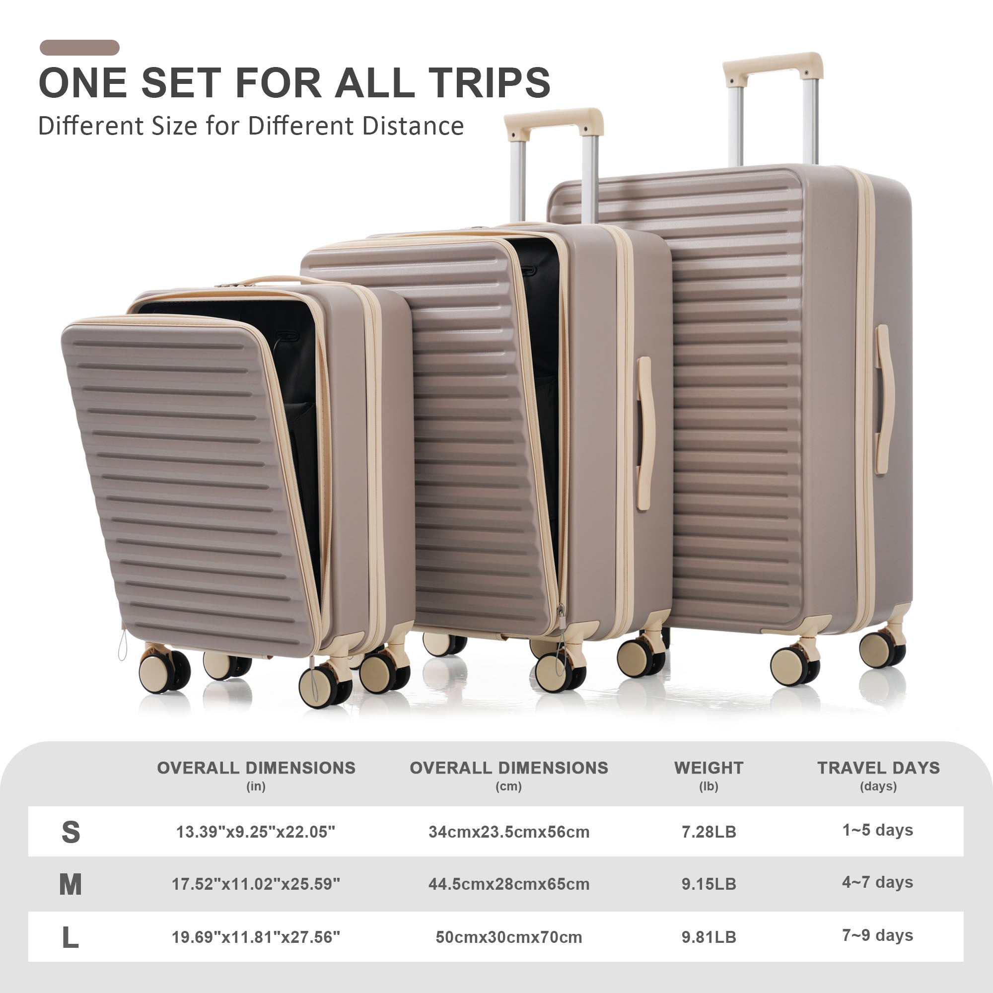 - 3 piece 20/24/28" luggage set : can be stored one into another,20" and 24"carry on luggage with front laptop pocket(size up to 15.6"), the 20"size is 13.39*9.25*22.05in(34*23.5*56cmcm) Suitable for the overhead cabin, it is an airline size approved, 7.28 pounds (3.3kg) in weight, 24" checked suitcase = 17.52*11.02*25.59in (44.5*28*65cm) = 9.15Ibs (4.15kg) . 28" checked suitcase =19.49*12.01*30.12in (49.5*30.5*76.5cm)=9.81Ibs(4.45kg)