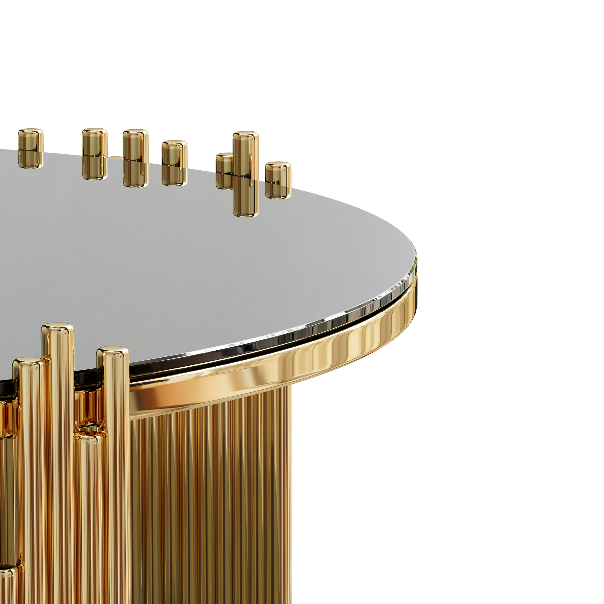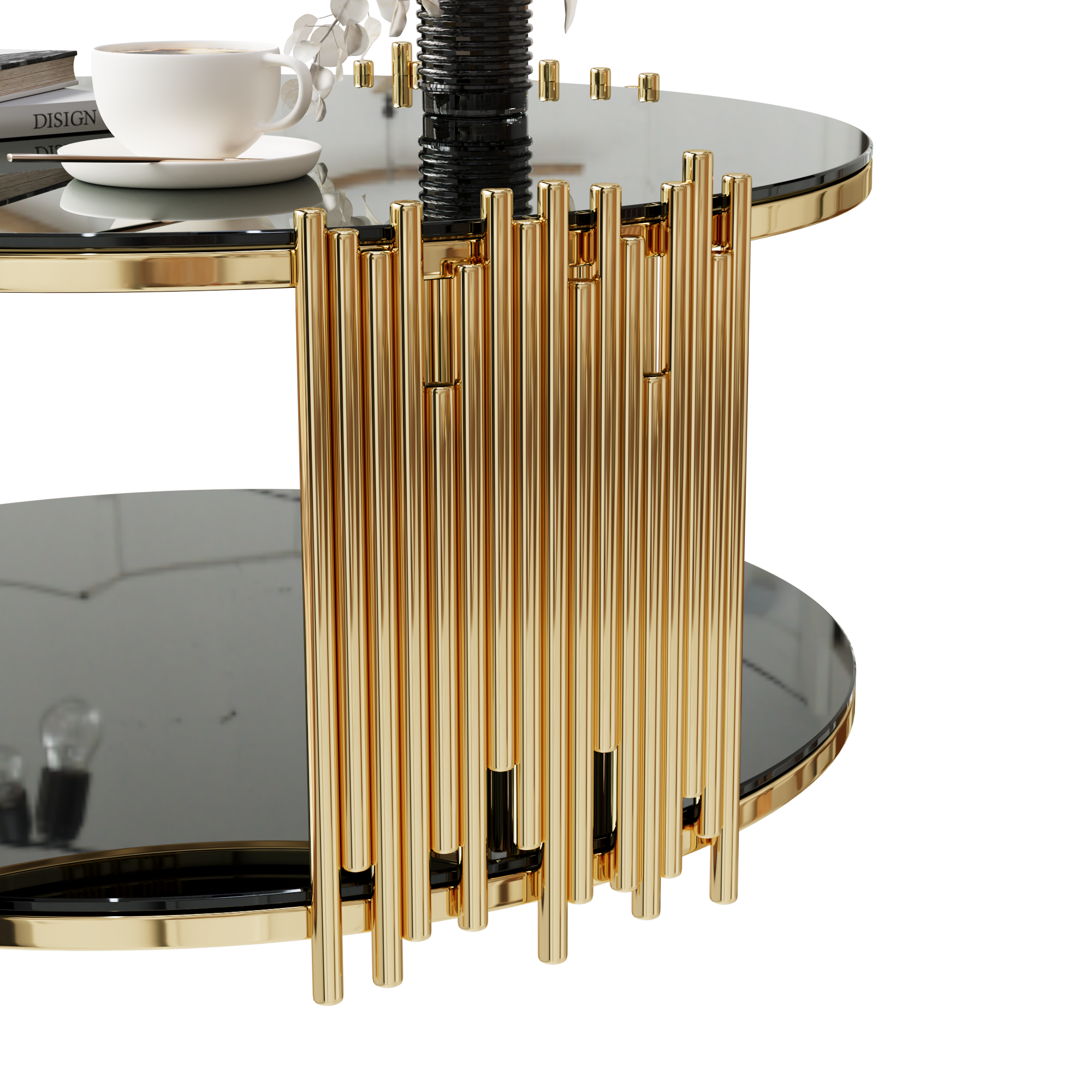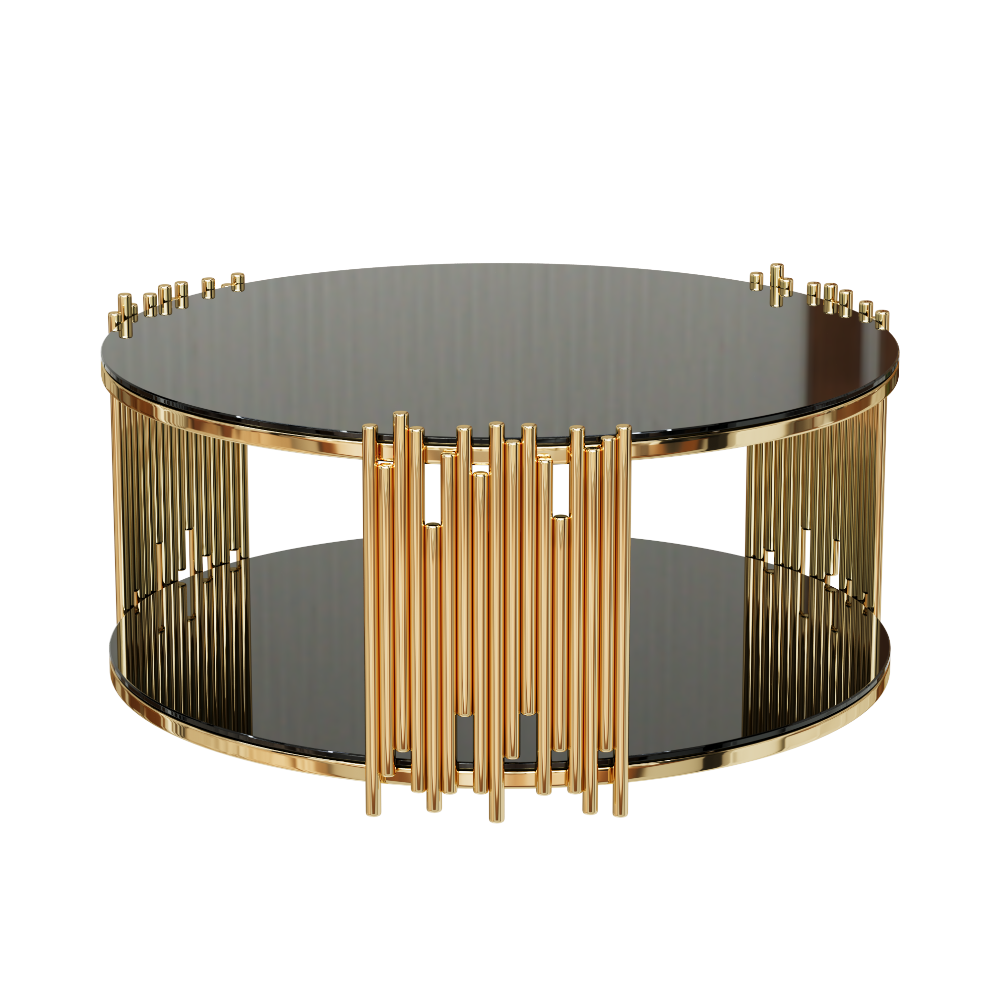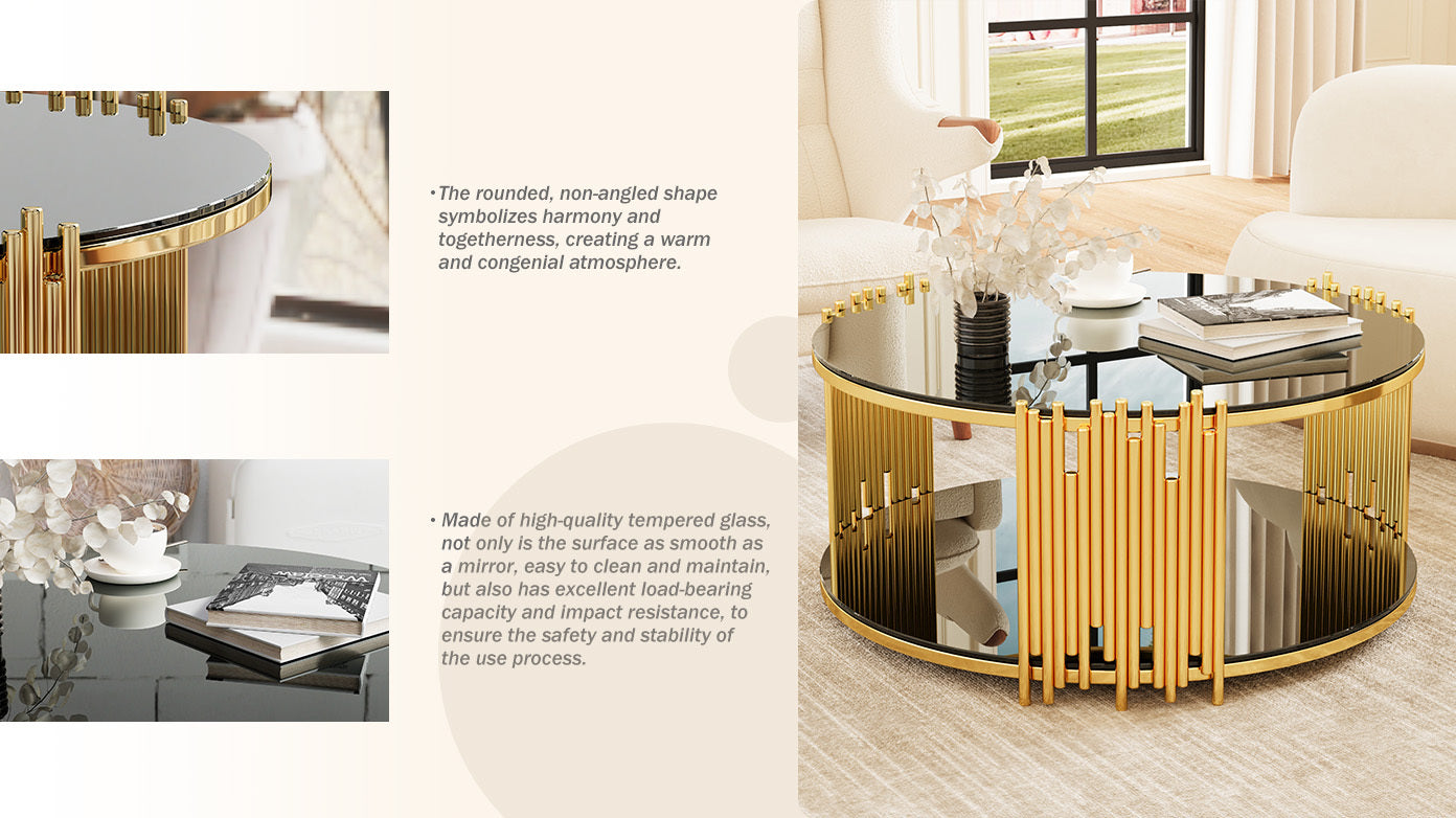 • 1. Modern minimalist design: This circular coffee table adopts a modern minimalist design style, with a golden metal frame and black glass countertop complementing each other, adding a fashionable touch to your living room.