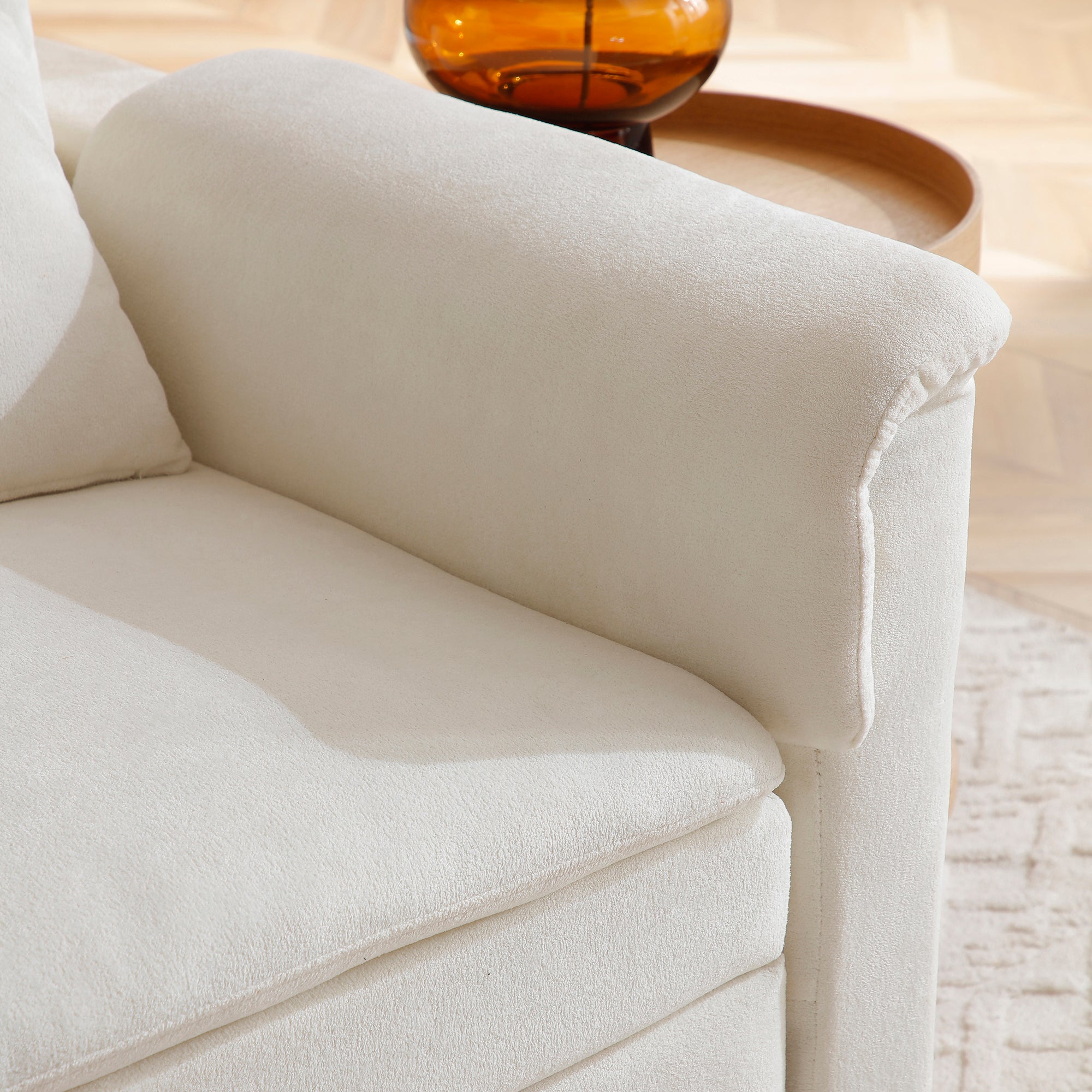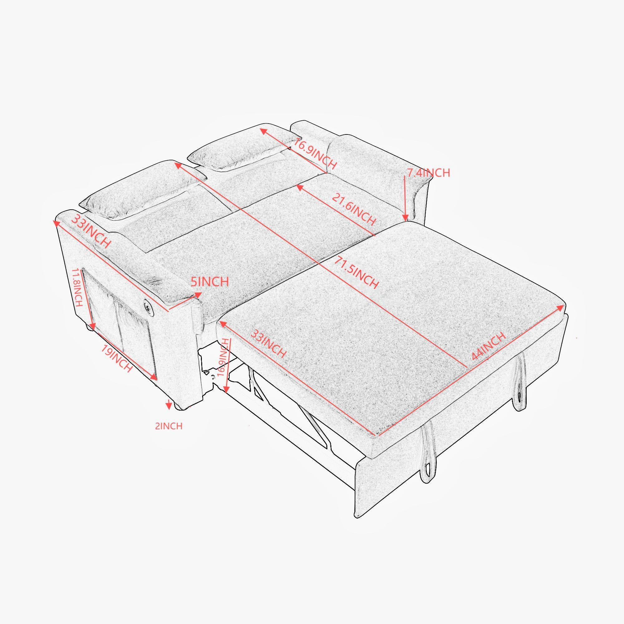 Product Description: Maximize your living space with this highly versatile 55" velvet pull-out sofa bed. This stylish beige love seat effortlessly converts from a comfortable two-seater sofa to a cozy lounge or a convenient bed, making it the ultimate 3-in-1 solution for small spaces and overnight guests. The modern design is enhanced with an adjustable backrest, dual USB ports for charging, and two convenient side pockets for storage. Two matching waist pillows are also included for added comfort.