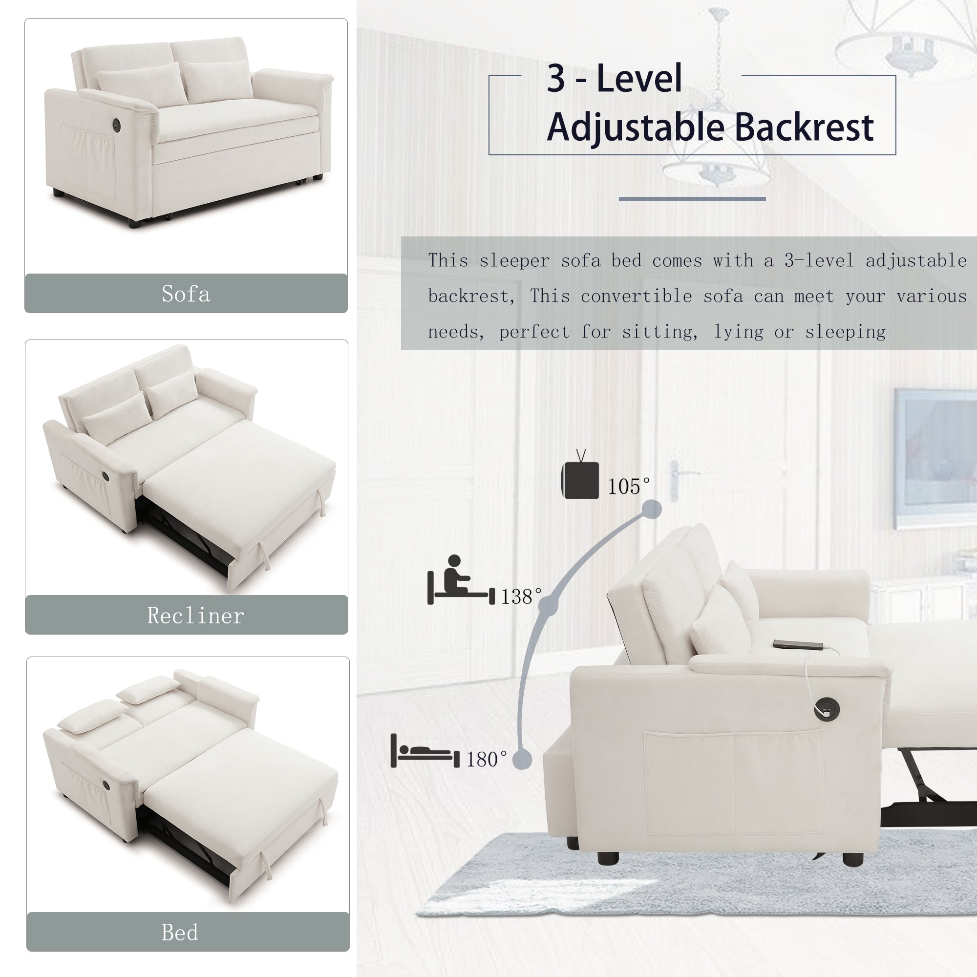 55" Velvet Pull-Out Sofa Bed with USB Ports | 3-in-1 Convertible Sleeper Sofa in Beige