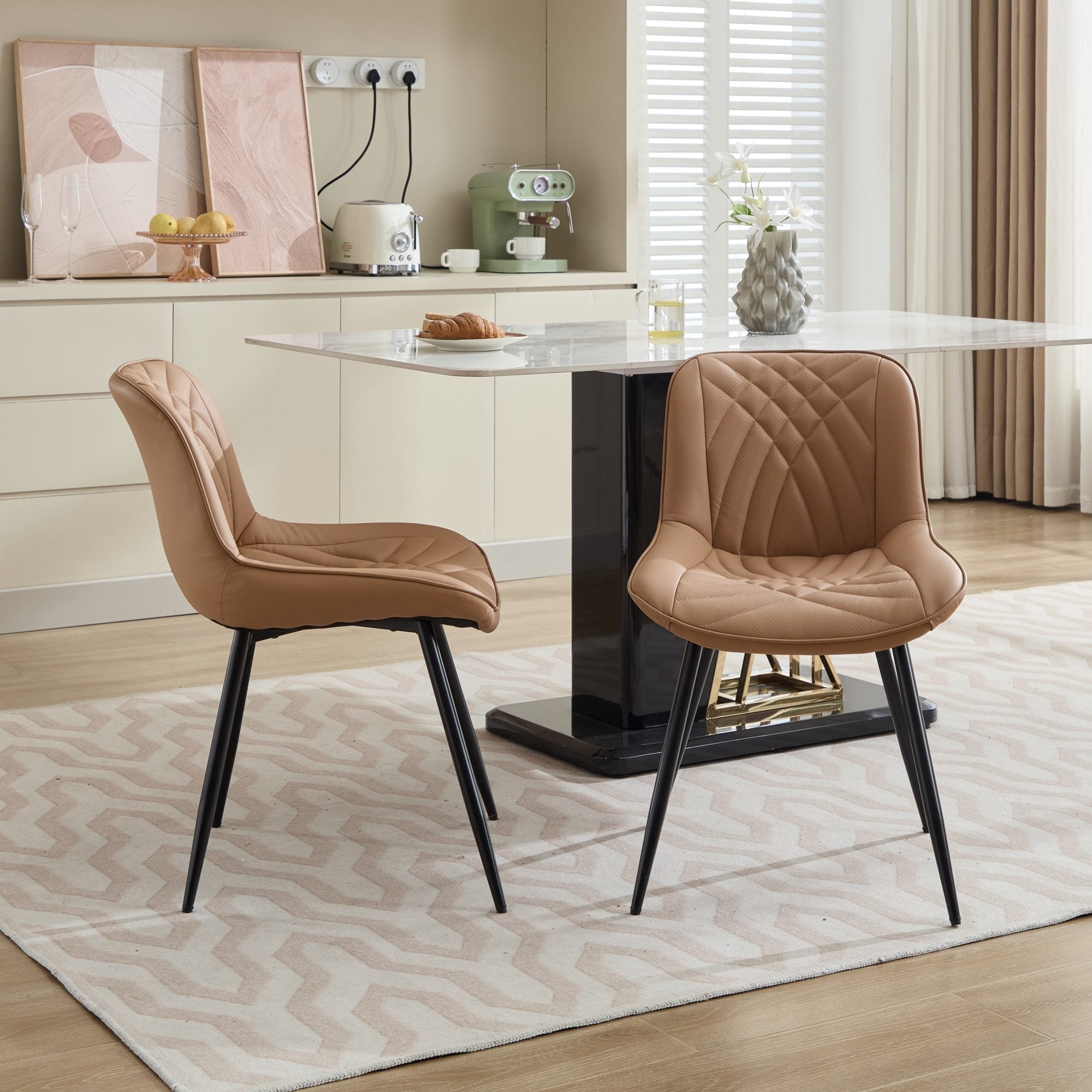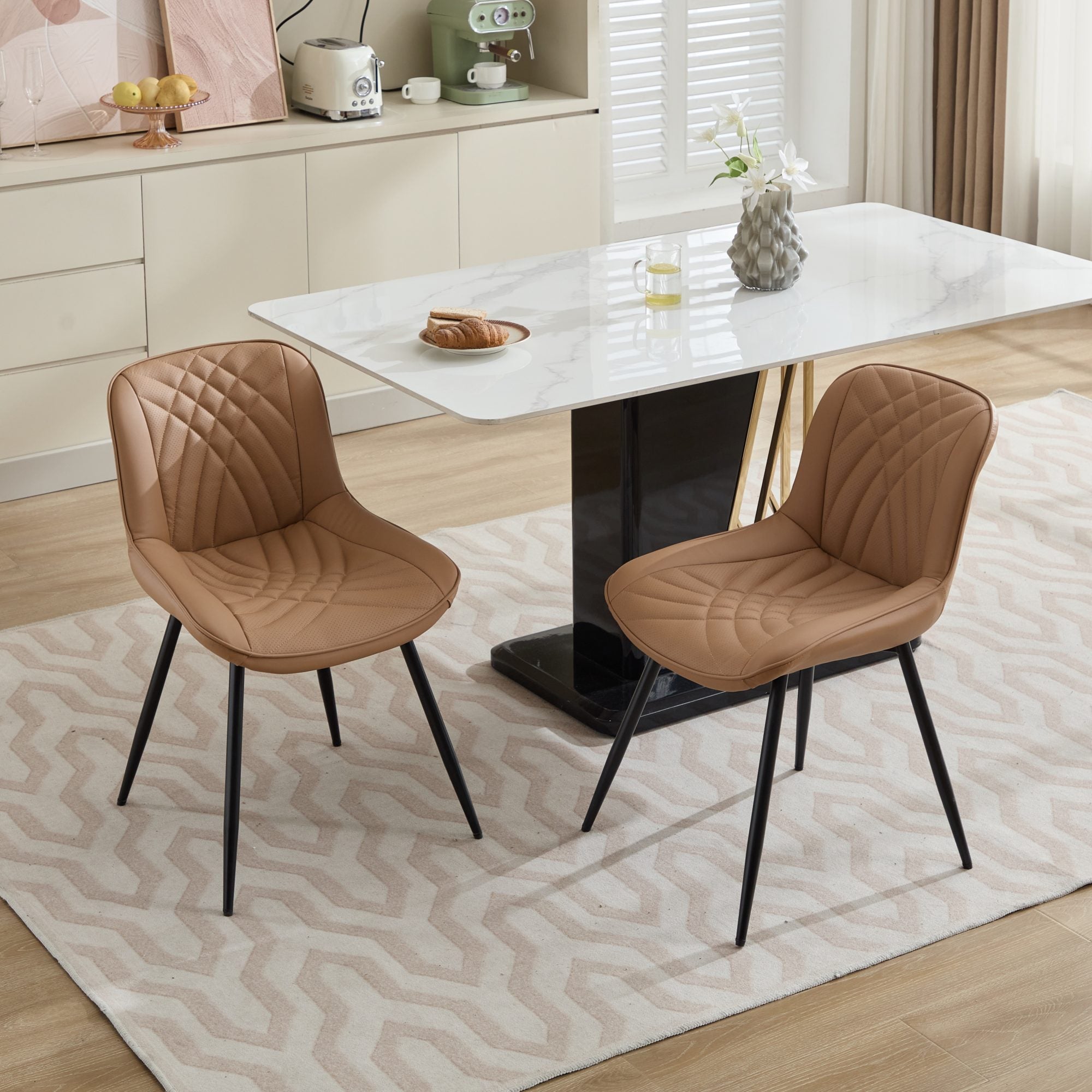 Product Description: Upgrade your dining space with this stylish set of 2 Mid Century Modern dining chairs. Designed for comfort and elegance, these kitchen chairs feature a generously padded seat and back, upholstered in durable and easy-to-clean faux leather. The chic khaki color adds a touch of sophistication to any decor. With their comfortable, ergonomic design, these dinner chairs are perfect for long meals and entertaining in your kitchen dining room.