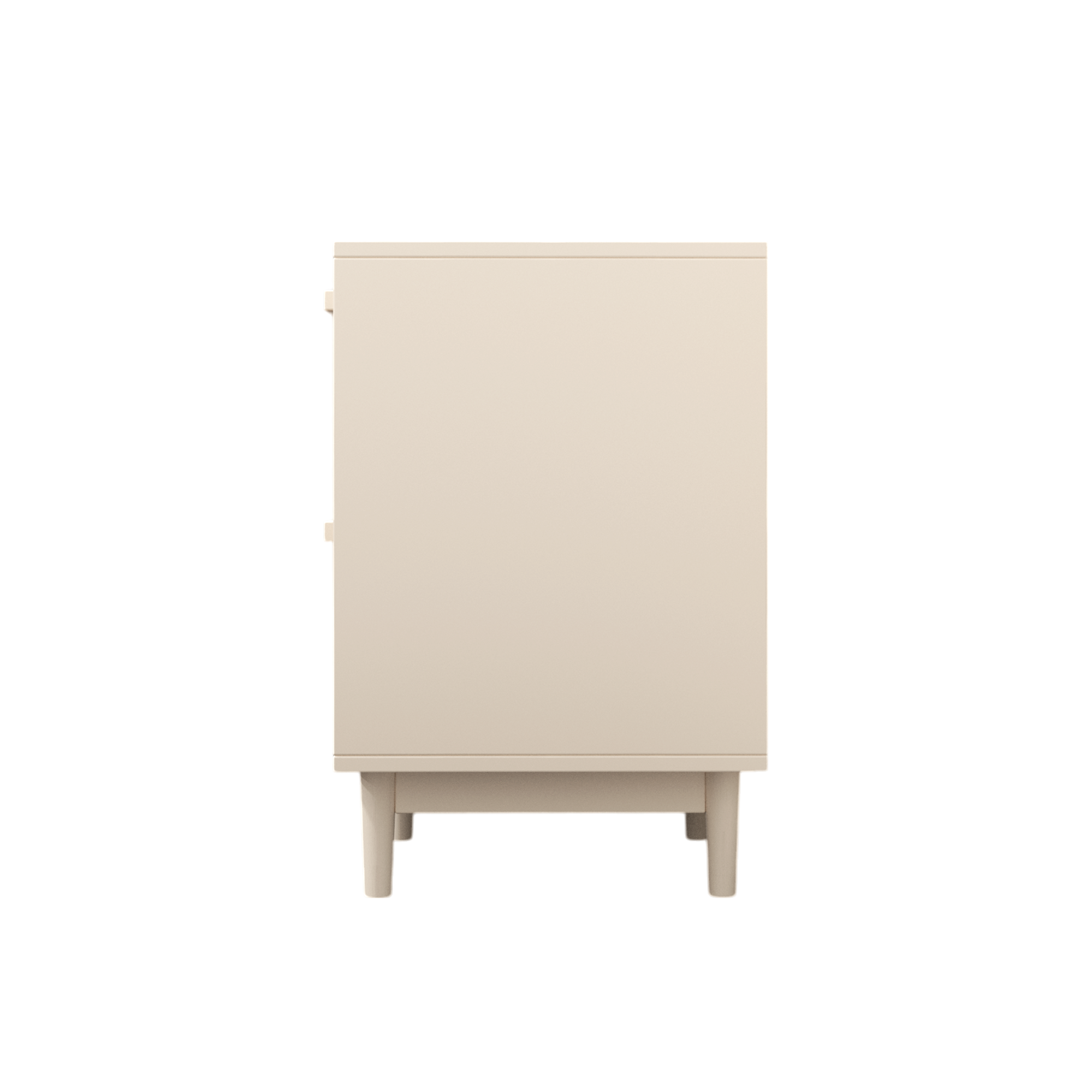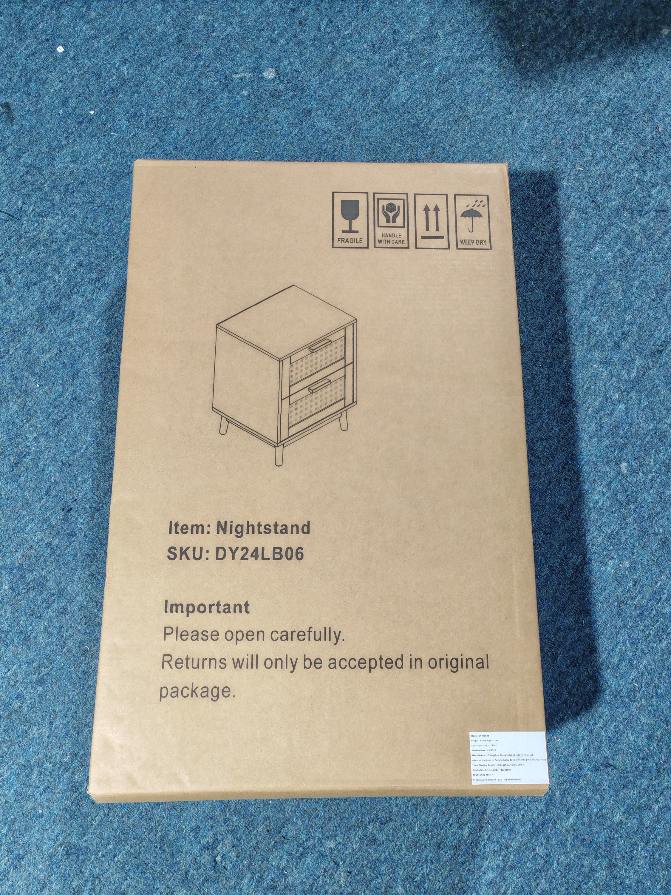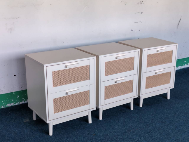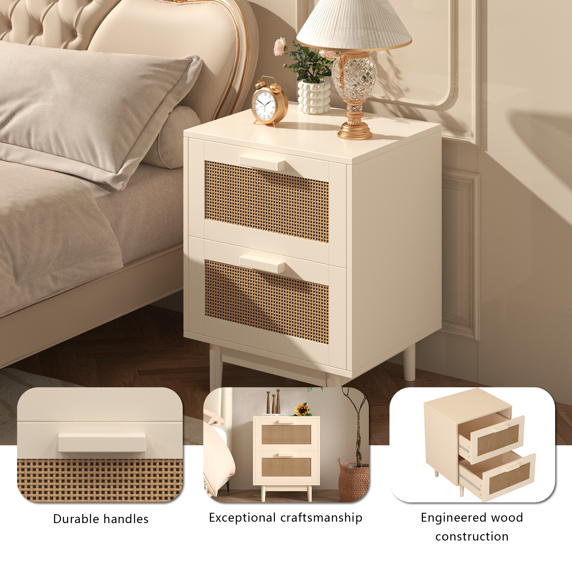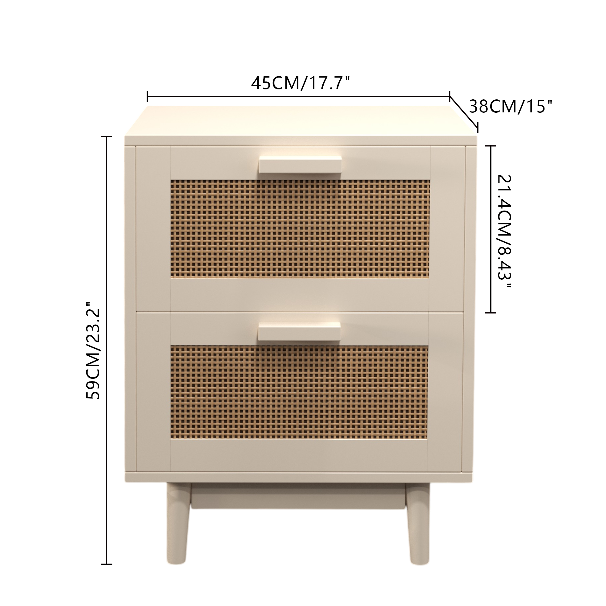 - Featuring expertly crafted rattan-style sliding drawers and a natural wood-tone finish, this bedside table combines functionality with aesthetic appeal. Though the rattan is synthetic, it mimics the texture and charm of natural materials, ensuring durability and easy maintenance. This versatile piece functions as a nightstand, bedside cabinet, or storage unit, meeting various bedroom storage needs. With clean lines and a timeless design, it complements a range of interior styles, adding understa