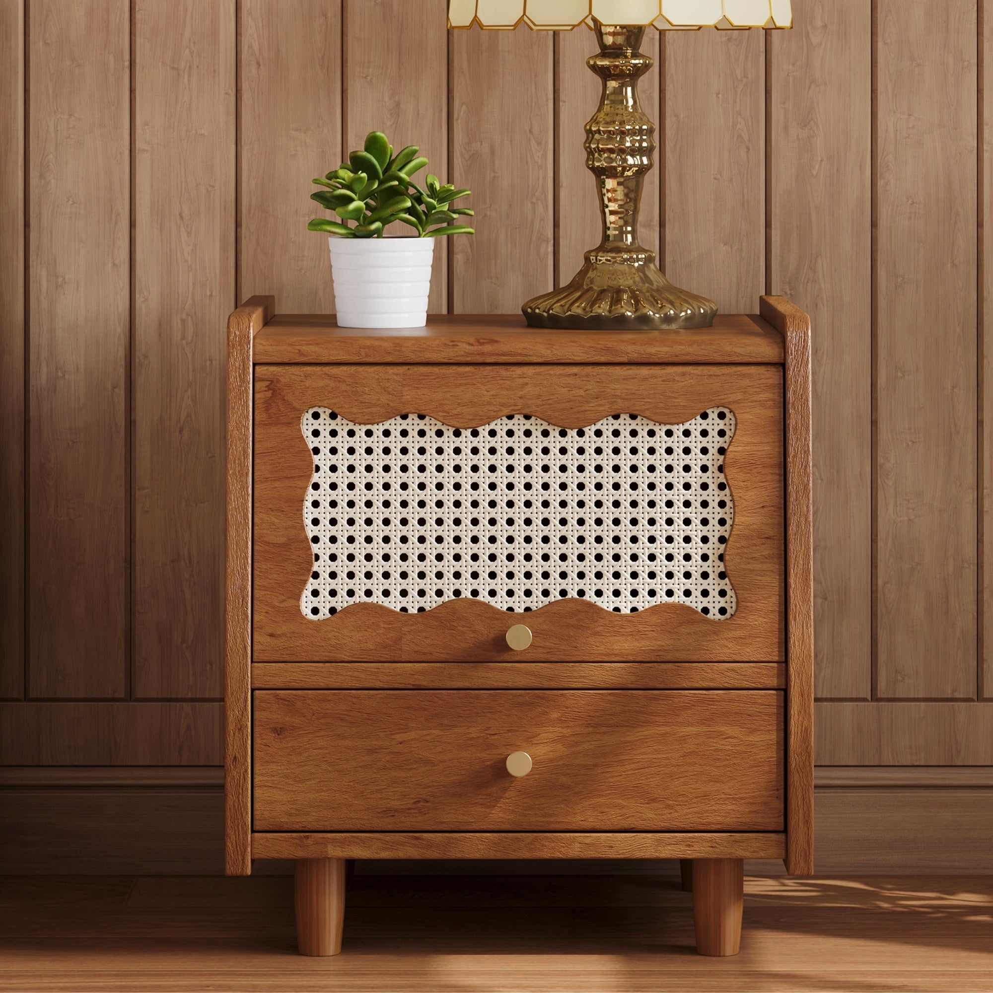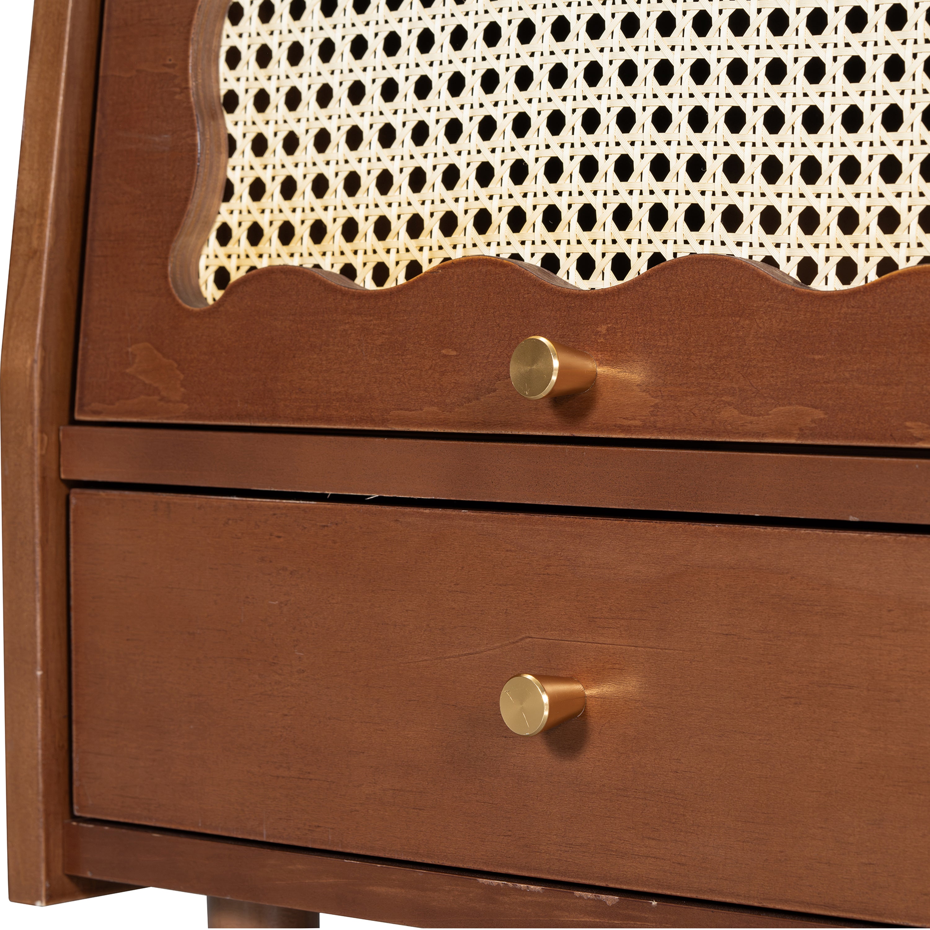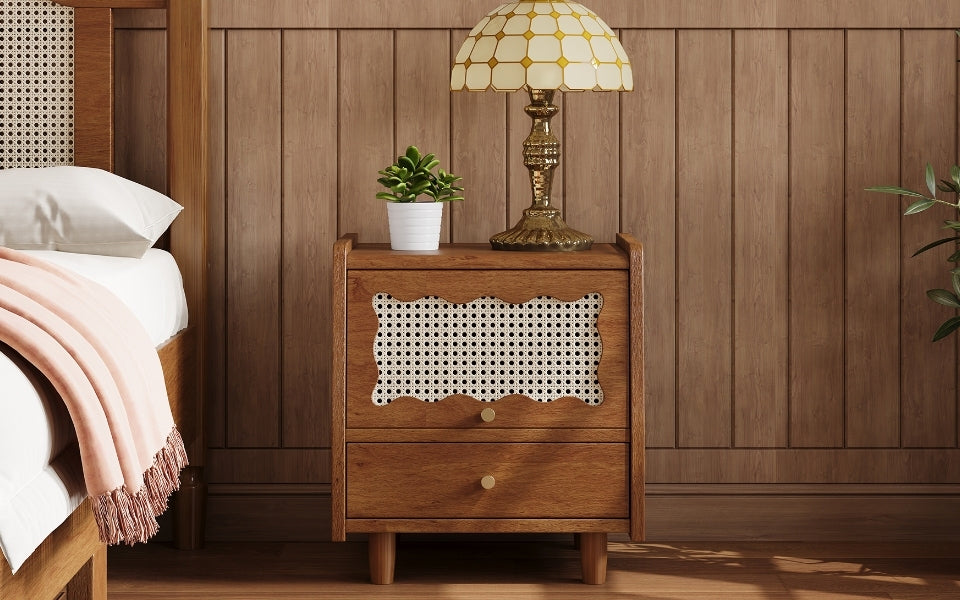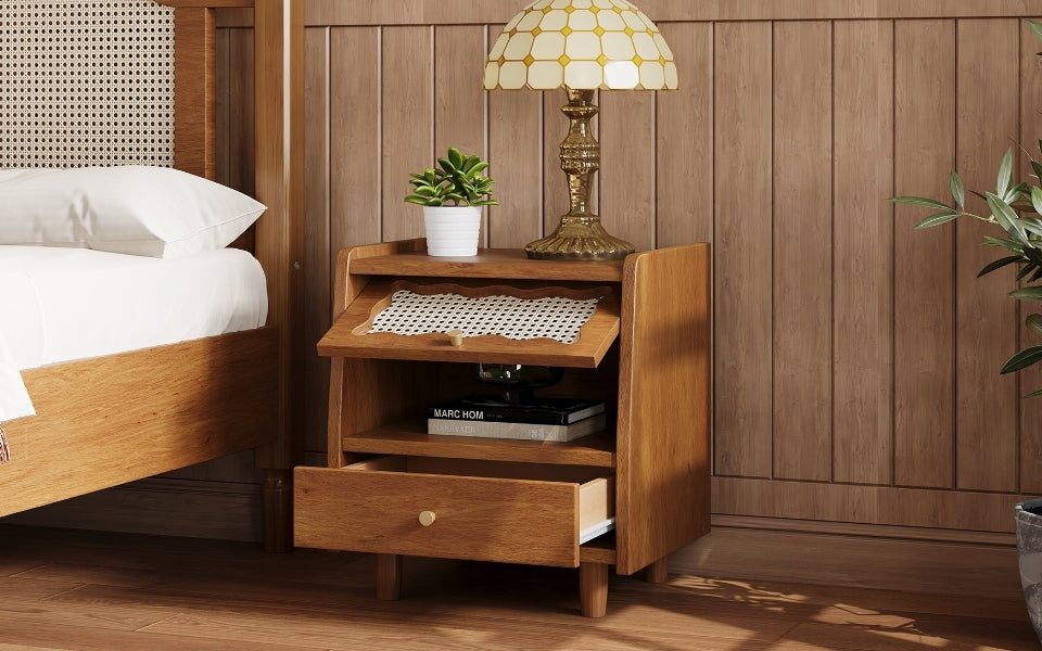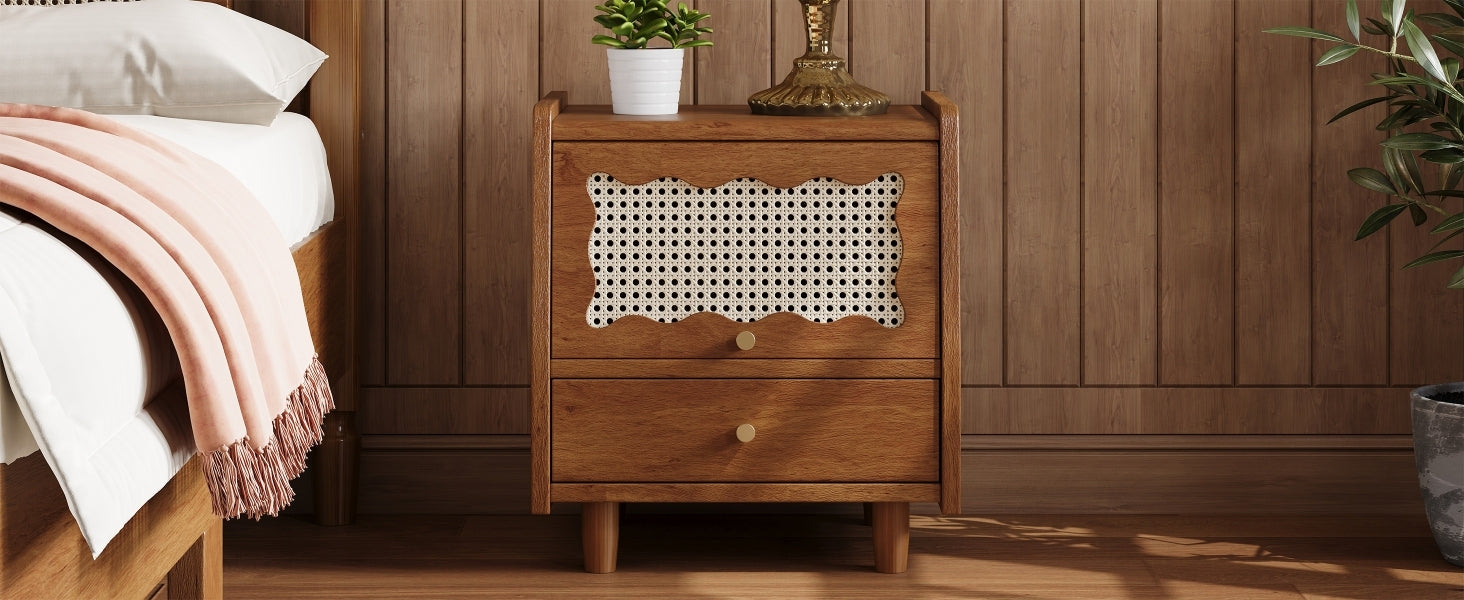 Vintage Nightstand with Rattan-Woven Surfaces and Drawer,Exquisite Elegance for Bedroom,Walnut