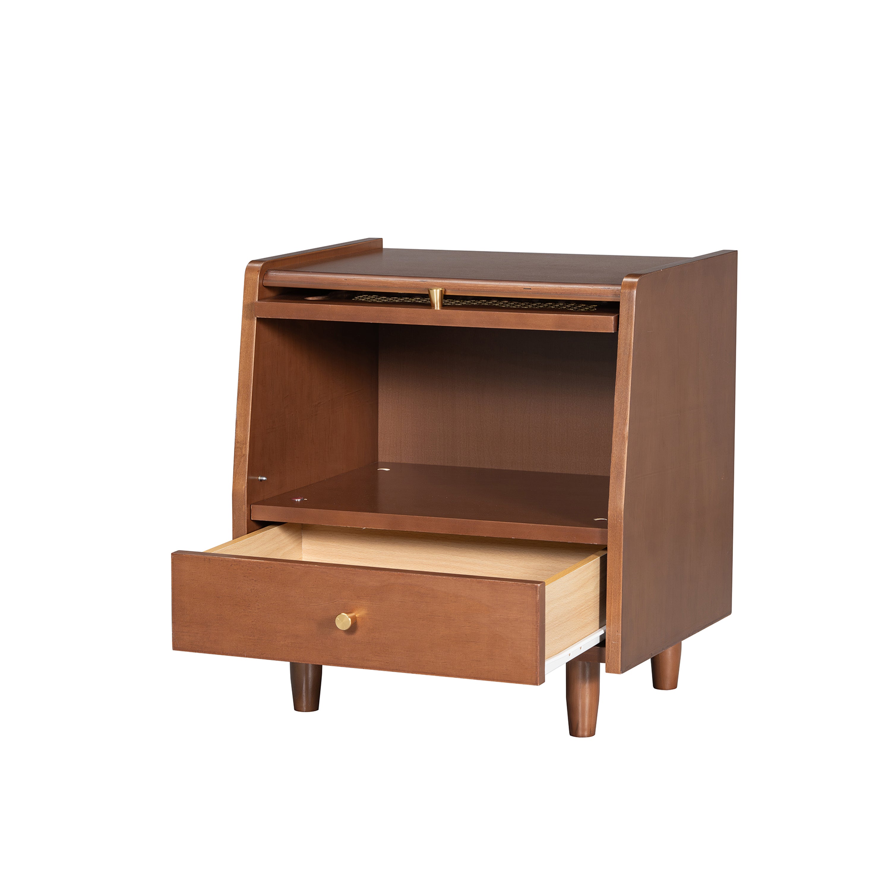 Wooden Nightstand with Rattan-Woven Storage Cabinet and 1 Drawer, Exquisite Elegance with Natural Storage Solutions for Bedroom, Walnut
