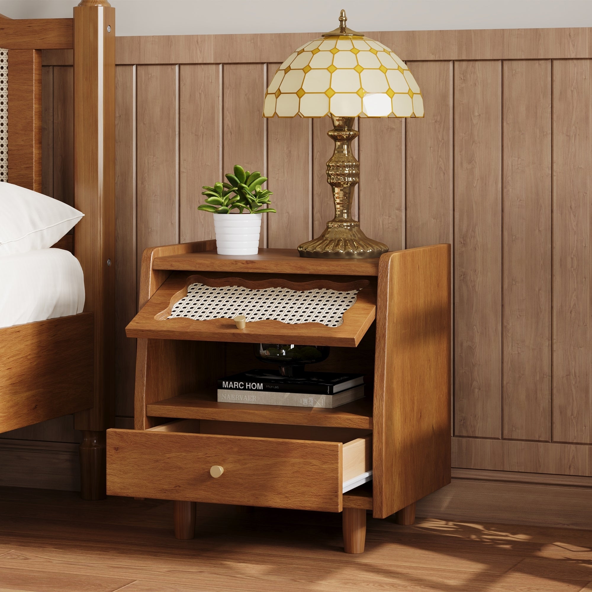 Add natural charm and functional elegance to your bedroom with this Wooden Nightstand featuring a Rattan-Woven Storage Cabinet and 1 Drawer. Crafted in a warm walnut finish, this nightstand blends modern design with boho-inspired details, offering a perfect balance of style and practicality. The spacious drawer and cabinet provide convenient storage for bedtime essentials, while the rattan panel adds texture and a touch of organic beauty. Ideal for bedrooms, guest rooms, or cozy reading corners, this piece enhances any space with timeless sophistication.