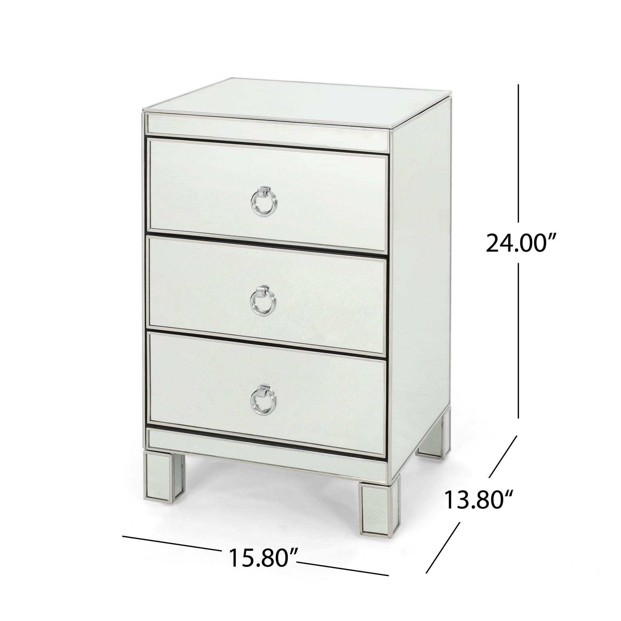 Add a touch of elegance and functionality to your space with the Mirrored Nightstand with 3 Drawers. This stylish silver side end table features a mirrored finish that enhances the light and beauty of any room. Perfect for small spaces, this nightstand fits effortlessly into your bedroom or living room, providing both storage and sophisticated decor.