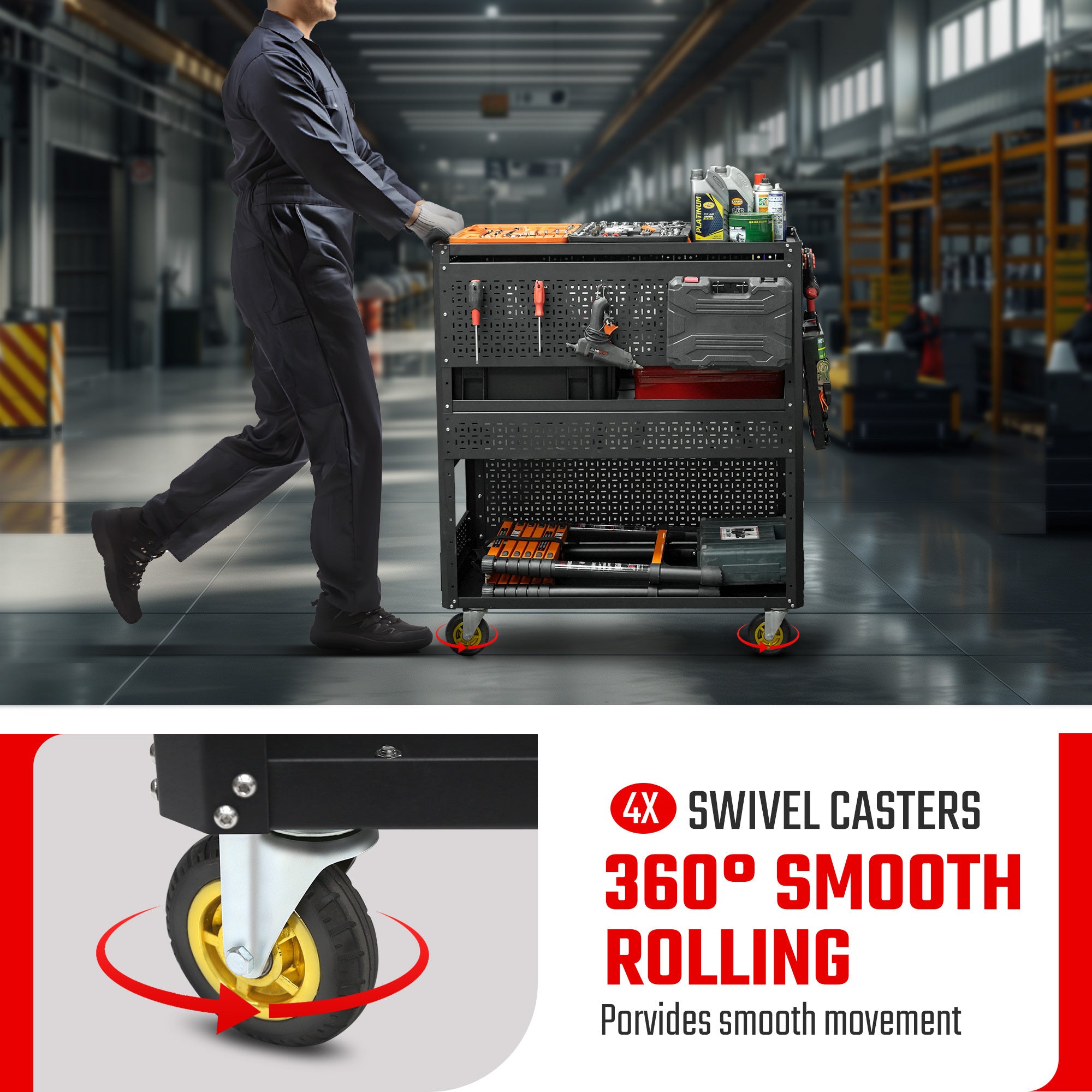 • Sturdy and Mobile Tool Cart : This 3-tier tool cart is made of high-quality steel, easy mobility and stability. The storage cart has 4 rolling wheels perfect for transporting tools across various surfaces, from concrete floors to workshop tiles. You can load various tools and supplies, making your job more efficient.