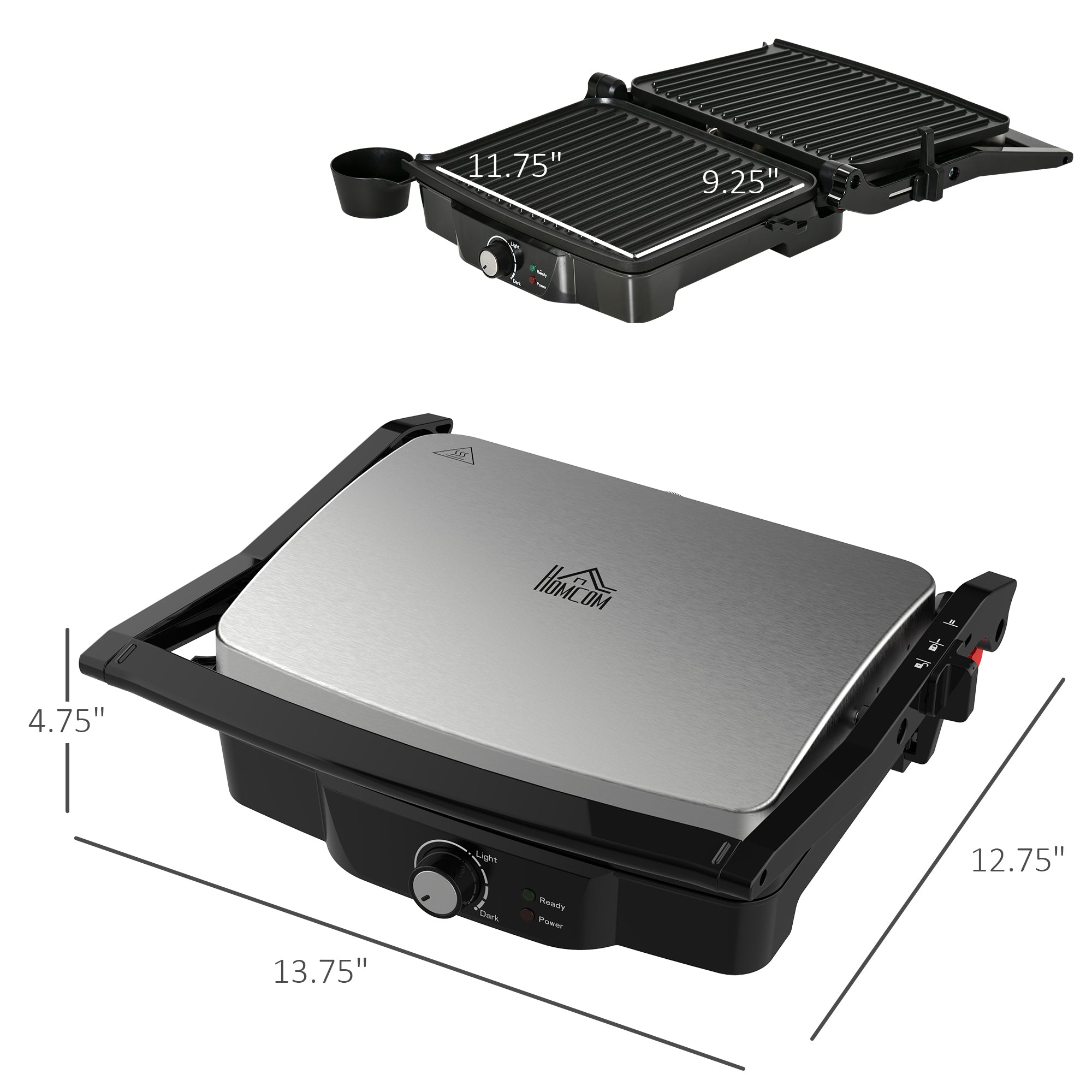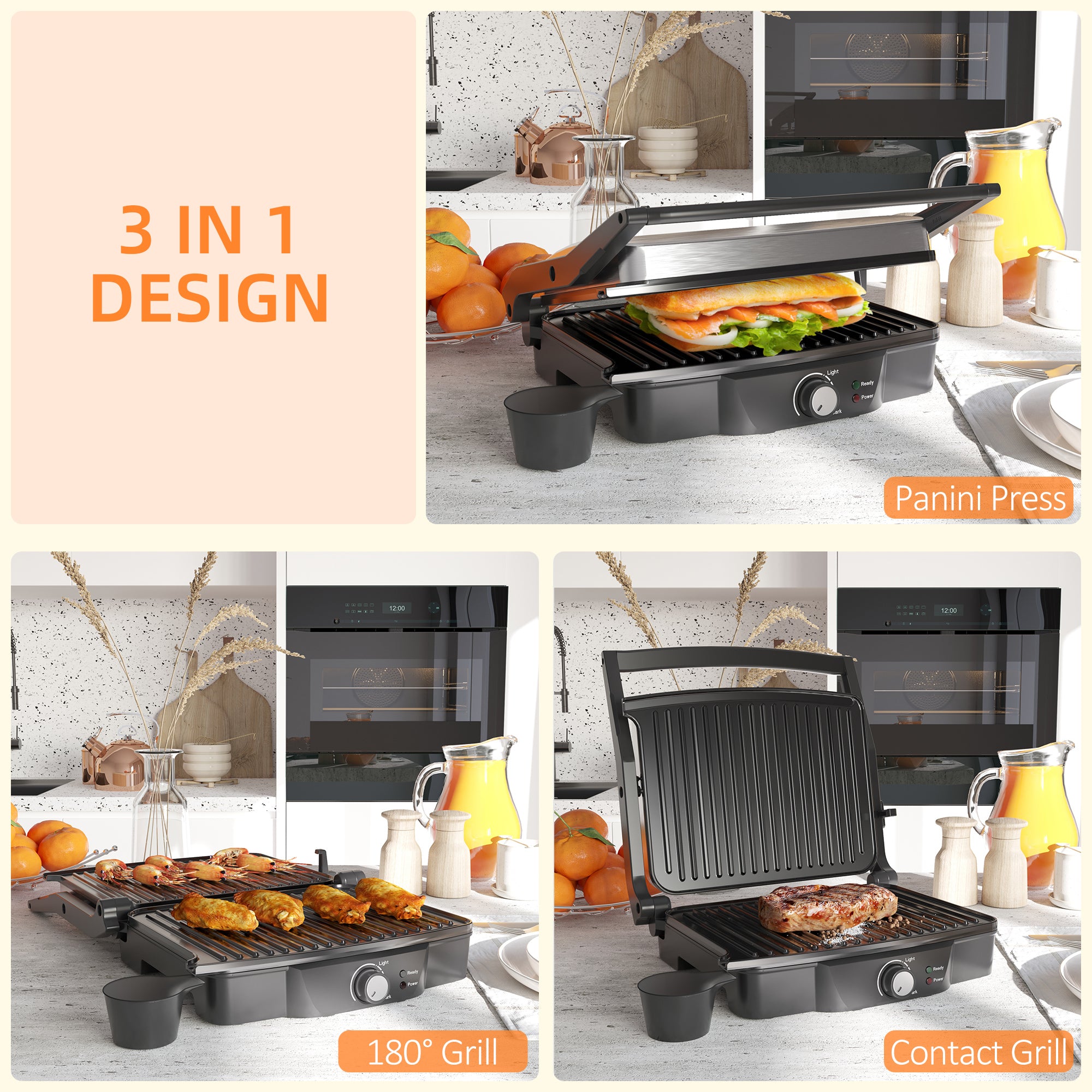 Make delicious sandwiches, paninis, and grilled meals with this 4-slice stainless steel Panini press grill. Features non-stick double plates, a locking lid for even cooking, and a built-in drip tray for easy cleanup. The grill opens 180° to fit any size or type of food—perfect for fast, versatile cooking at home.