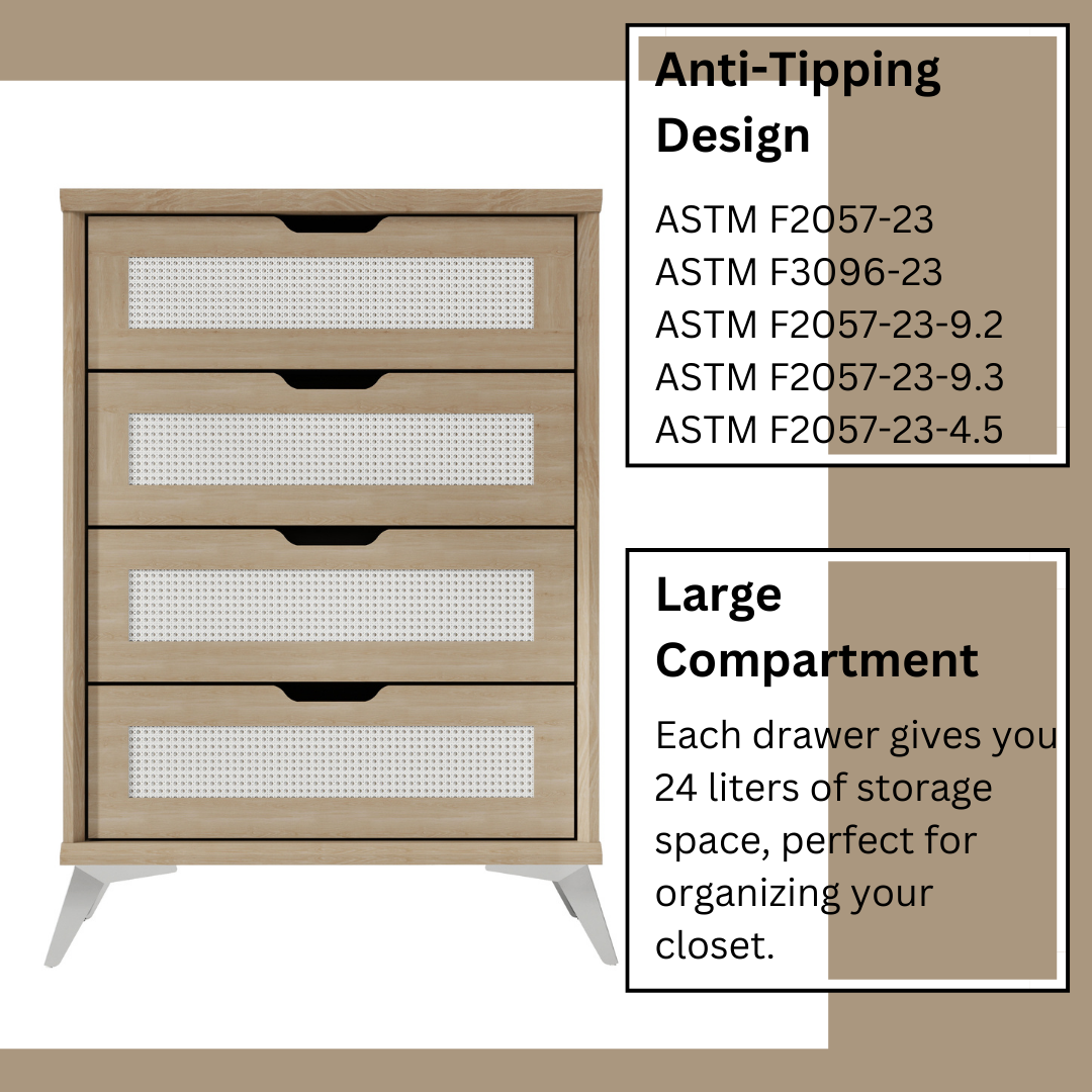 • 1. Safety First: The SecureStance Anti-Tip 4-Drawer Chest prioritizes safety with its anti-tipping feature, providing peace of mind for households with children or pets.
