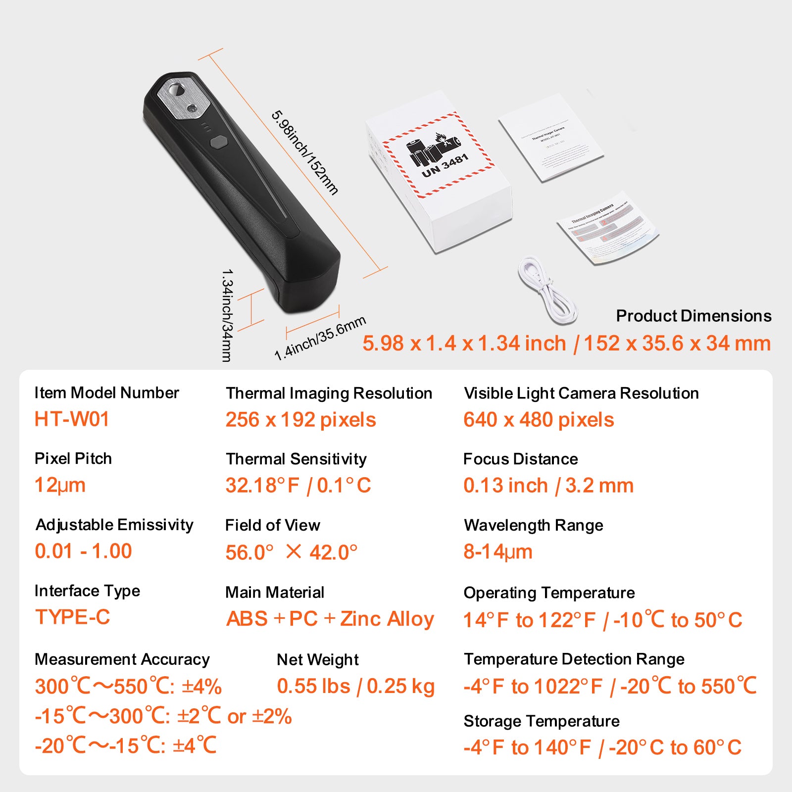 • High-Definition Thermal Imaging: Experience crystal clear imaging with VEVOR thermal camera for Android & IOS, featuring 256 x 192 high IR resolution. It offers -4°F to 1112°F wide temperature range and 32.18°F / 0.1°C thermal sensitivity, allowing for precise temperature measurement and capturing even the subtlest temperature variations.