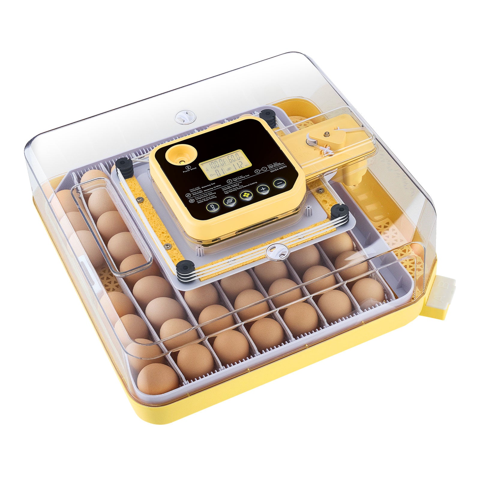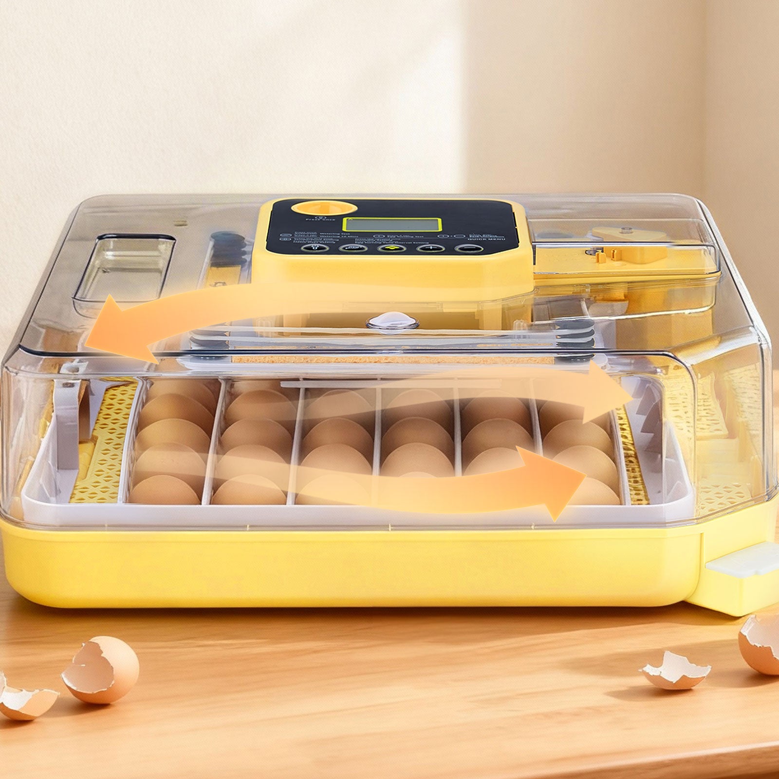 • Digital Display & Precise Control: Our incubator for hatching eggs features an accurate digital display of temperature and humidity, with a 68-104°F range and a humidity range of 20-75%. Its 360° air circulation evenly distributes temp-humidity