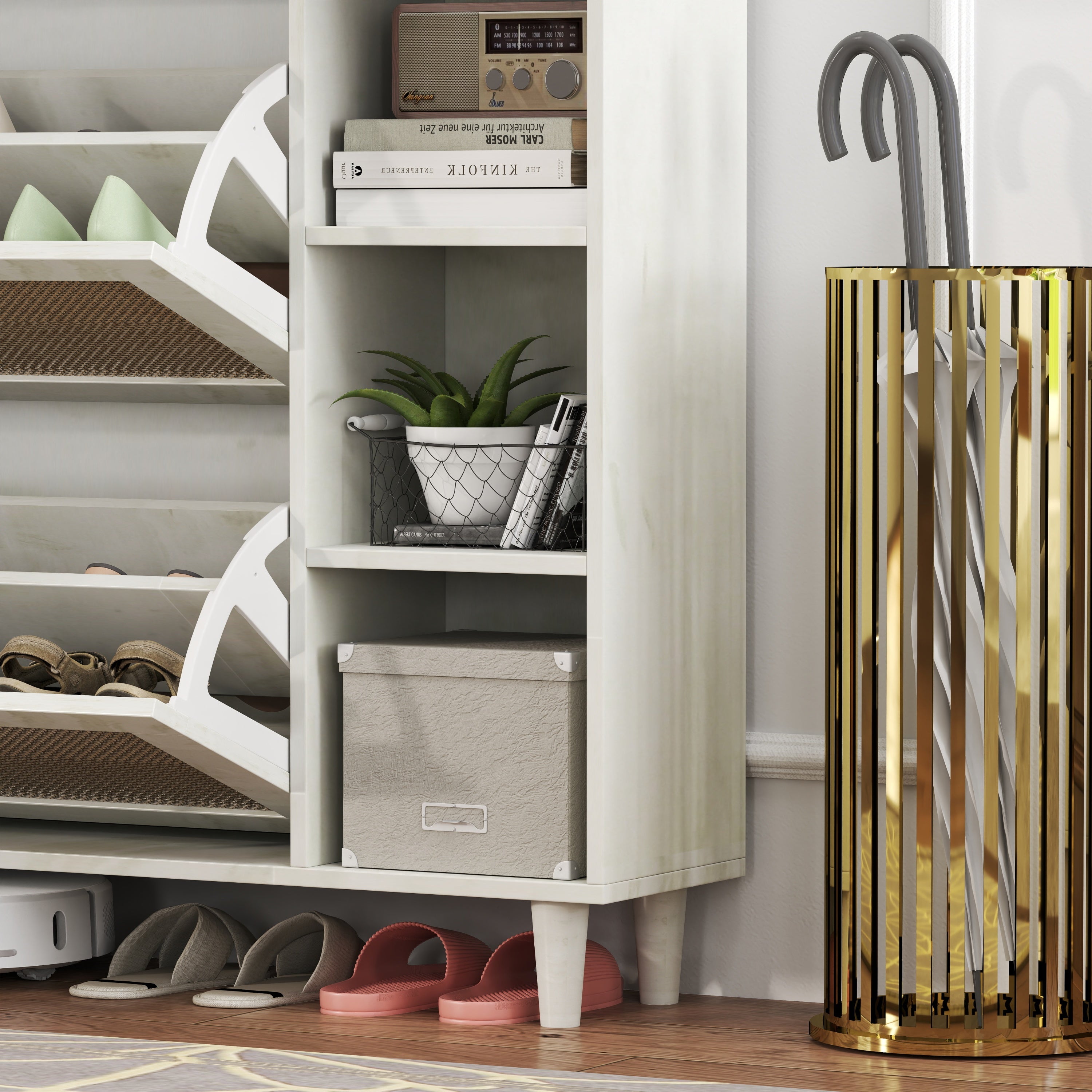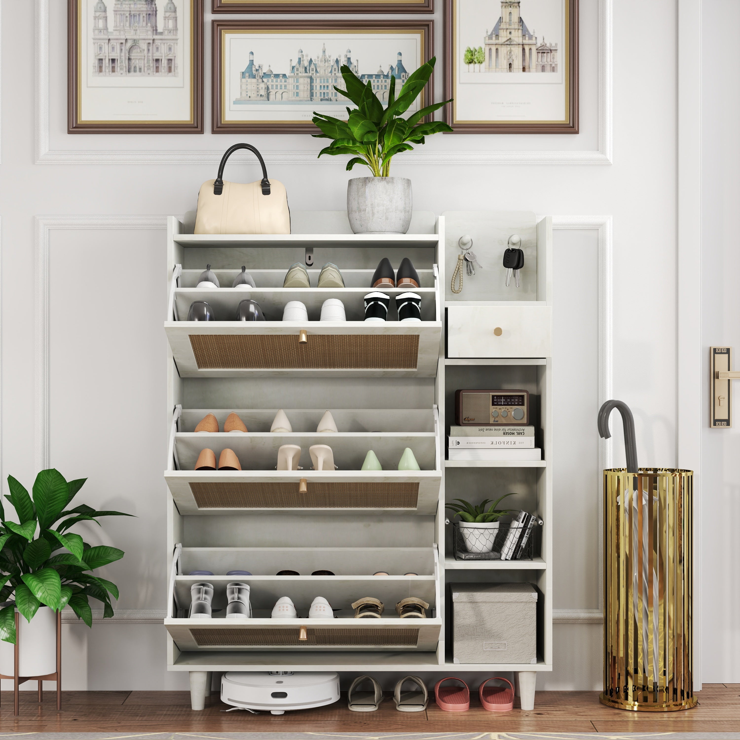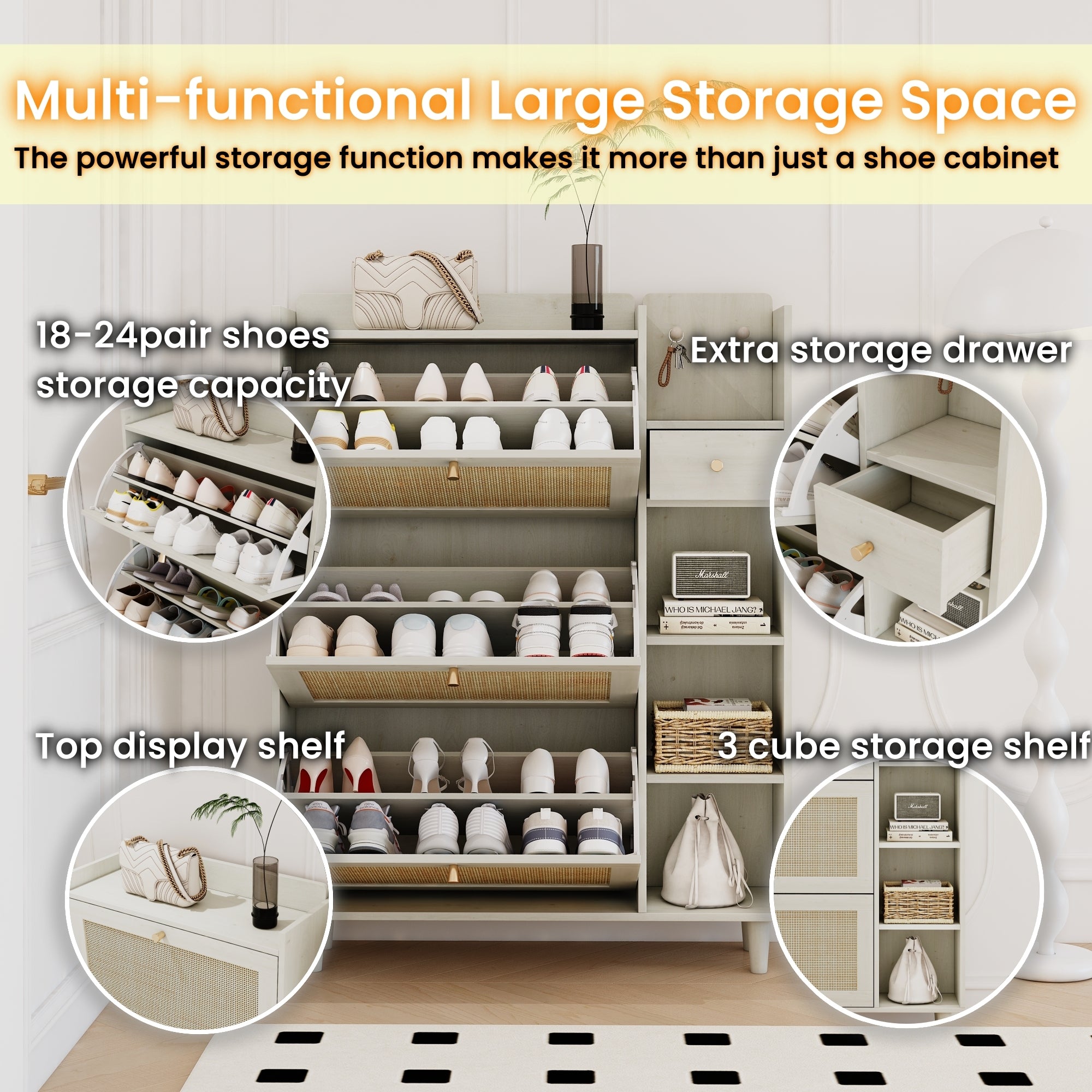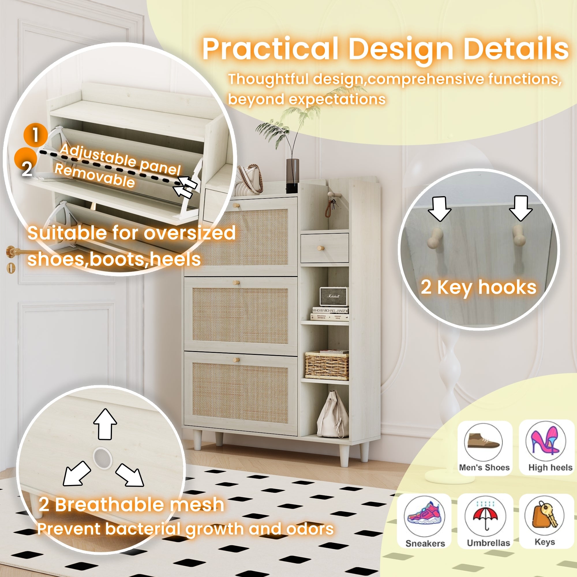 Natural Bohemia Style Shoe Cabinet, Shoe Rack Cabinet with 3 Rattan Flip Drawers, 3 Square Shelves, 1 Storage Drawer, Multi-Storage Space and Hooks for Hallway, Entryway, White