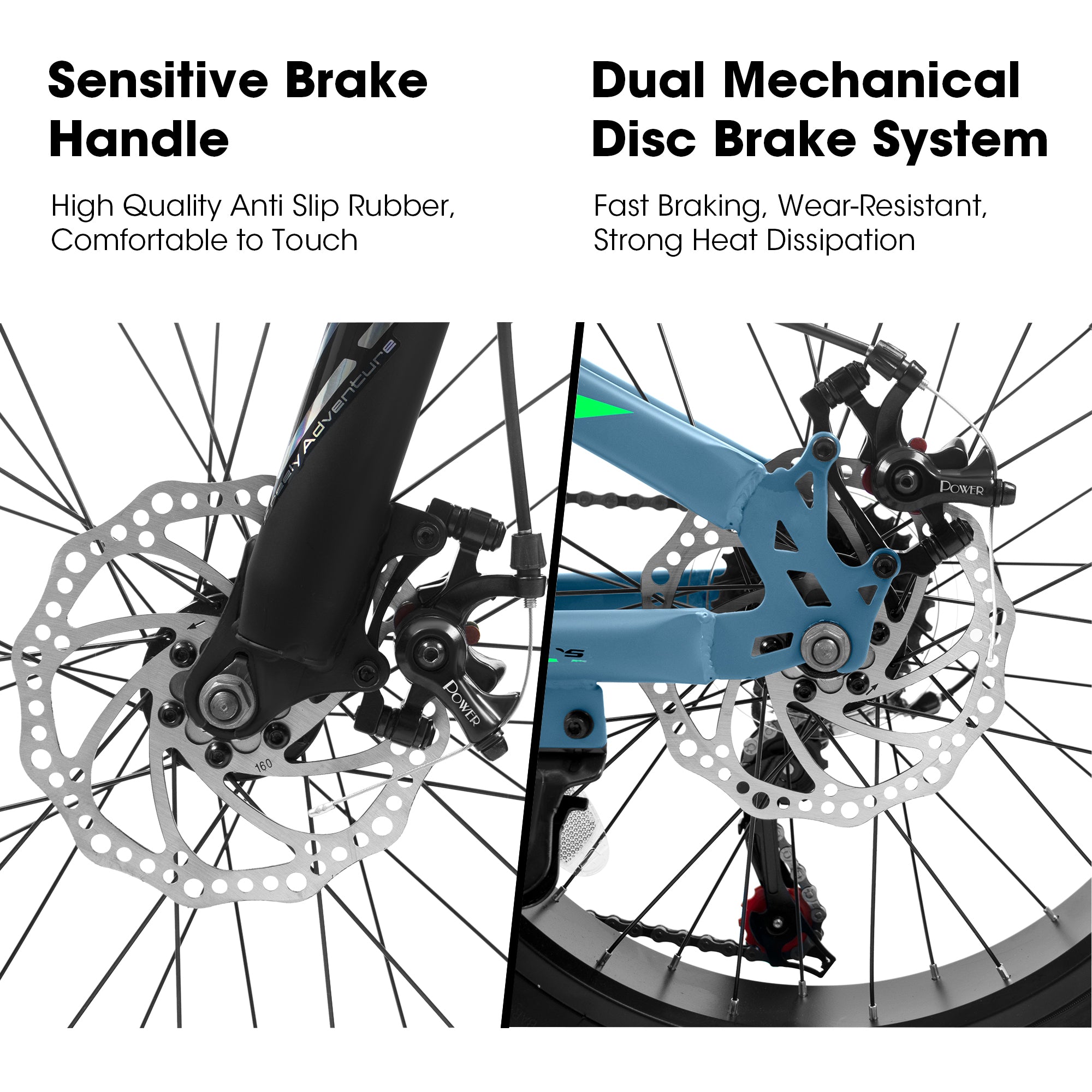 - [Double Disc Double Safety]- Elecony boys and girls fat tire bikes feature a dual disc brake system. Both front and rear are equipped with mechanical disc brakes, which can greatly reduce the braking distance and ensure that the child can stop immediately in case of emergency.