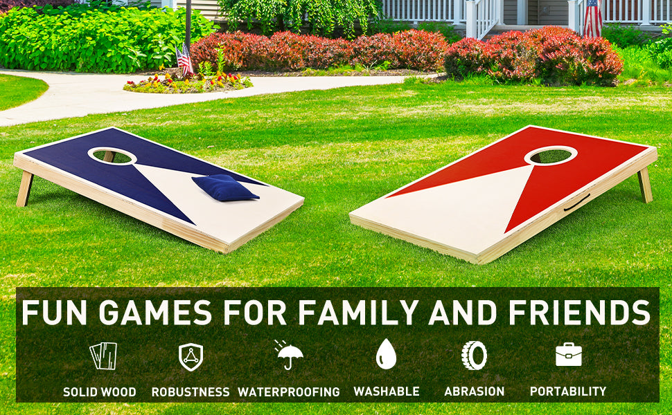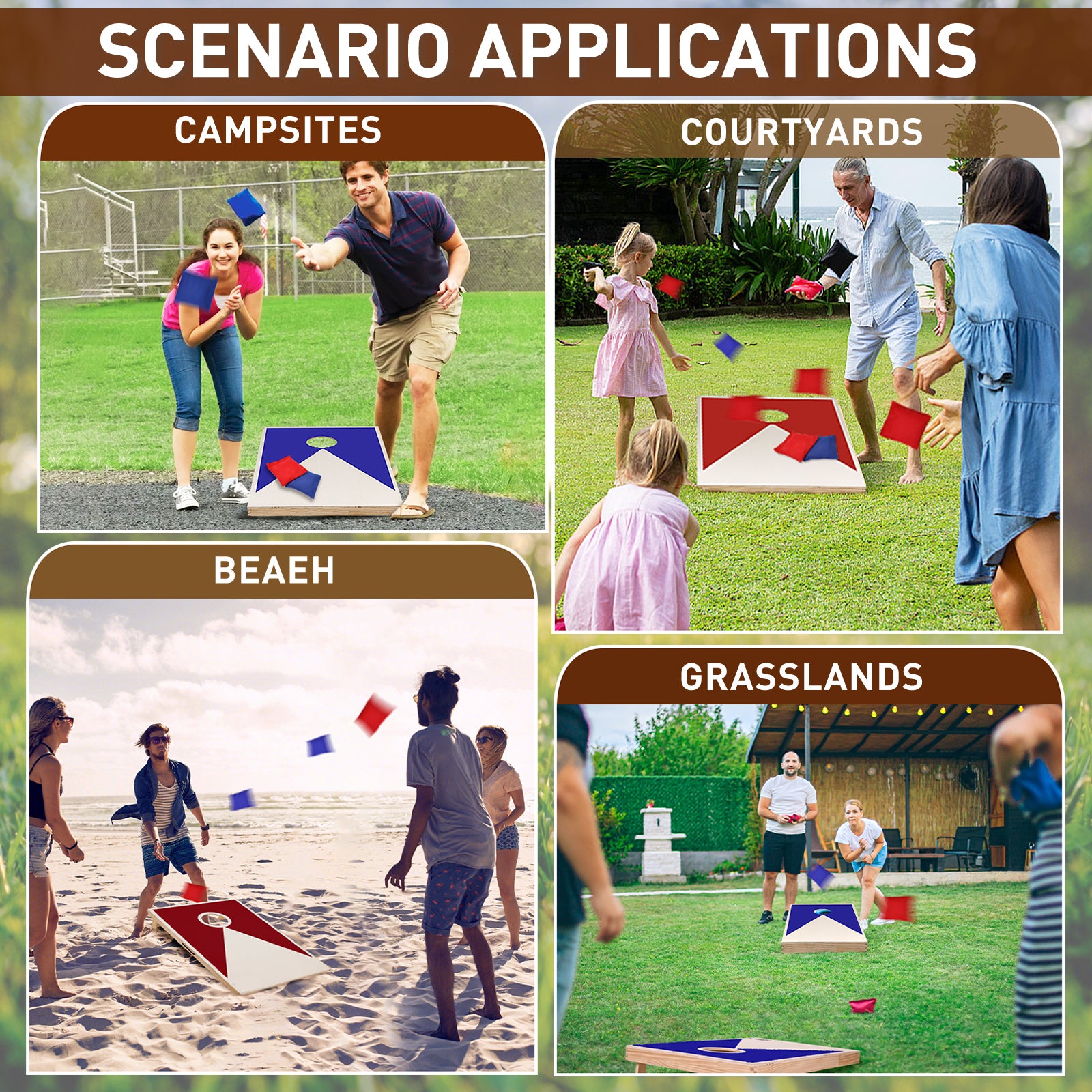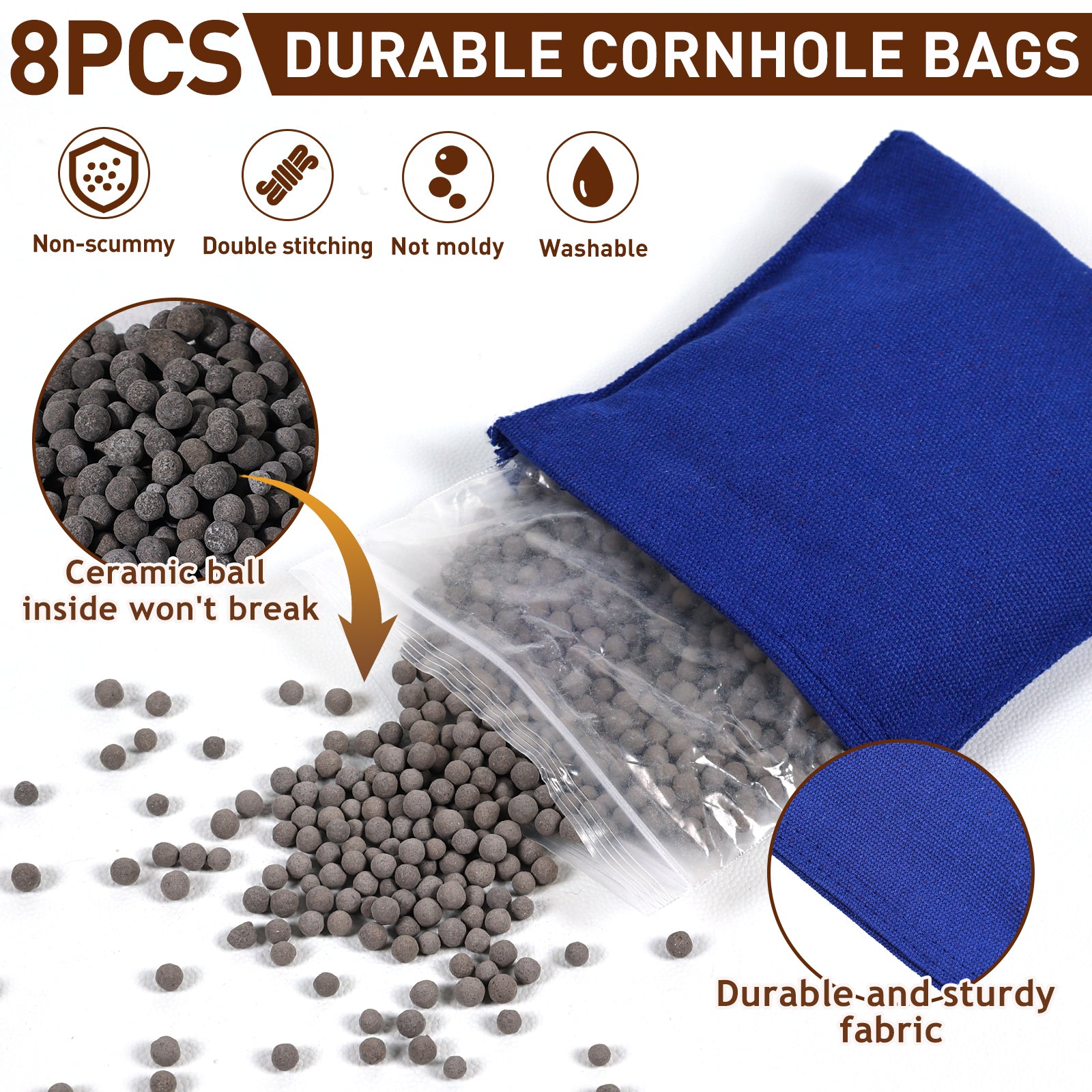 • ALL-WEATHER BEAN BAGS: Includes 8 premium regulation size bean bags (4 red + 4 blue, no logos),filled with clay particles, no mold, no slag