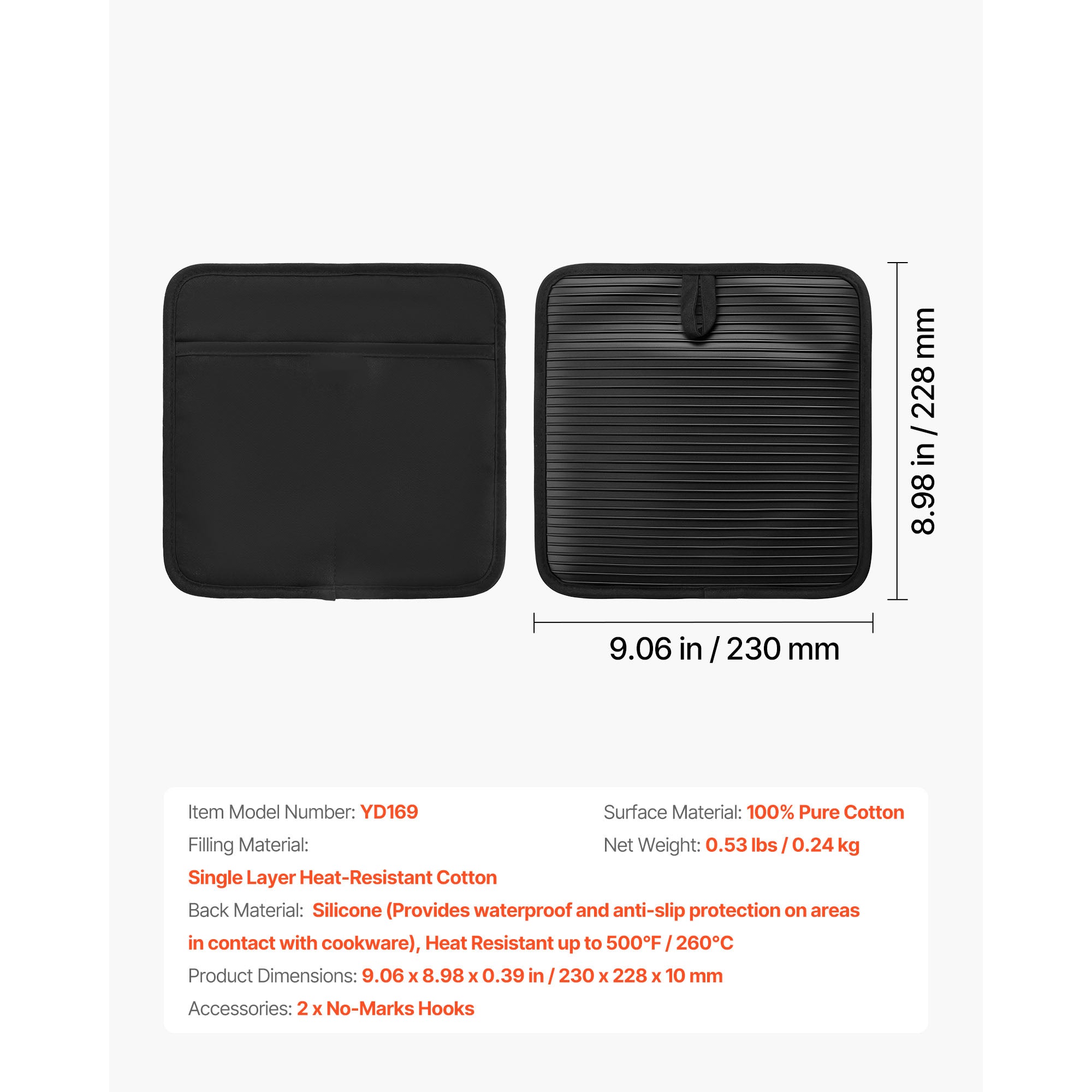 • Slim & Space-Saving: Each pot holder measures 9.06 x 8.98 inch / 230 x 228 mm, with an ultra-thin 0.39 inch / 10 mm design. Comes with two traceless hooks for convenient wall hanging or drawer storage, saving valuable kitchen counter space