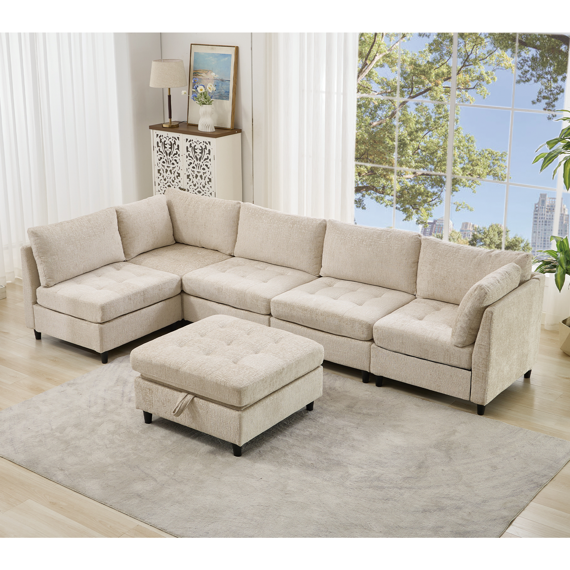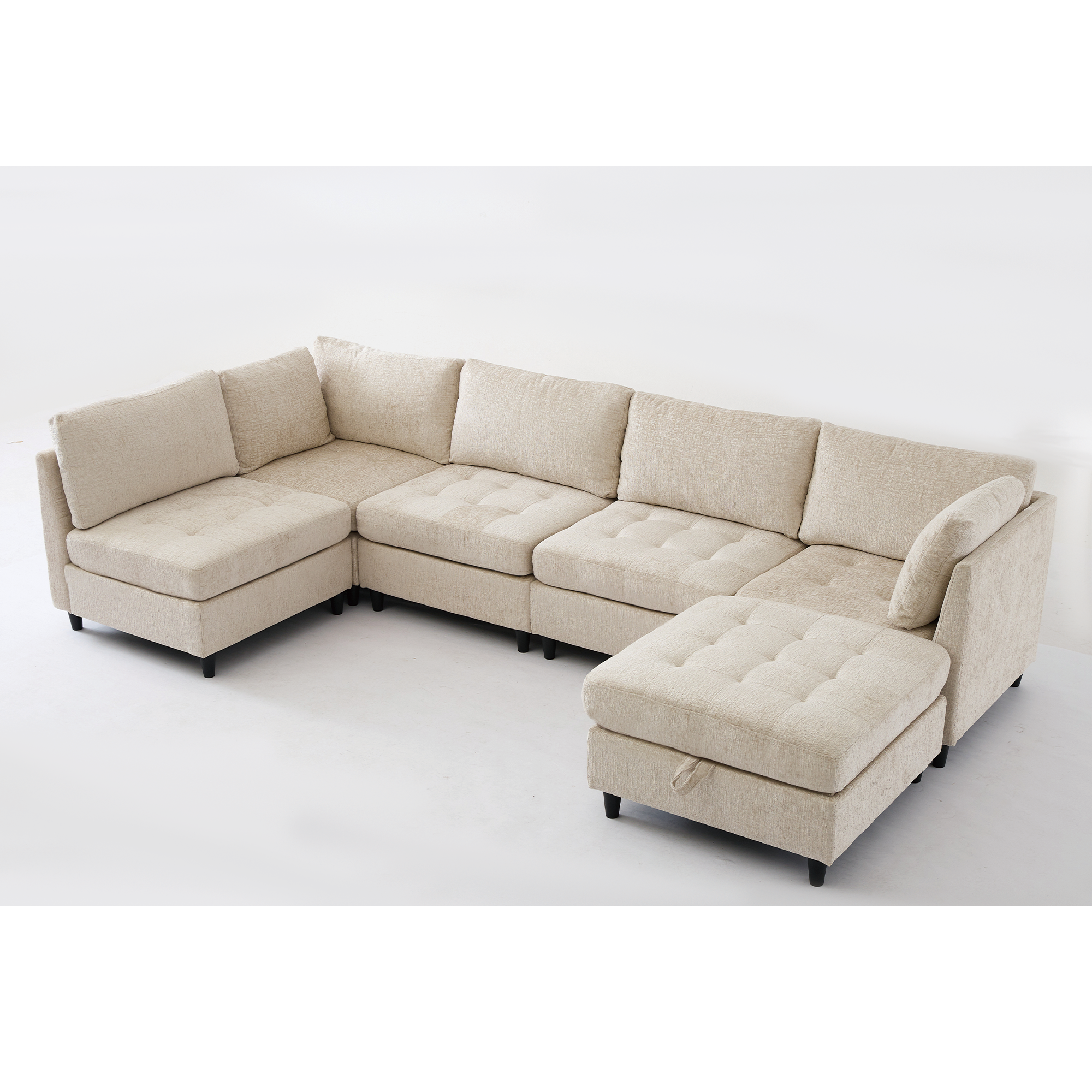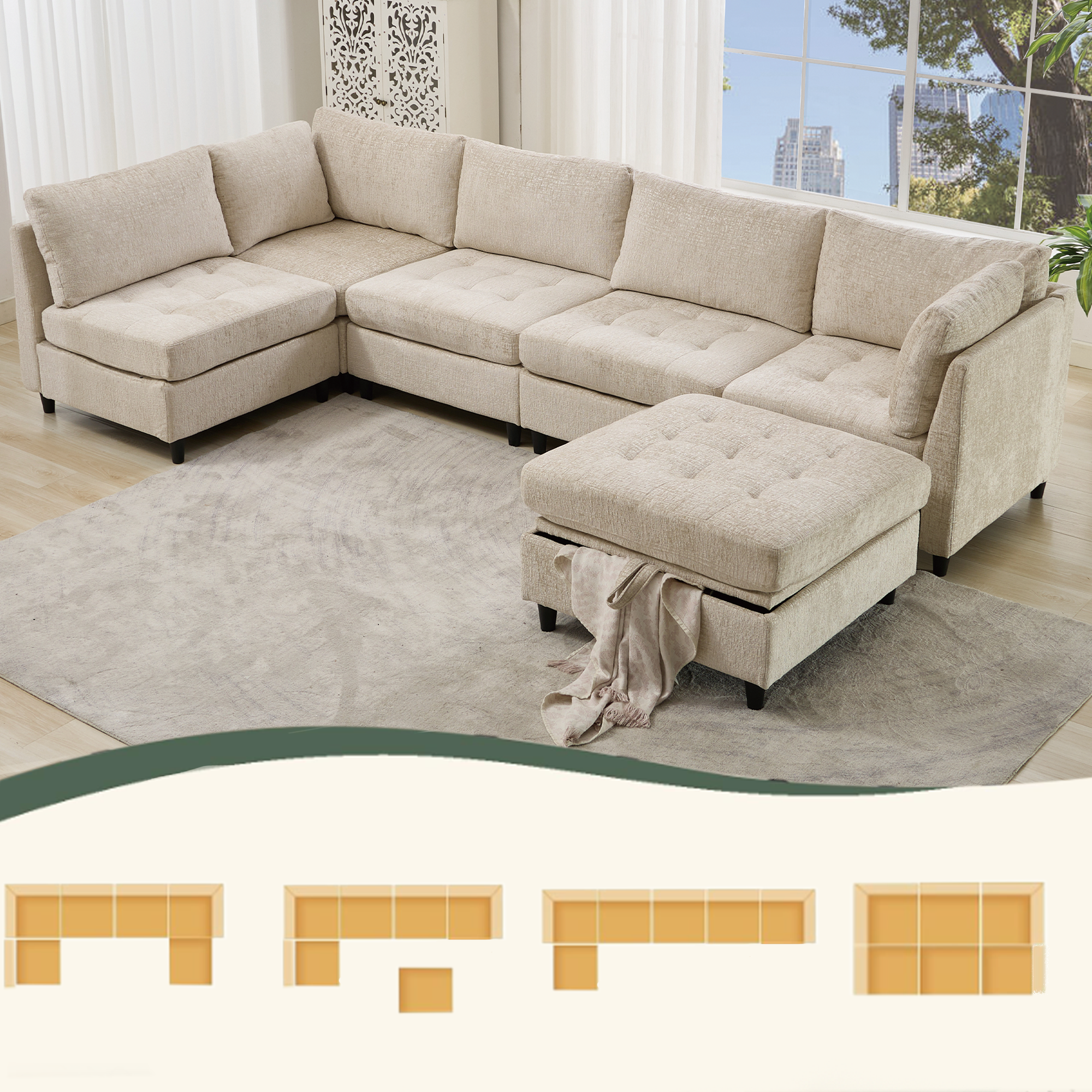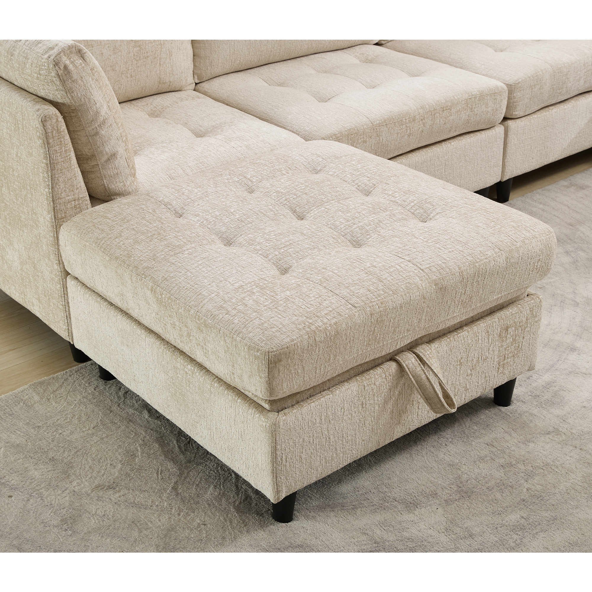 [New Arrival] Modular U-Shaped Sectional Sofa with Storage Ottoman – 6-Seat Convertible Chenille Couch, Beige, Video Provided