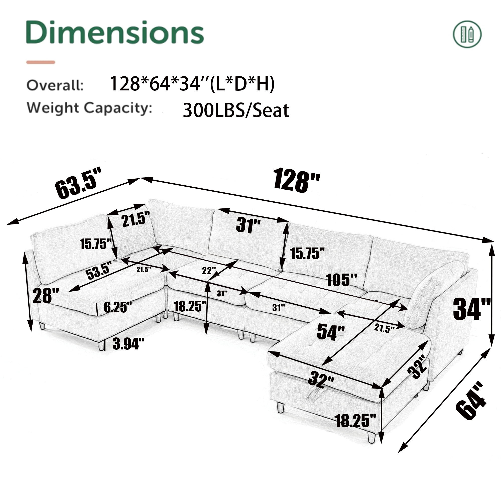 • 【Spacious and Cozy】Sofa size: 128' D x 64' W x 34' H. Weight Capacity: 300 lbs / Seat. This roomy modular sectional sofa is tailored for larger individuals, featuring wider seats that ensure extra comfort. Whether you're binge-watching your favorite shows, diving into a good book, or enjoying conversations with loved ones, its generous design provides plenty of space for relaxation and leisure.