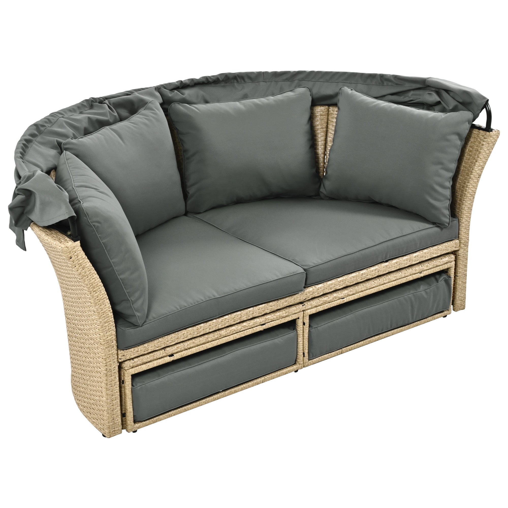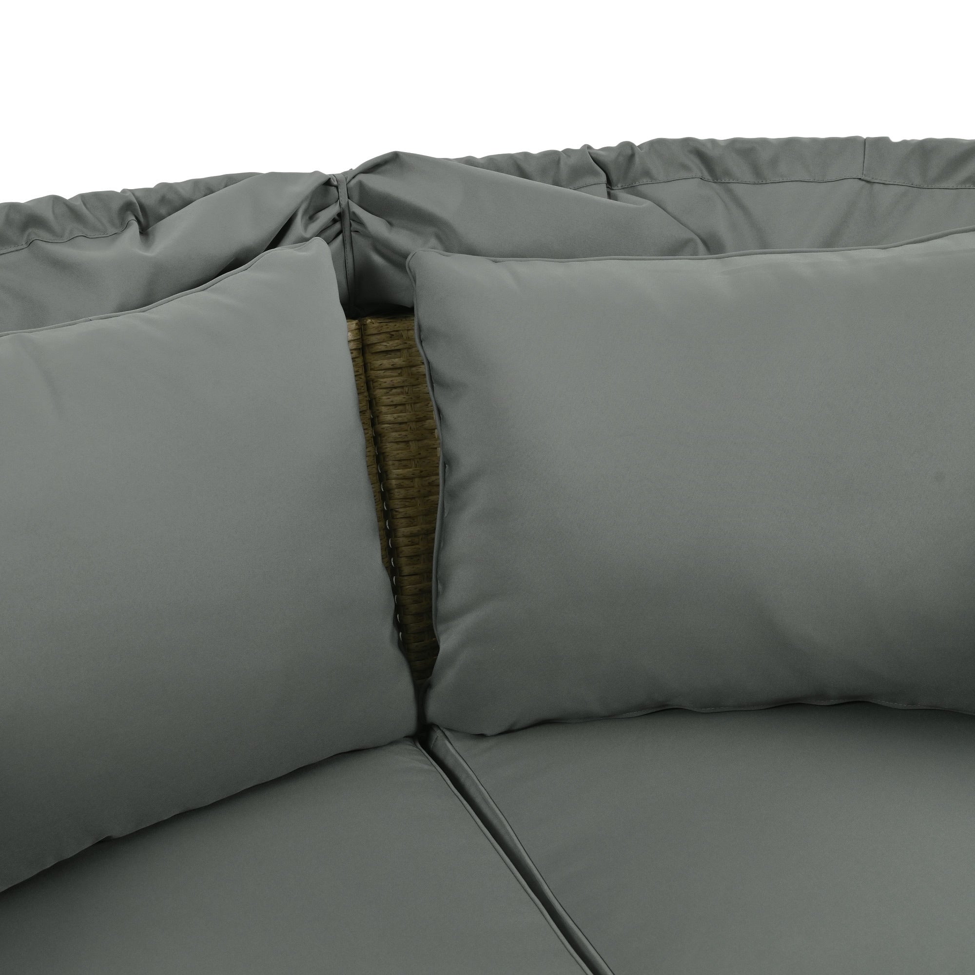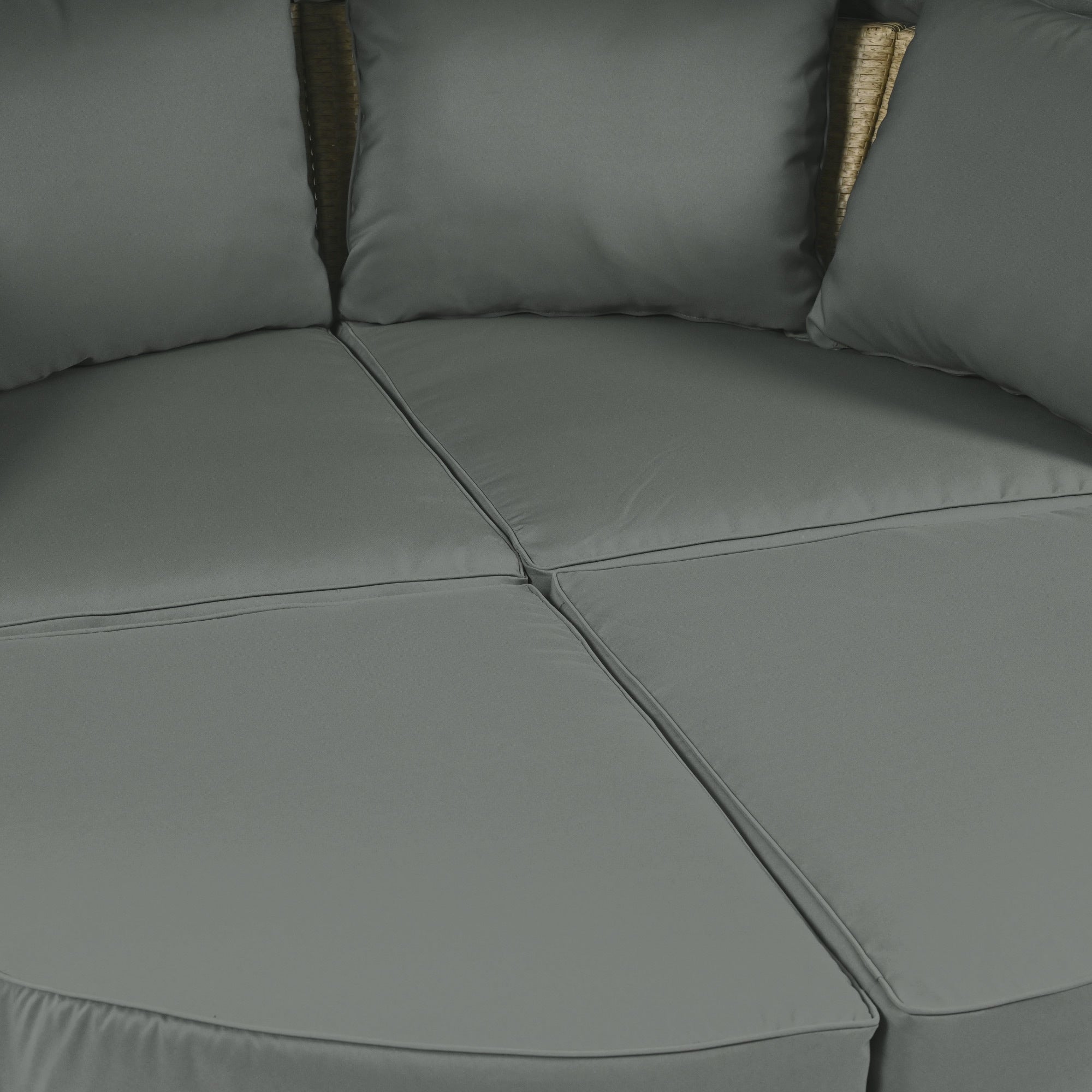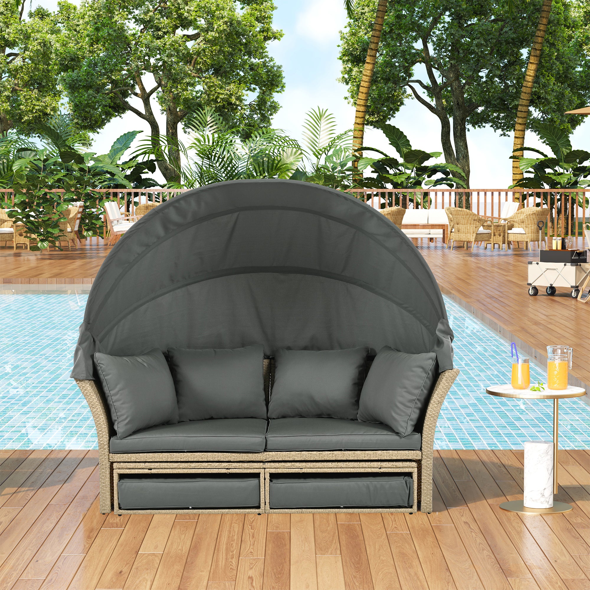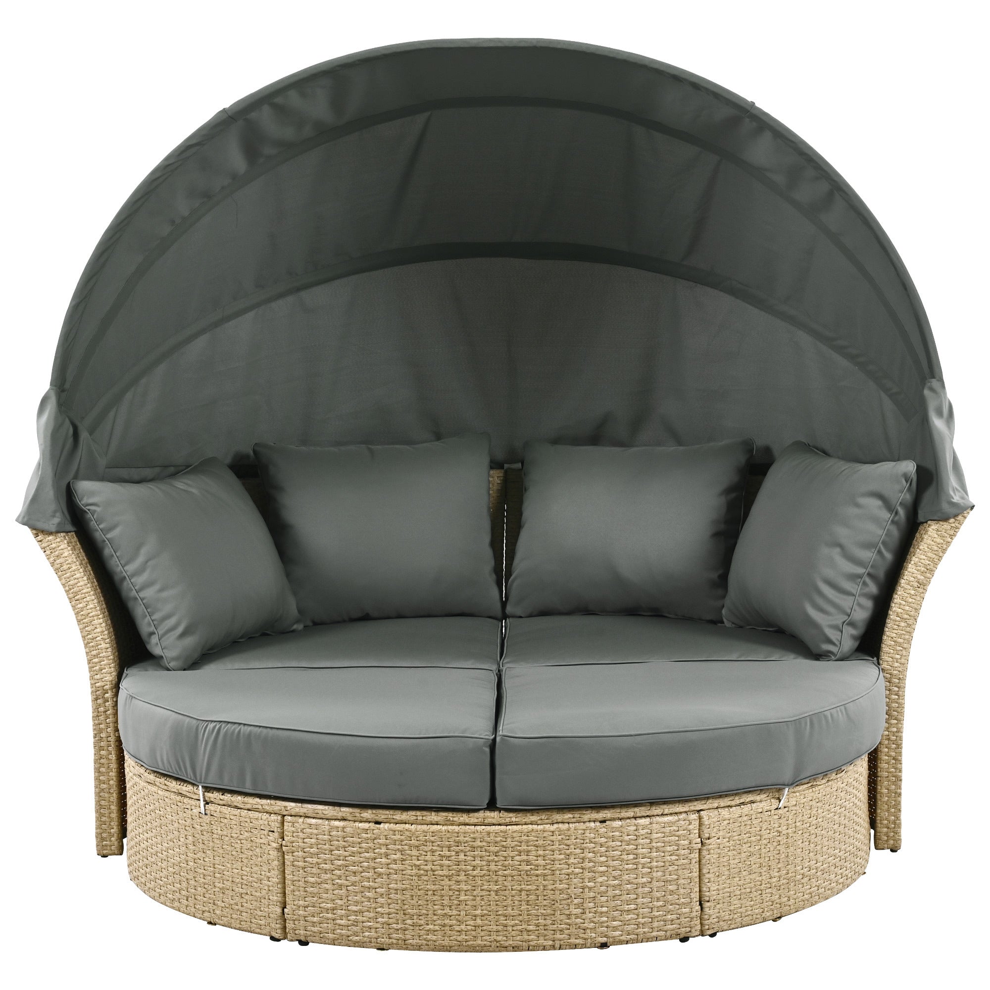 Outdoor Patio Daybed Wicker Rattan Double Daybed Round Sofa Furniture Set with Retractable Canopy, 4 Pillows for Lawn Garden Backyard Porch Pool, Grey