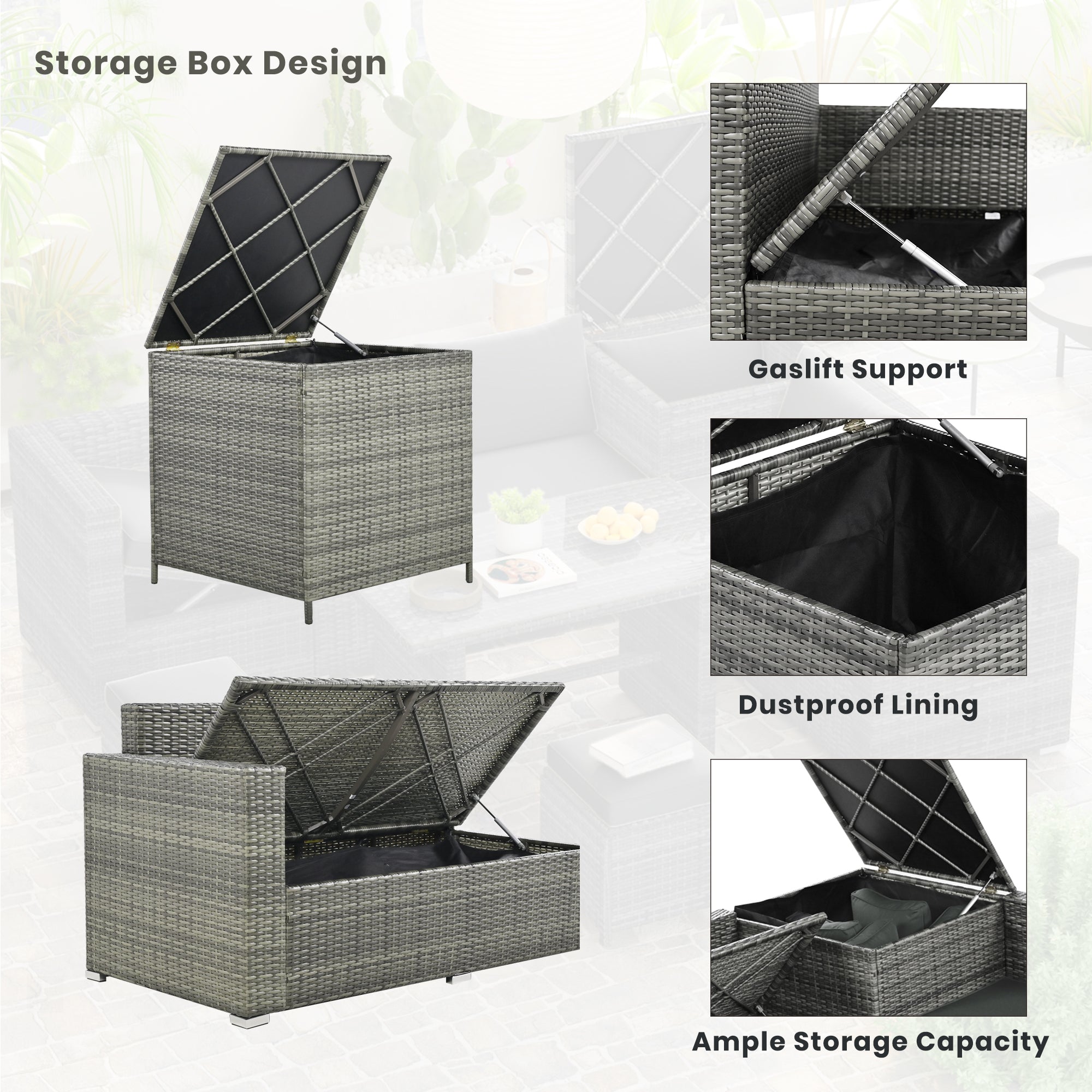 • [Excellent Storage Capacity] This patio rattan sofa set has a number of storage options that make it a great choice for outdoor use.The loveseat sofa features an openable seat that provides ample storage space for cushions and other items, keeping them out of sight and protected from the elements.In addition to the seating options, the set also includes a gas lift storage box that provides even more storage space for outdoor essentials and is perfect for storing larger items.
