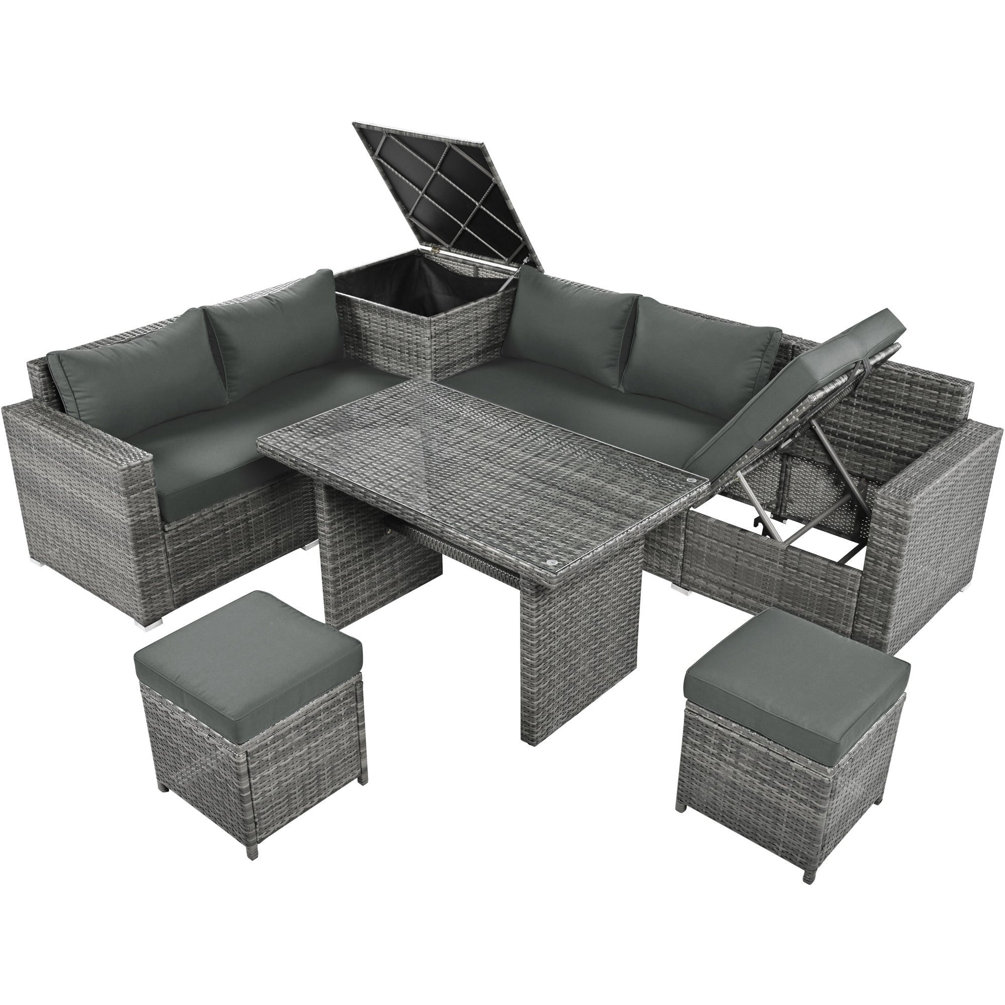 TOPMAX Outdoor 6-Piece All Weather PE Rattan Sofa Set, Garden Patio Wicker Sectional Furniture Set with Adjustable Seat, Storage Box, Removable Covers and Tempered Glass Top Table,Grey
