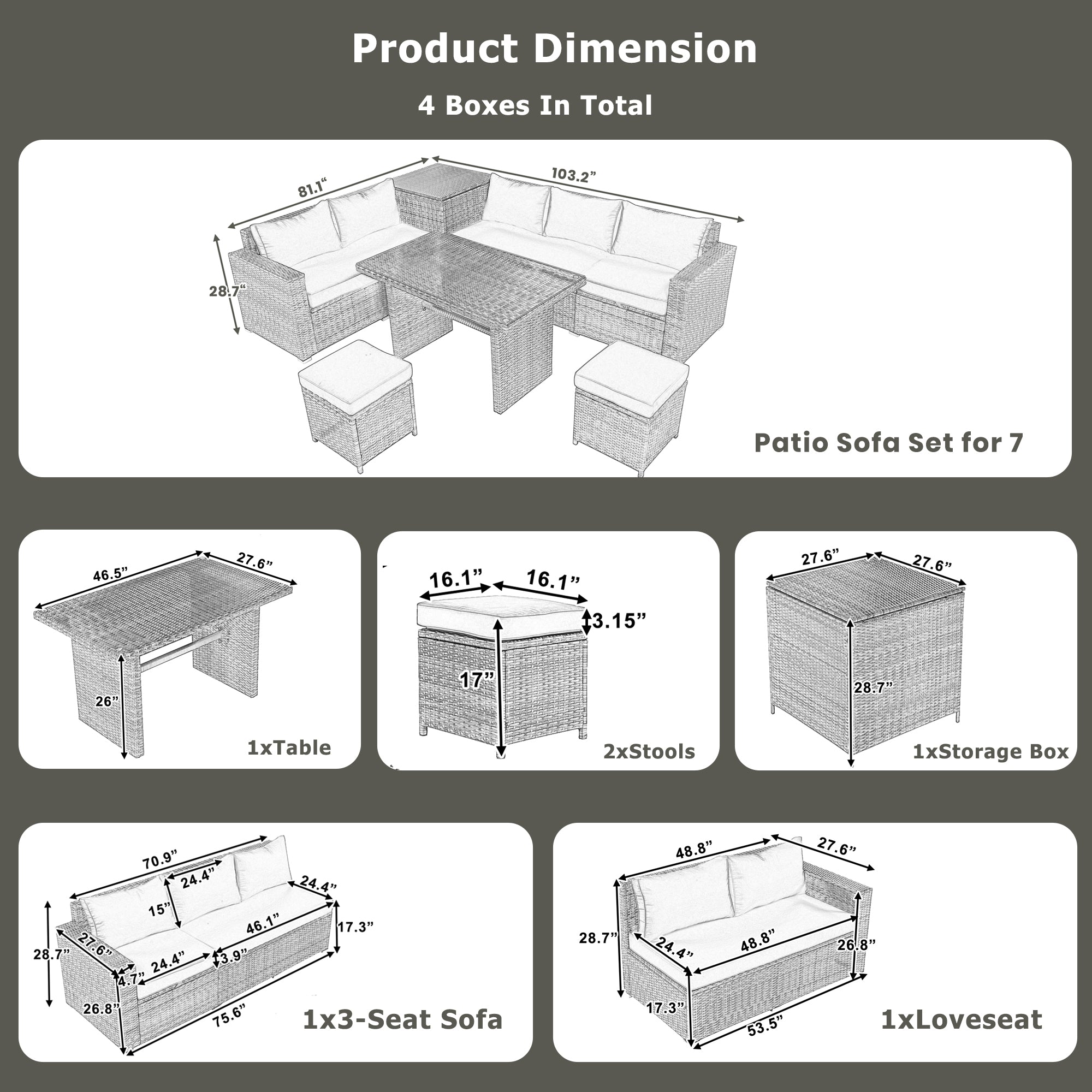 Overall Product Dimension Loveseat:53.5x27.6x28.7in(LXWXH); 3-Seat Sofa: 75.6x27.6x28.7in(LXWXH) Stool:16.1x16.1x17in(LXWXH) Table:46.5x27.6x26in(LXWXH) Storage Box:27.6x27.6x28.7in(LXWXH) Pillow:24.4x15x3.15inch(LXWXT) Loveseat Cushion:48.8x24.4x3.9inch(LXWXT) 3-Seat Sofa Cushion:(24.4+46.1)x24.4x3.9inch(LXWXT) Stool Cushio