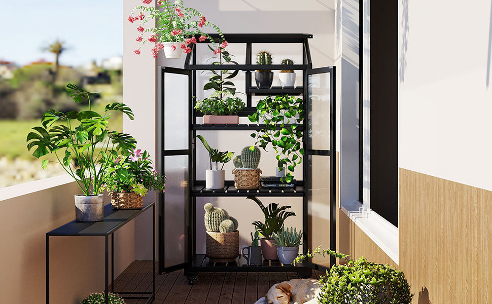 - [Adjustable Flower Organizer] There are 3-tier shelves inside the frame, 2 removable design and 1 half-shelf design. 6 levels in total for different plants height. 5.5inch between each level. The special half-shelf design will be suitable for higher flowers. Openable roof will provide better ventilation by adjusting the screws in different positions.
