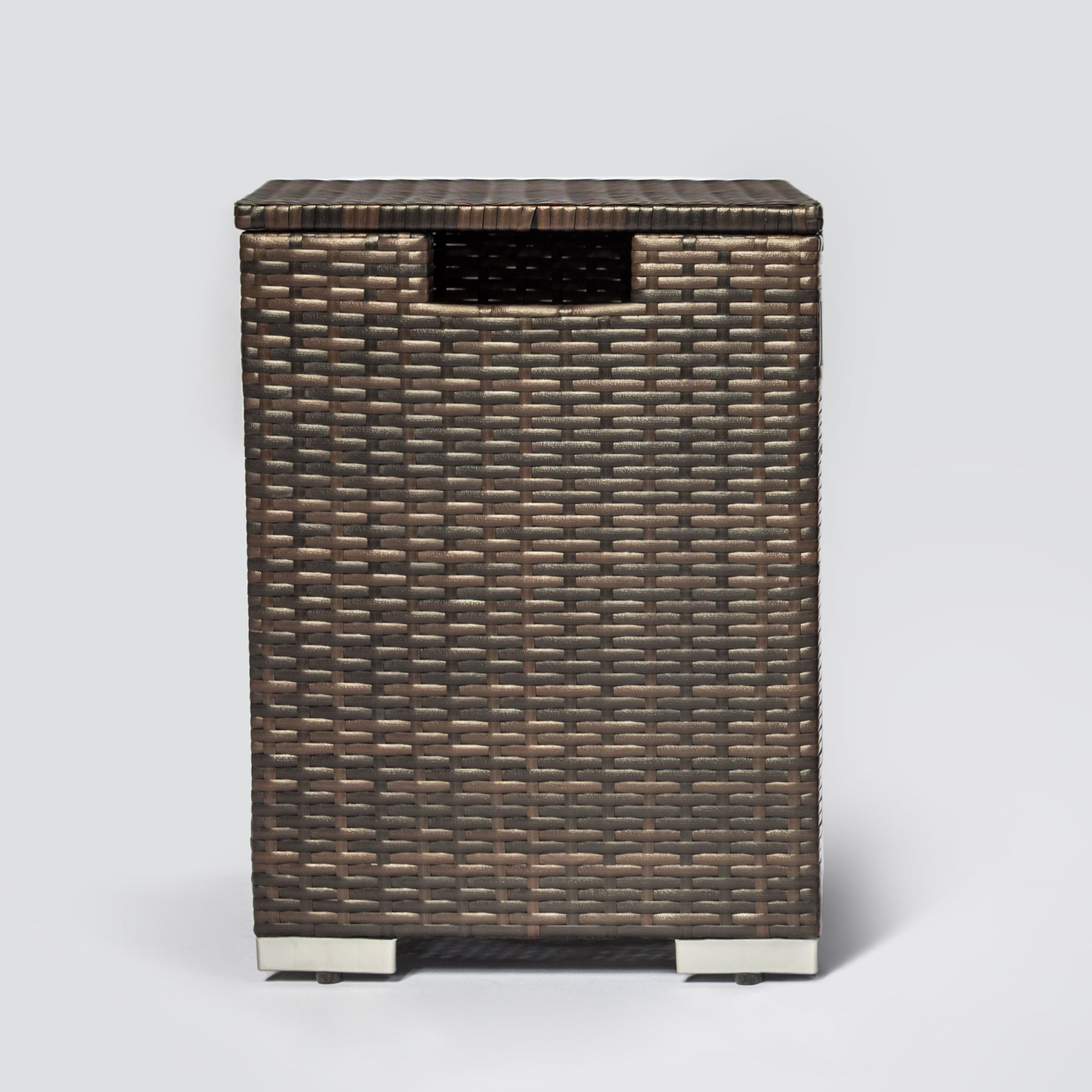 Dark Brown Wicker Body Steel Frame Suit for 20Lbs Propane Tank Marerial: PE Rattan Size: 16 x 16 x 22inch The Propane Tank is NOT Included! The Gas Fire Pit is Not Included!