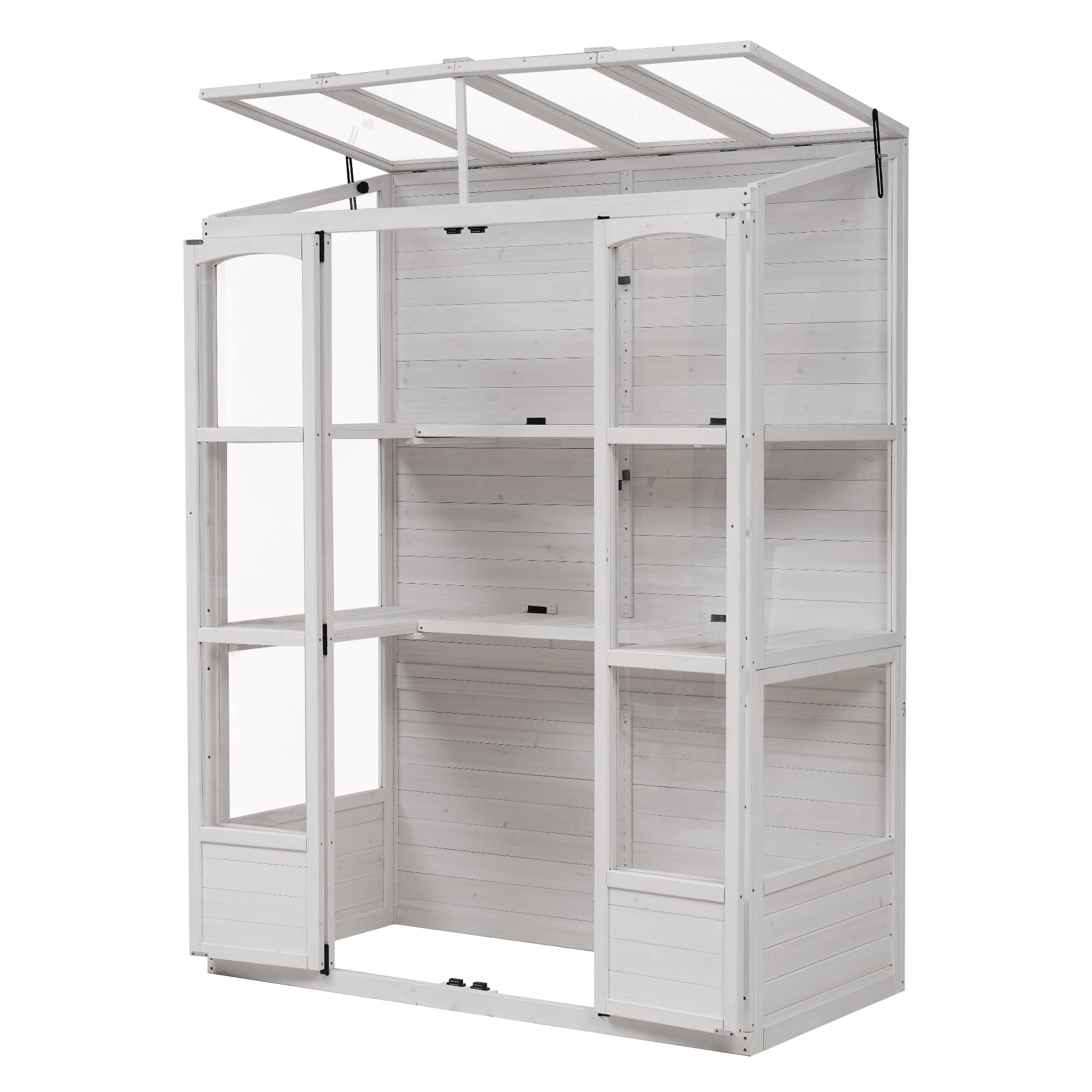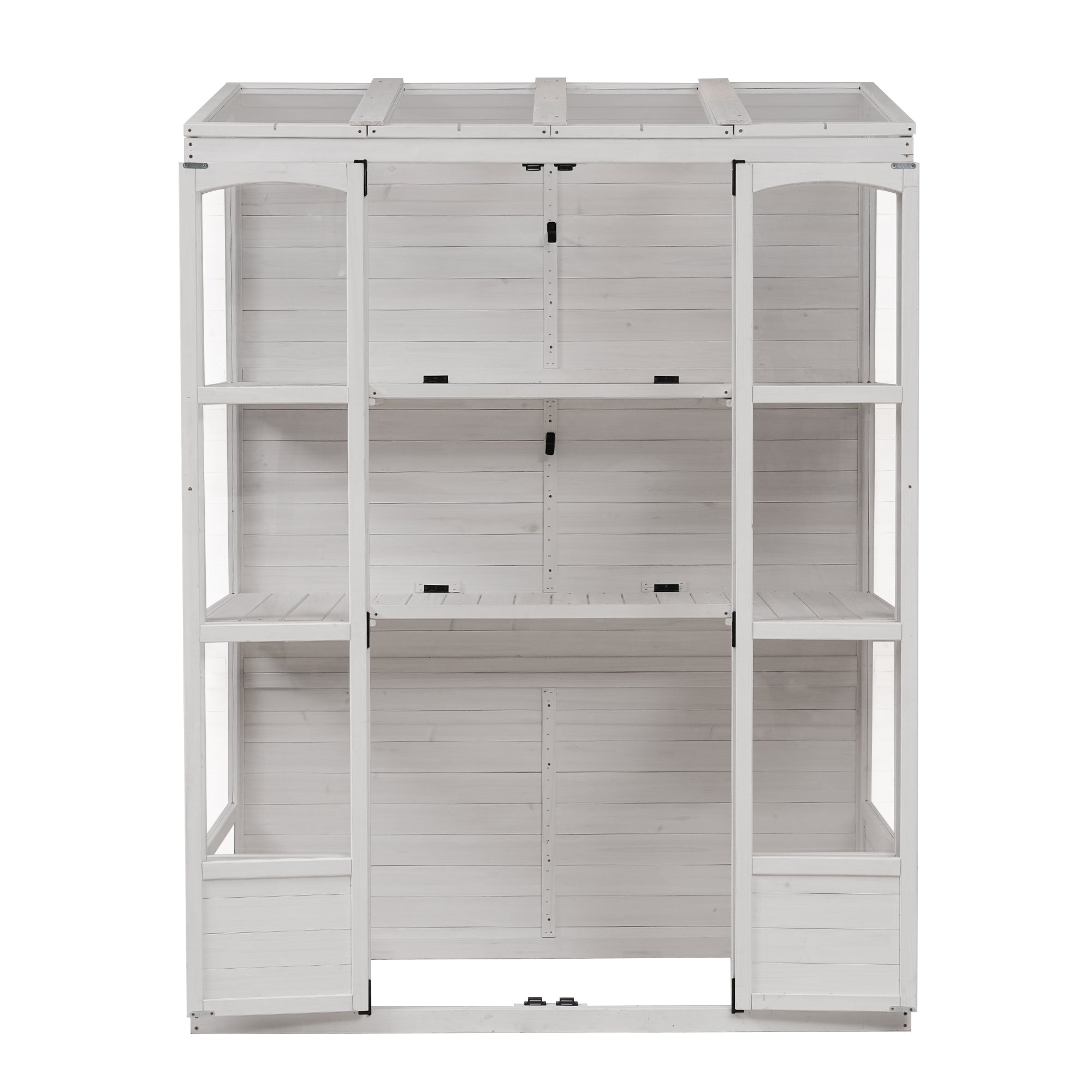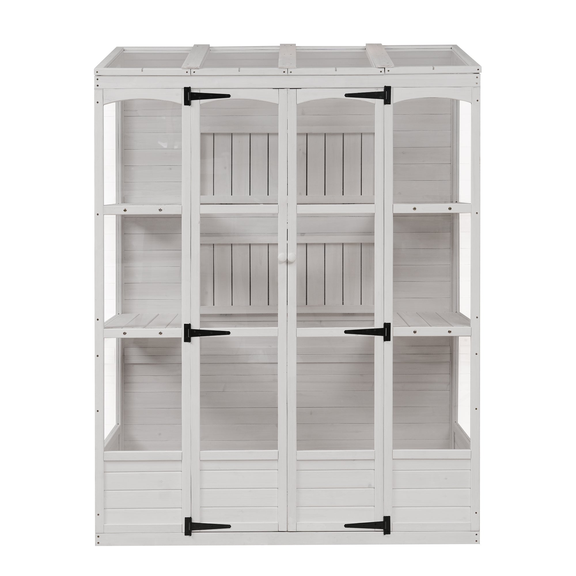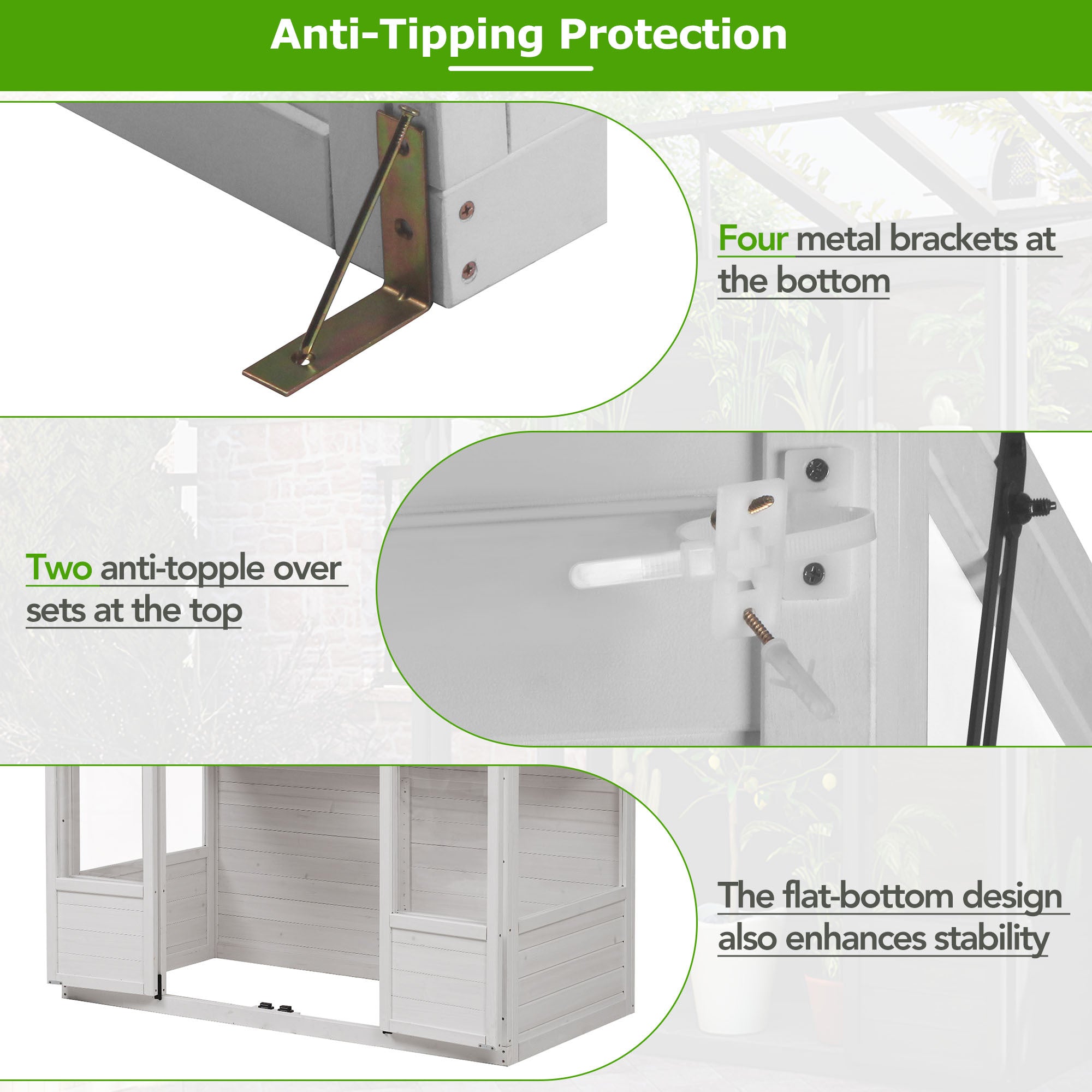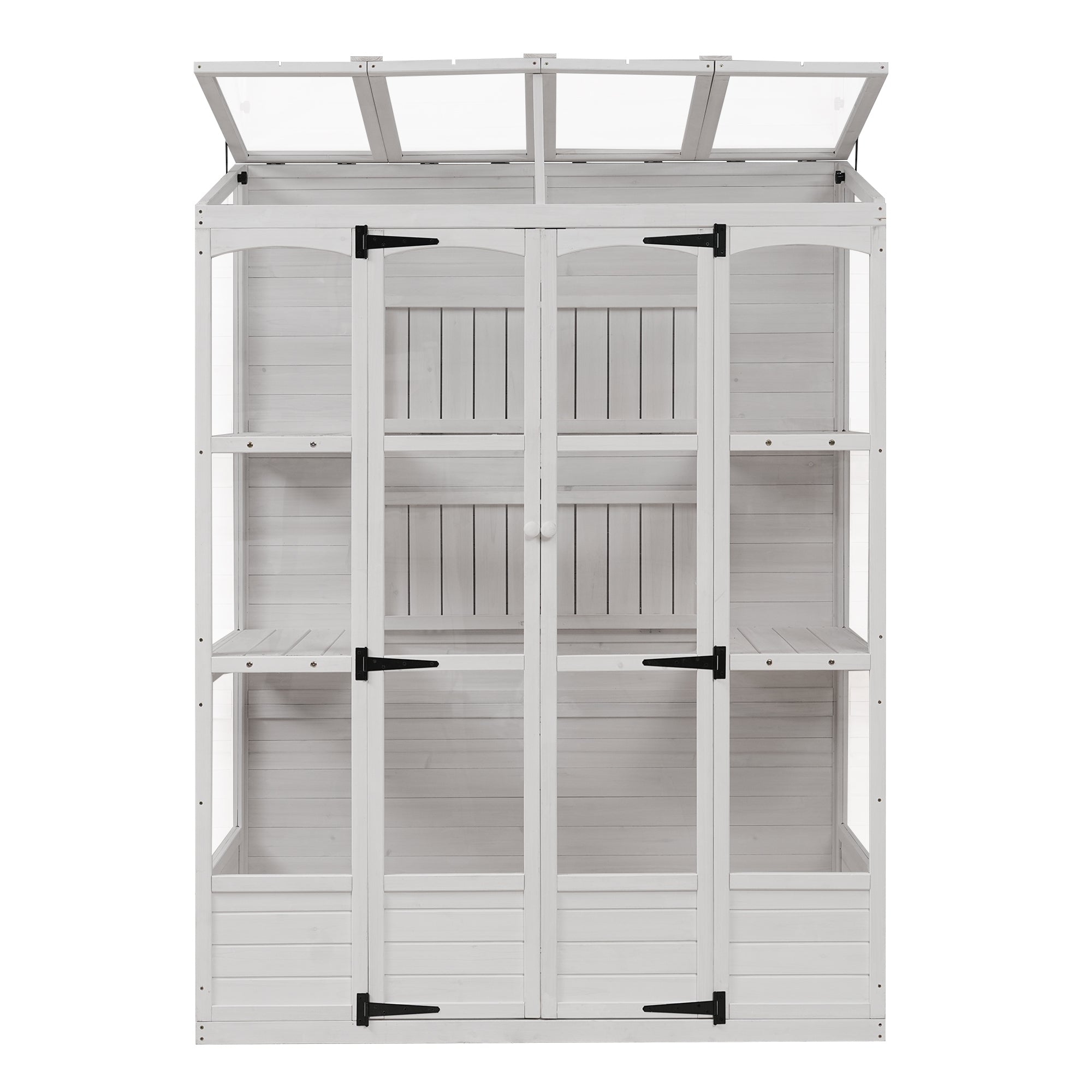 Highlights Made from Fir Wood / 2 Folding Middle Shelves / 78-inch Height / Double-sided Door / 4 Skylights / Anti-fall Devices / Walk-in Greenhouse / Two Colors Available