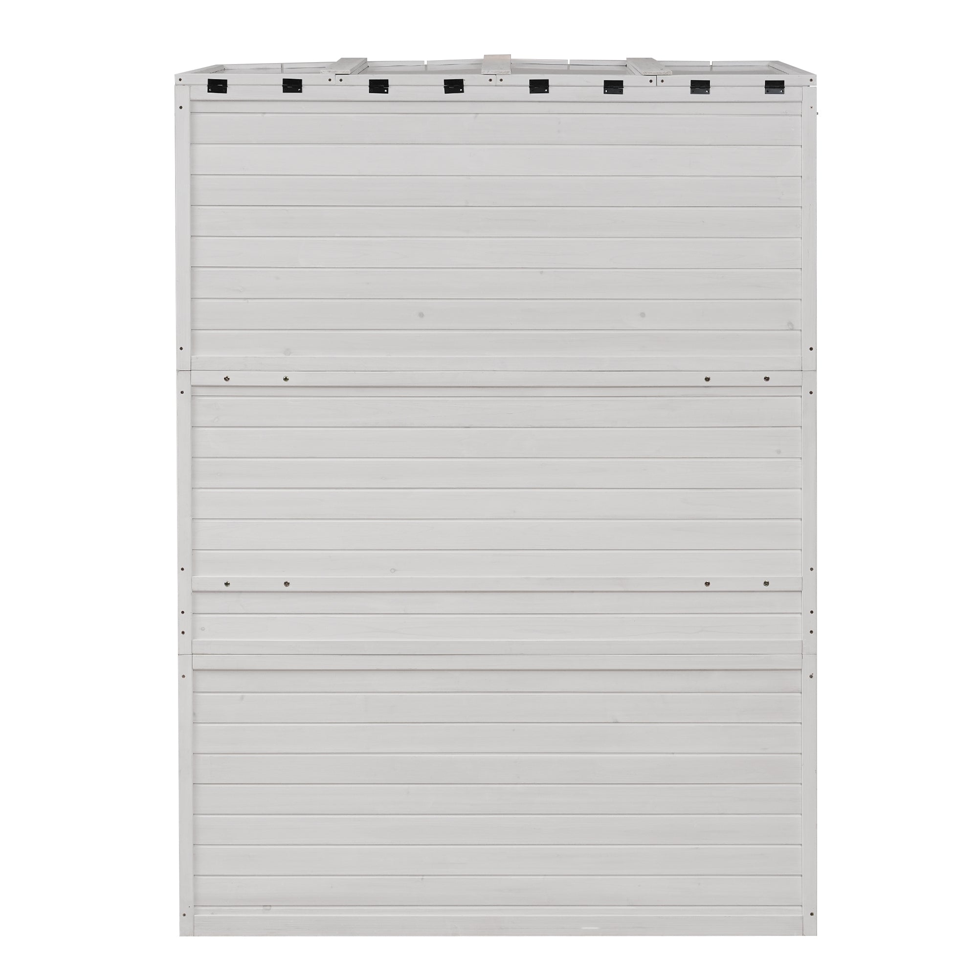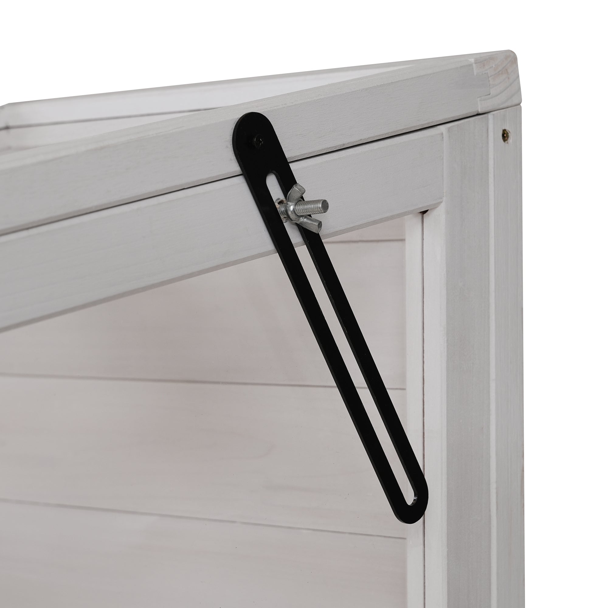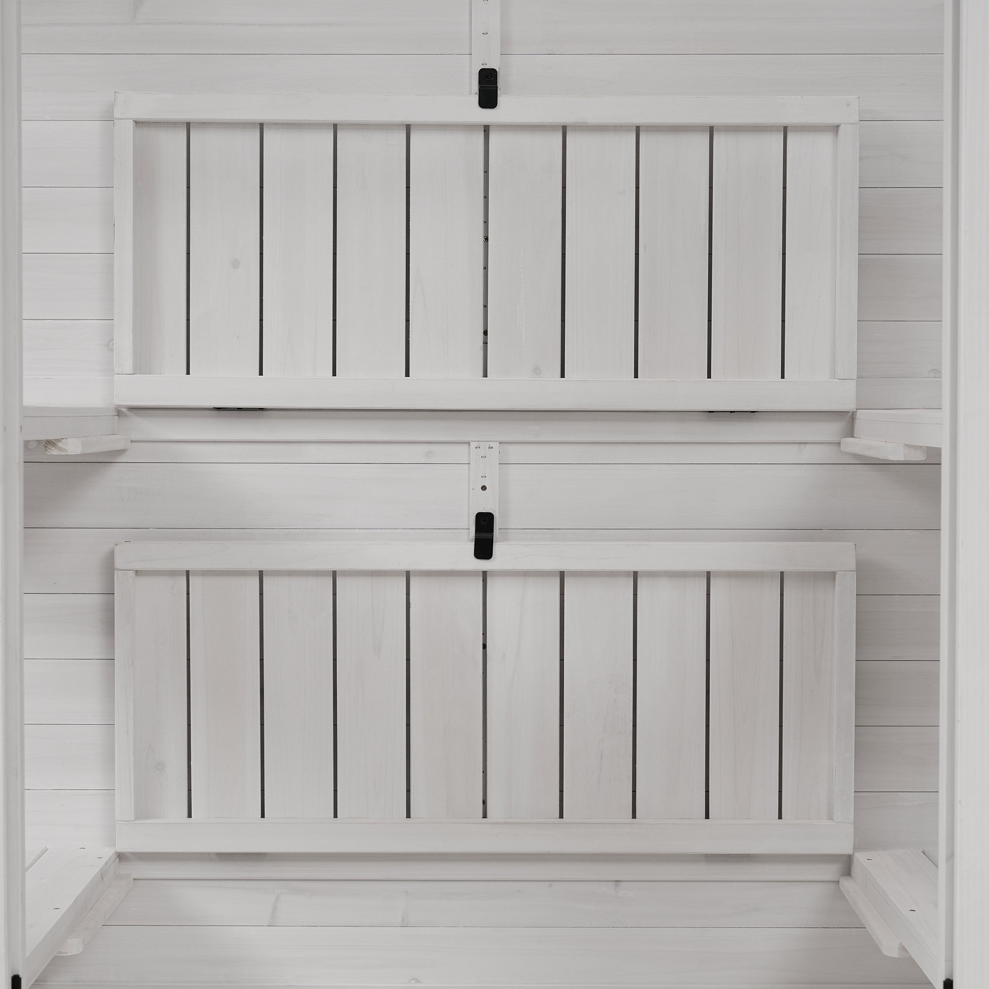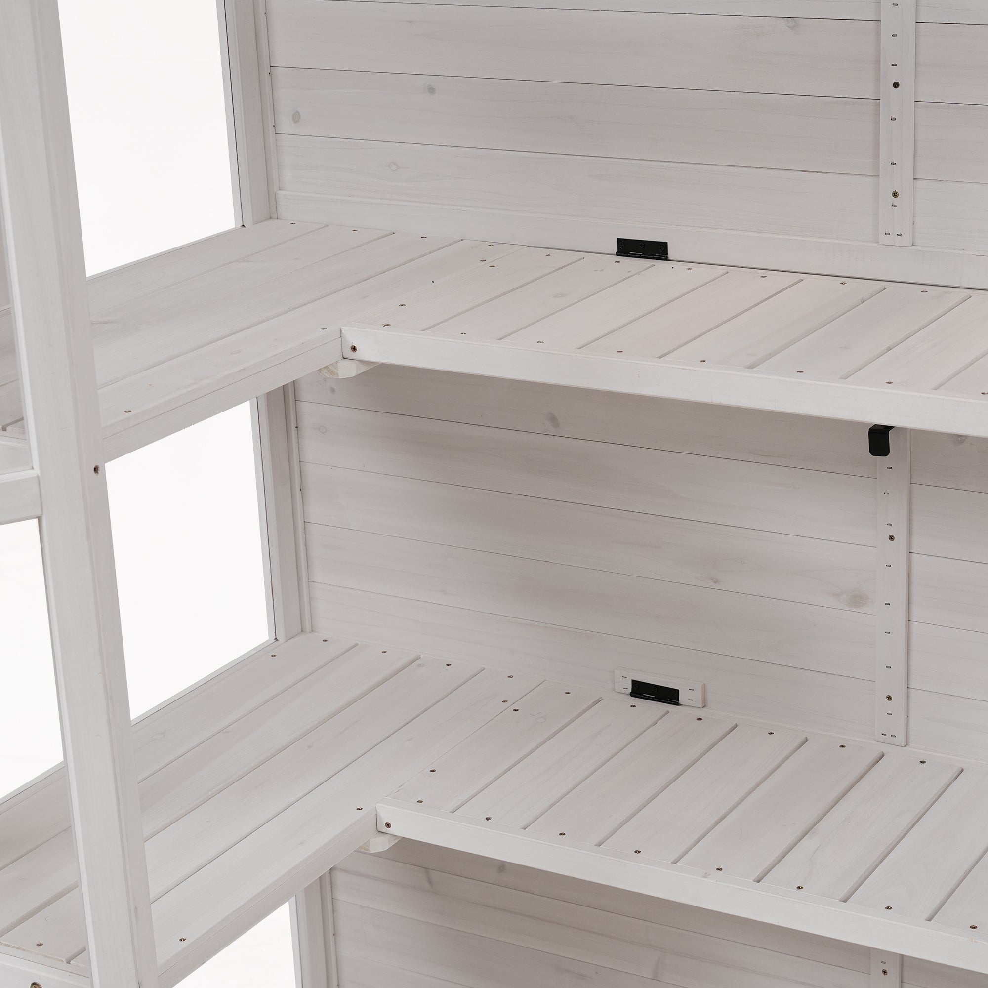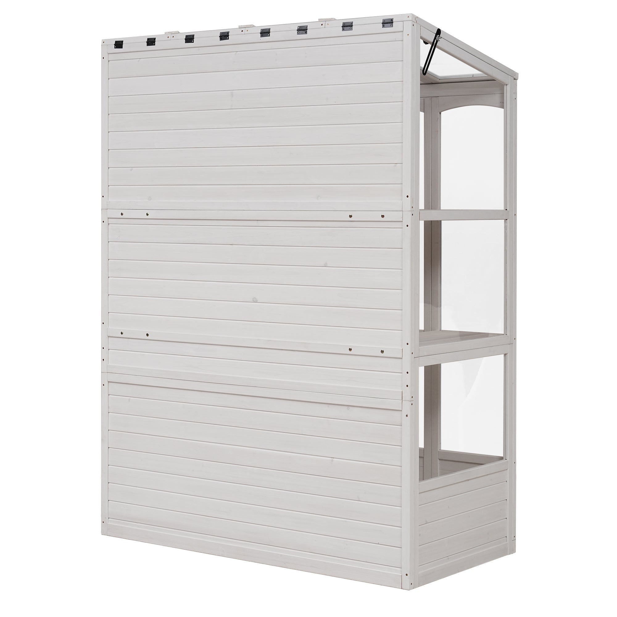 Highlights Made from Fir Wood / 2 Folding Middle Shelves / 78-inch Height / Double-sided Door / 4 Skylights / Anti-fall Devices / Walk-in Greenhouse / Two Colors Available