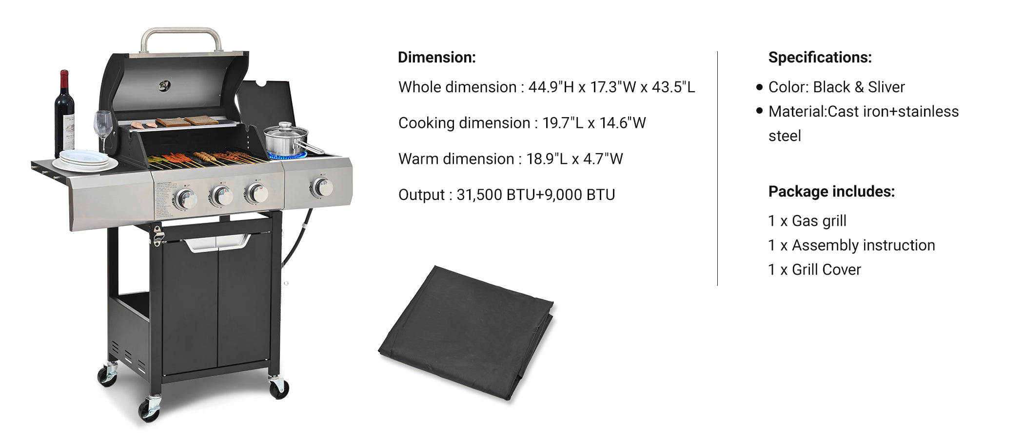 • High-powered Burners: This stainless steel gas grill has 3 main burners (10,500 BTU each) and a side burner (9,000 BTU). 4 burners deliver a total of 40,500 BTU cooking power.