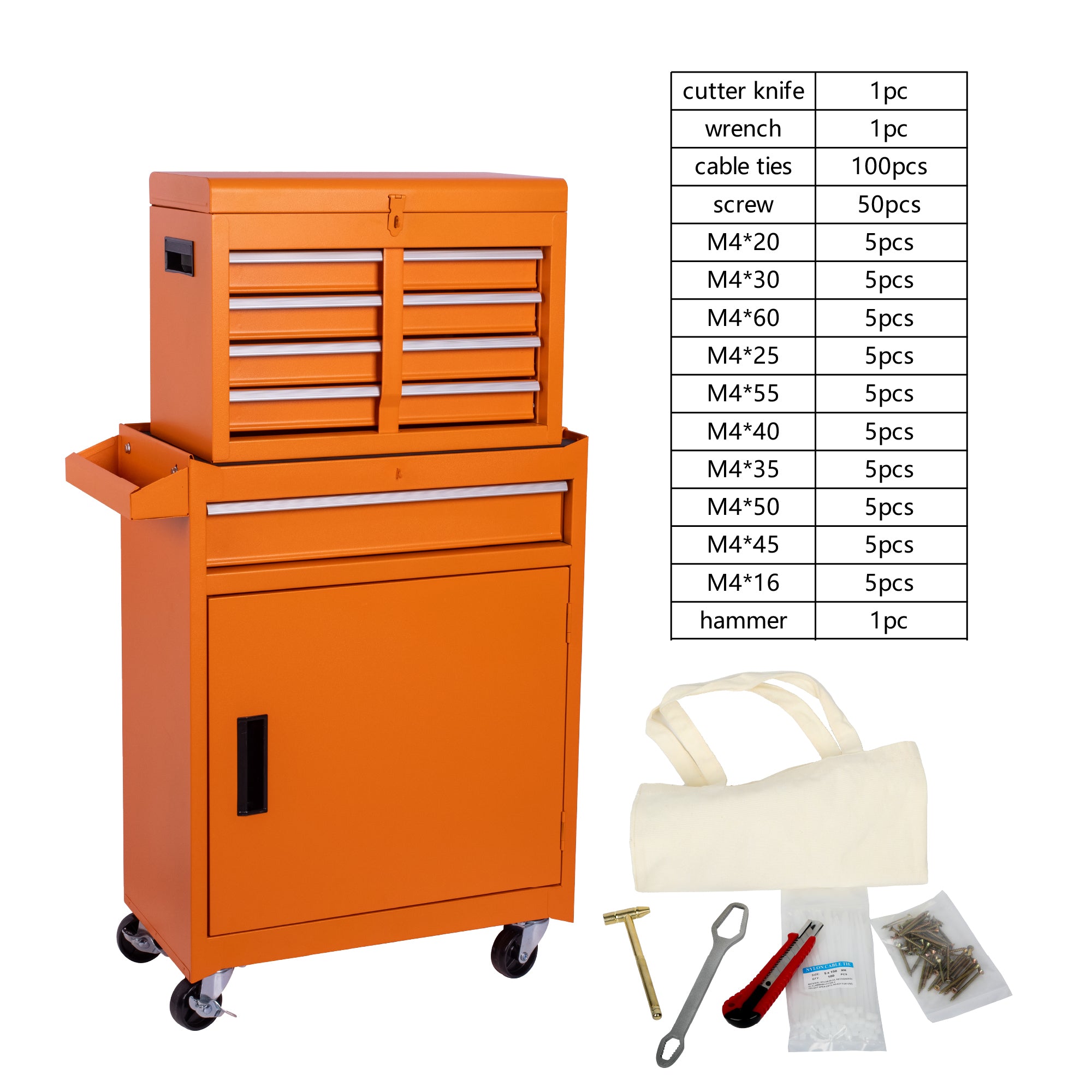 • 【Easy Moving& Storing】 Top box with 2 handles, easy to take and lift, and bottom tool cabinet with hand bars, which help you to move forward. More amazing, the top box can be stored into bottom cabinet, saving your space.Equipped with 4 universal wheels (2 with brakes), the rolling tool chest can be easily moved anywhere, and is fixed in place to increase security. The convenient rod helps you push it more easily.