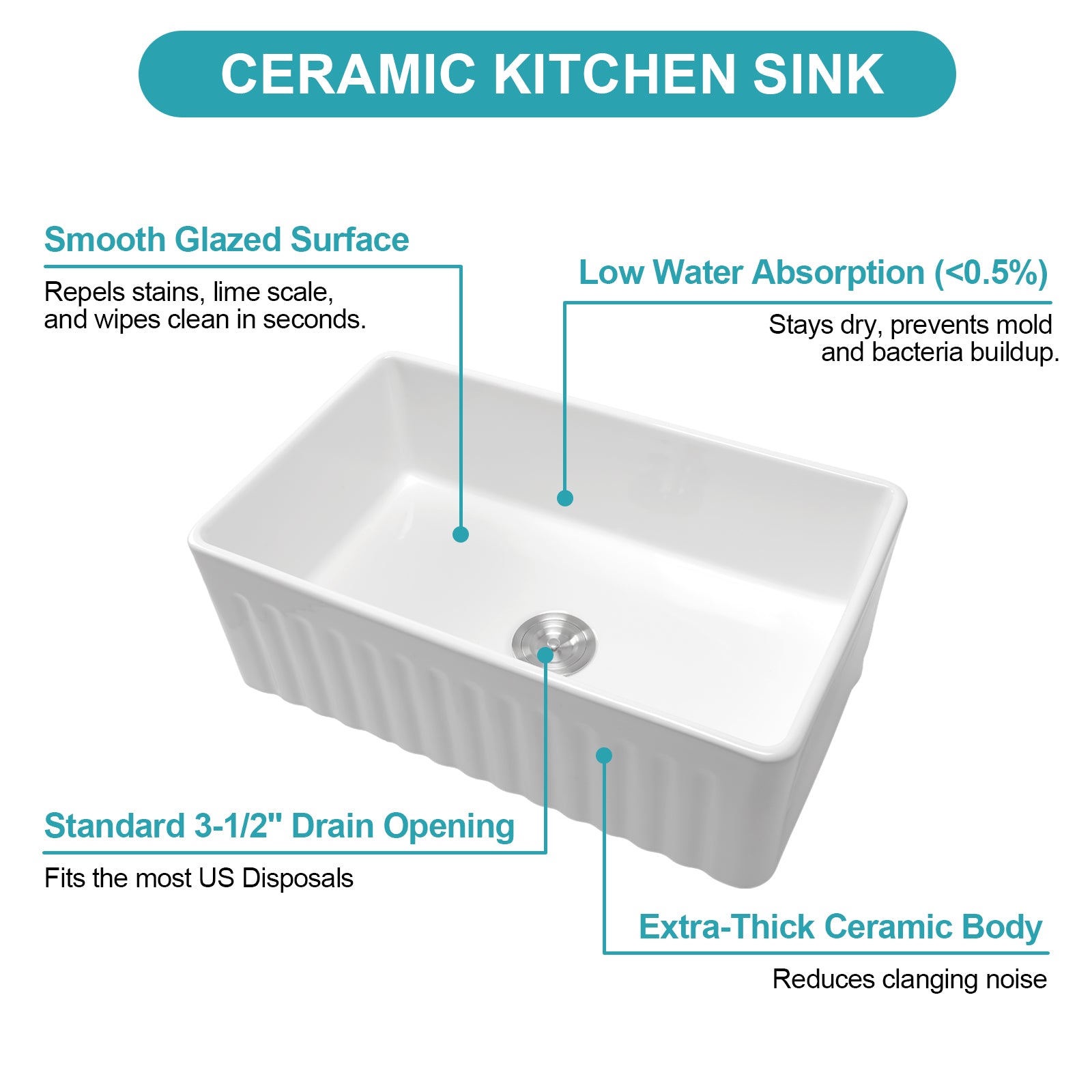 • This 33 inch white kitchen sink constructed of ceramic for extreme strength and durability. Kitchen Sink surface is extreme resistance to chips, abrasion or scratches and discoloration for years of beauty and reliable performance.