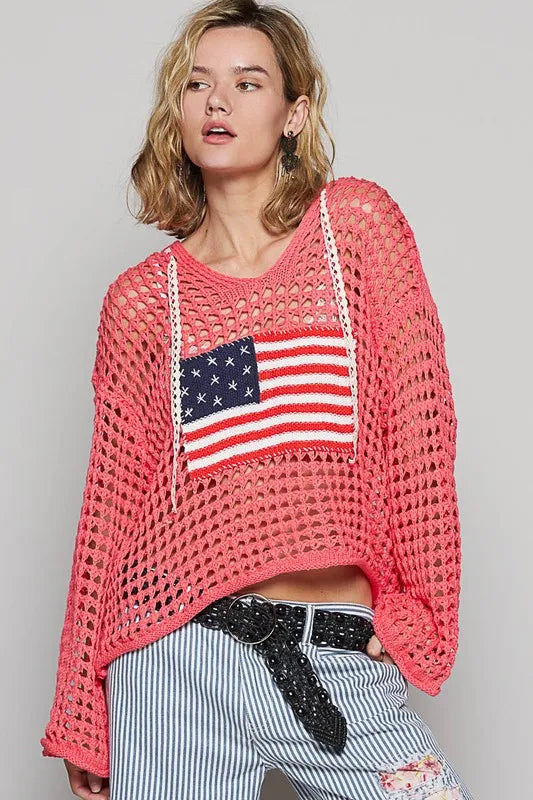 POL US Flag Hollow Out Long Sleeve Knit Cover Up