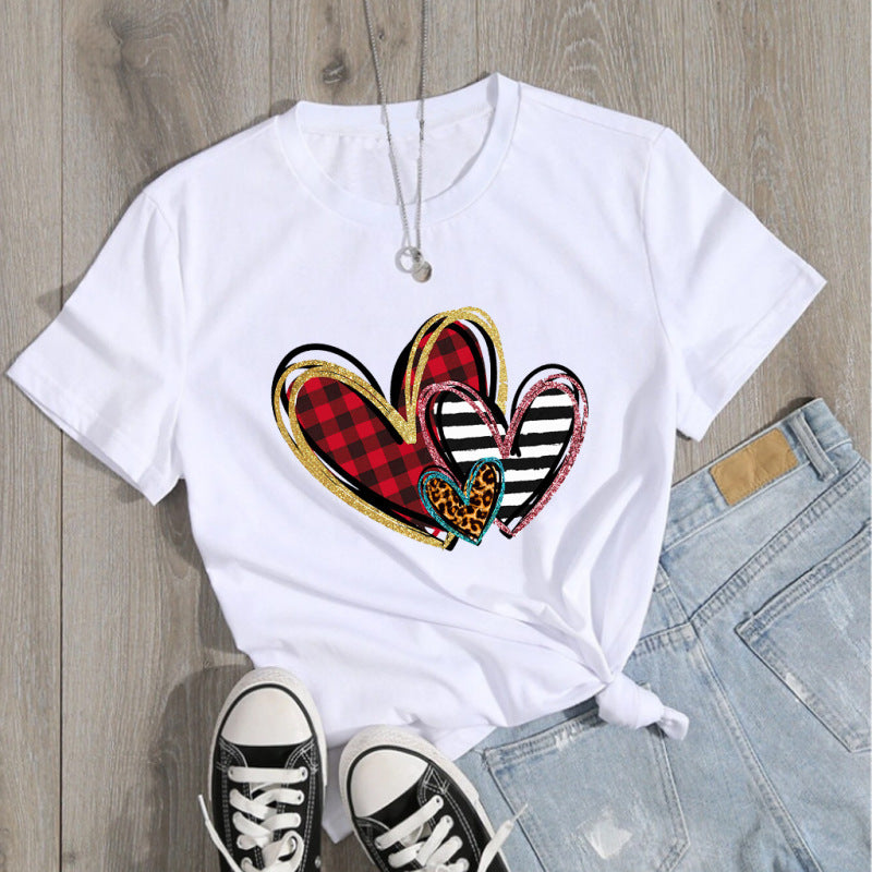 So soft and comfy, this crewneck short sleeve T-shirt features an adorable graphic print and a flattering scoop neckline. super chic for Valentine's Day.
