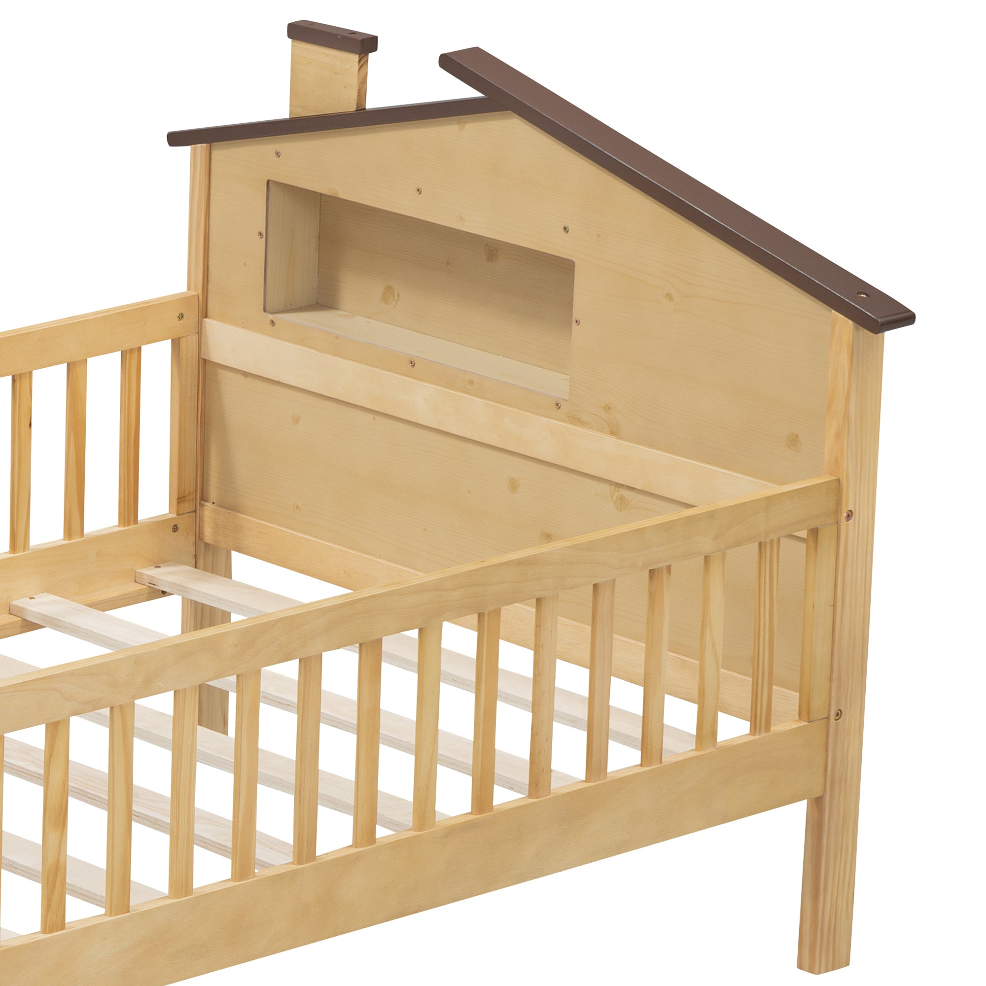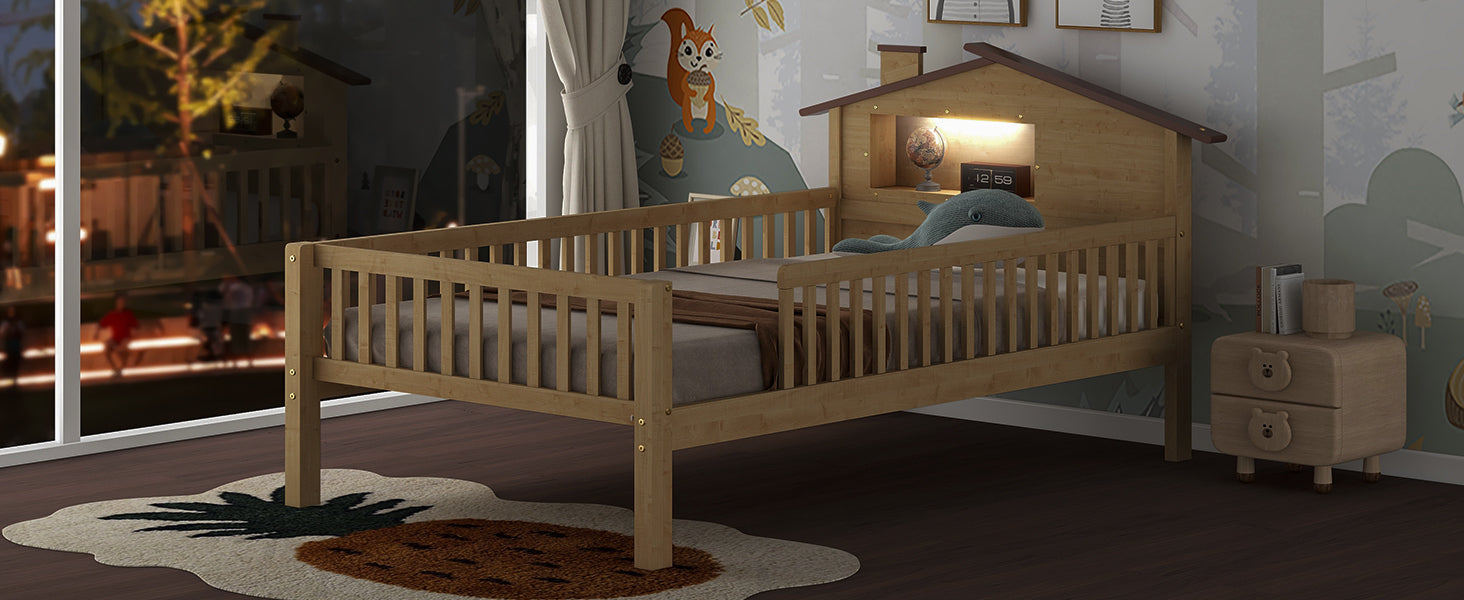 Twin Size Wood Platform Bed with House-shaped Headboard, LED and Built-in Storage, Natural