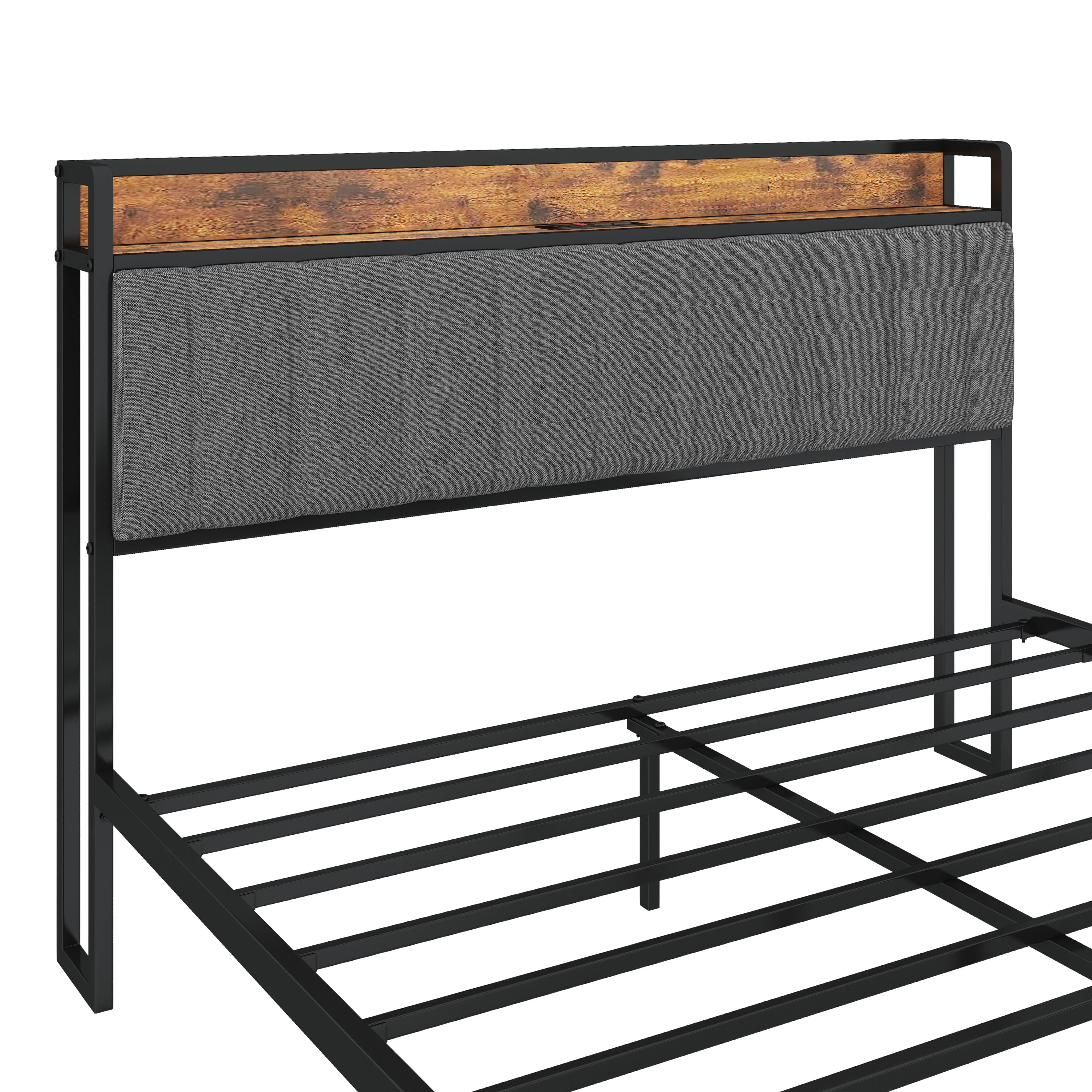 Queen Size Bed Frame with Charging Station, Upholstered Headboard, Metal Platform, Grey