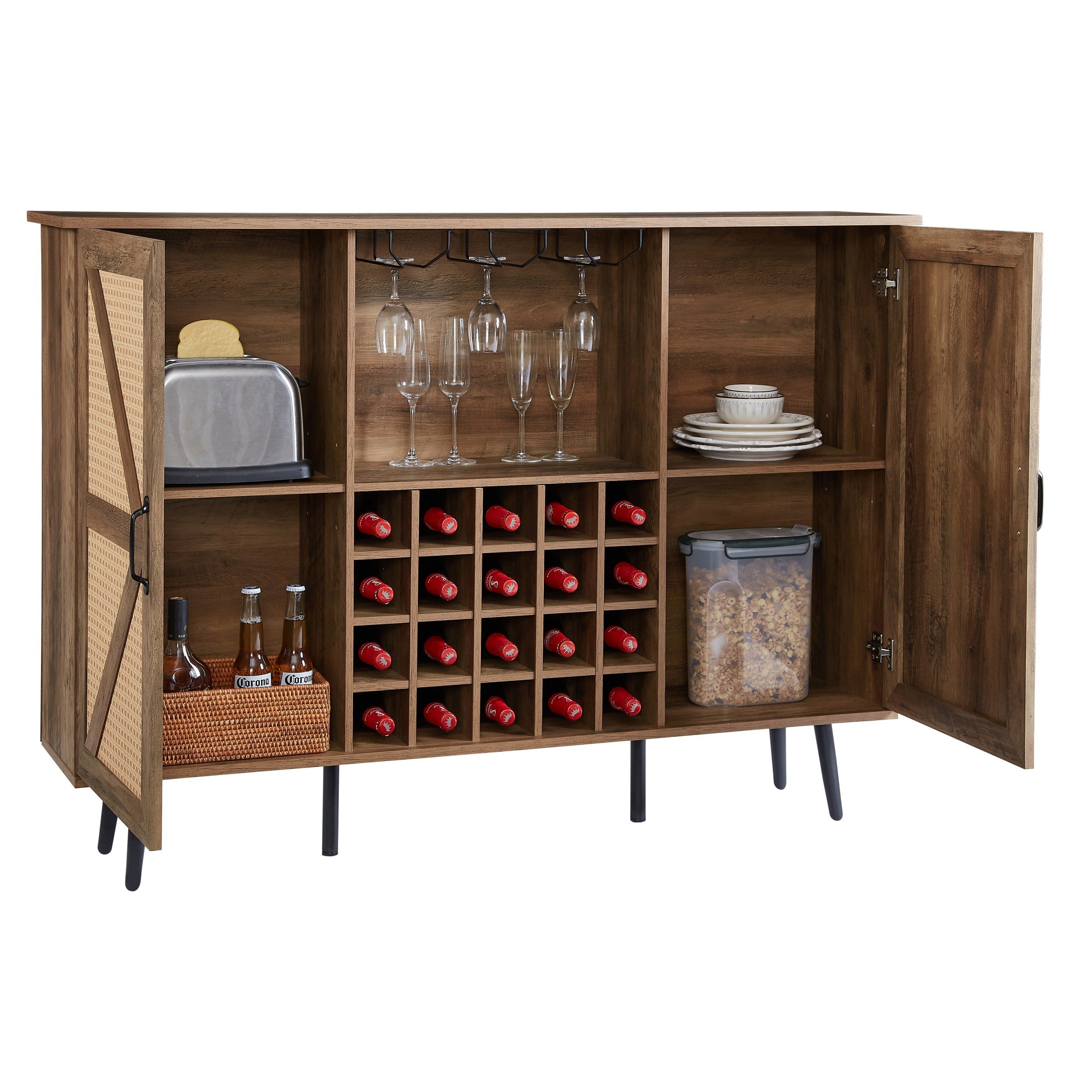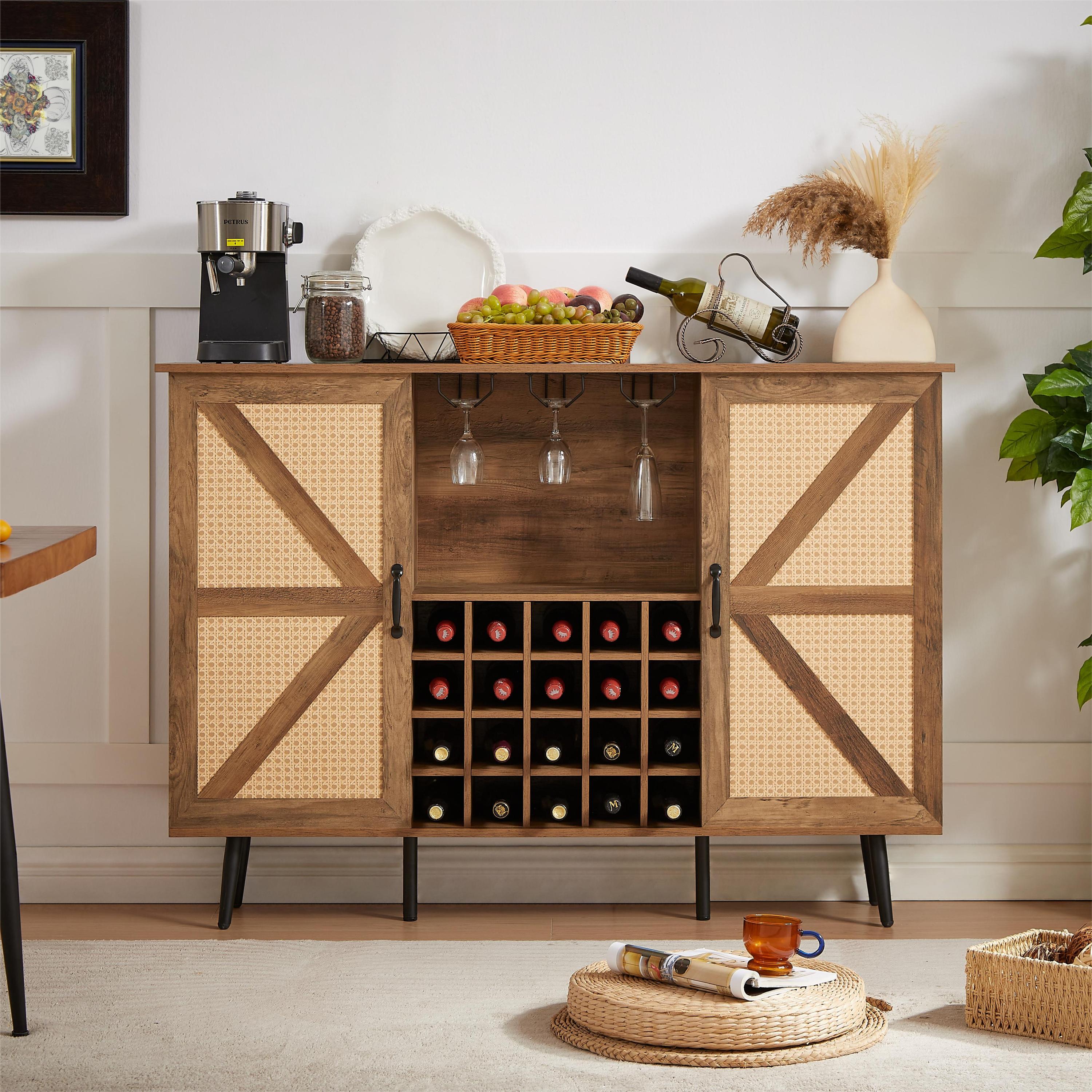 Oak Color Faux Rattan Barn Door Wine Cabinet with Wine Rack & Glass Rack, Double Door Design with Removable Shelves, Rustic Wood Storage Cabinet