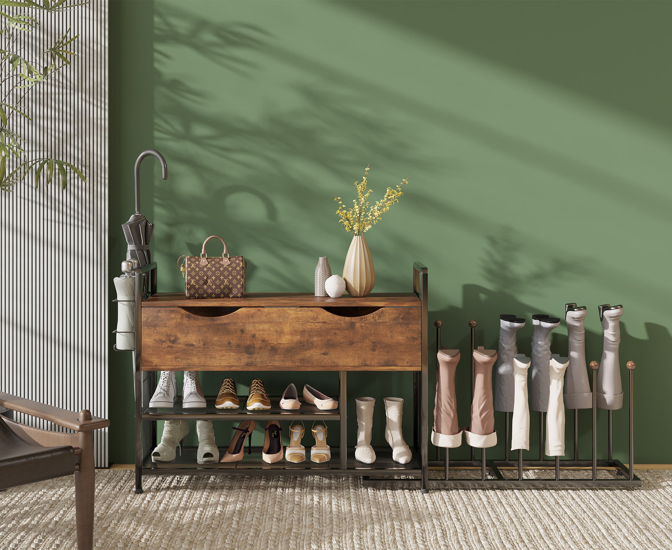 Keep your entryway organized and stylish with this Lift Top Shoe Bench Organizer. Featuring a storage compartment under the lift-up top, this piece provides hidden space for shoes, gloves, and other essentials. The tall boot rack accommodates your boots and taller footwear, while the integrated umbrella holder offers a convenient spot for umbrellas, helping you keep everything neatly arranged in one place.