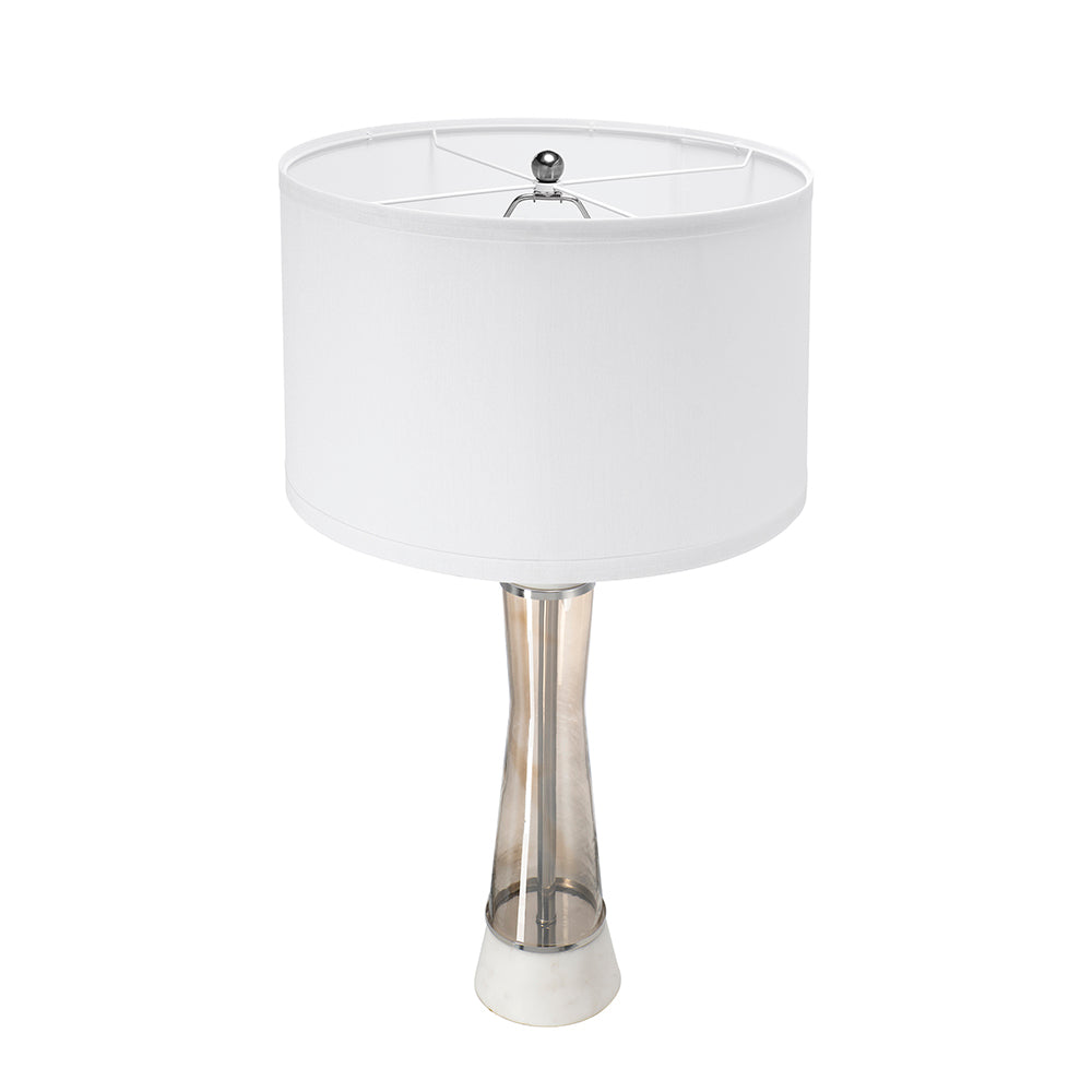 Crafted from an alluring combination of durable, natural white marble and glass, this contemporary table lamp features a round pedestal base, a white drum shade, and a thin body that is coated by a transparent layer of glass. An ideal size for your bedside table, a desk in your study, or a living room end table, it will catch the eye of your guests from any location.