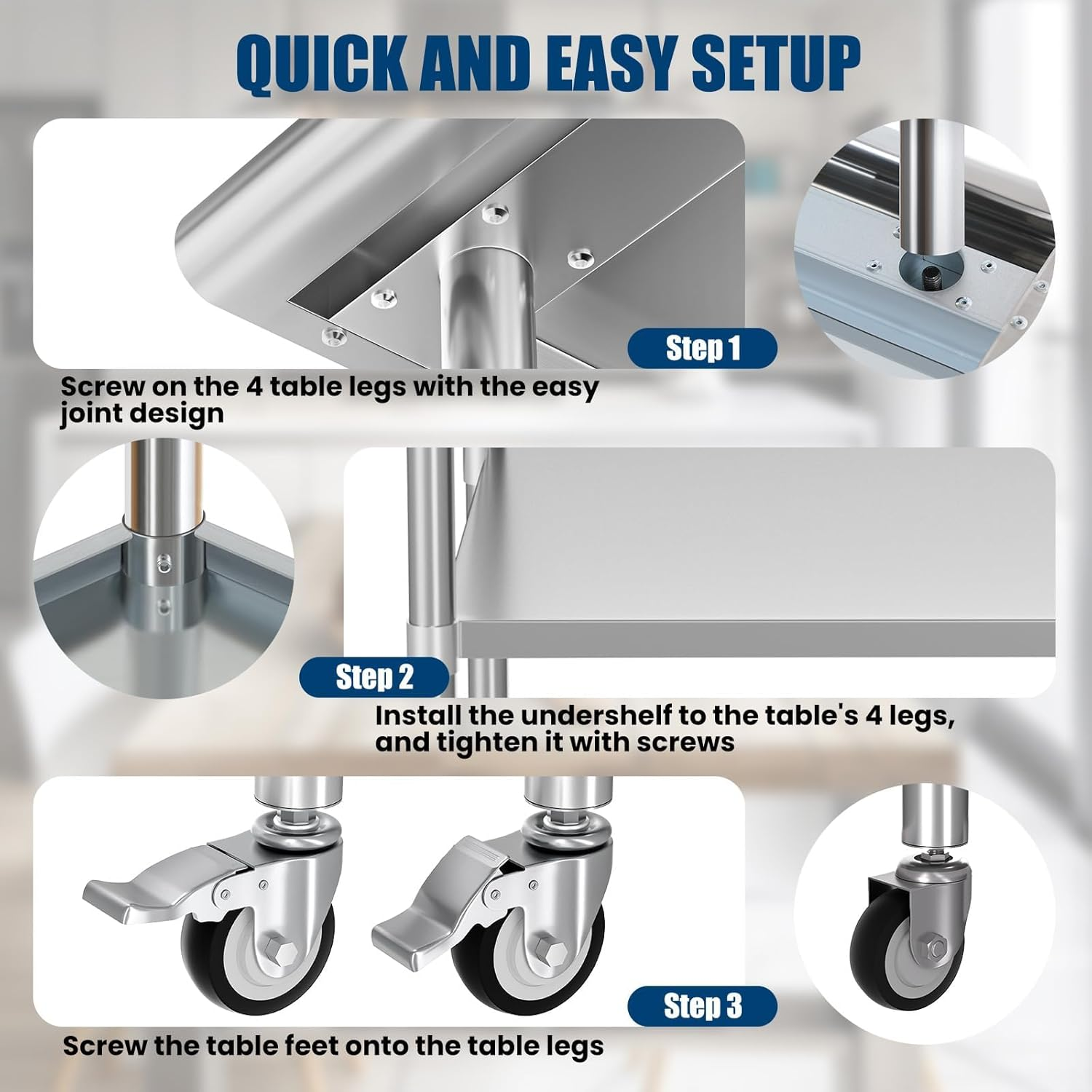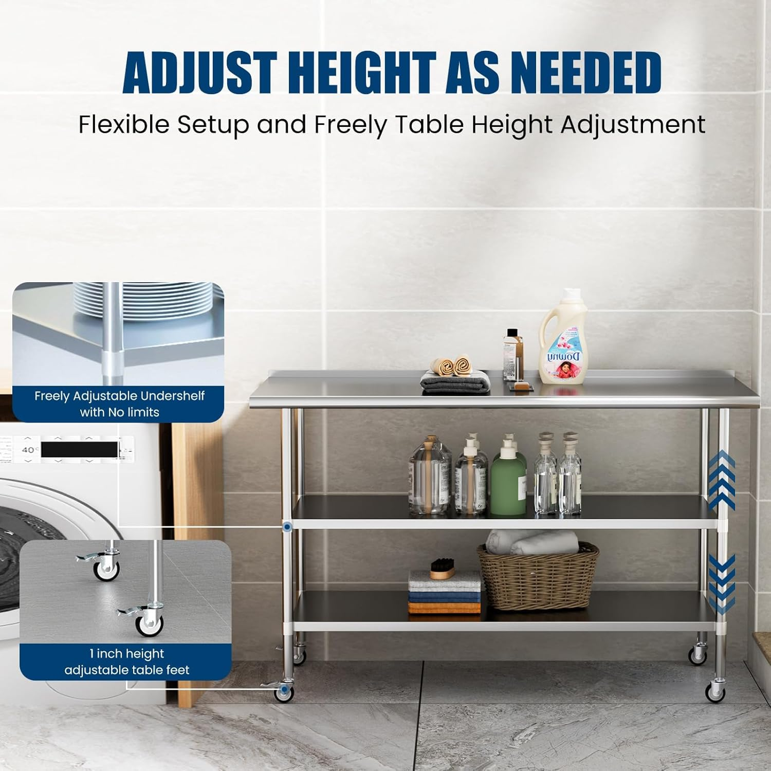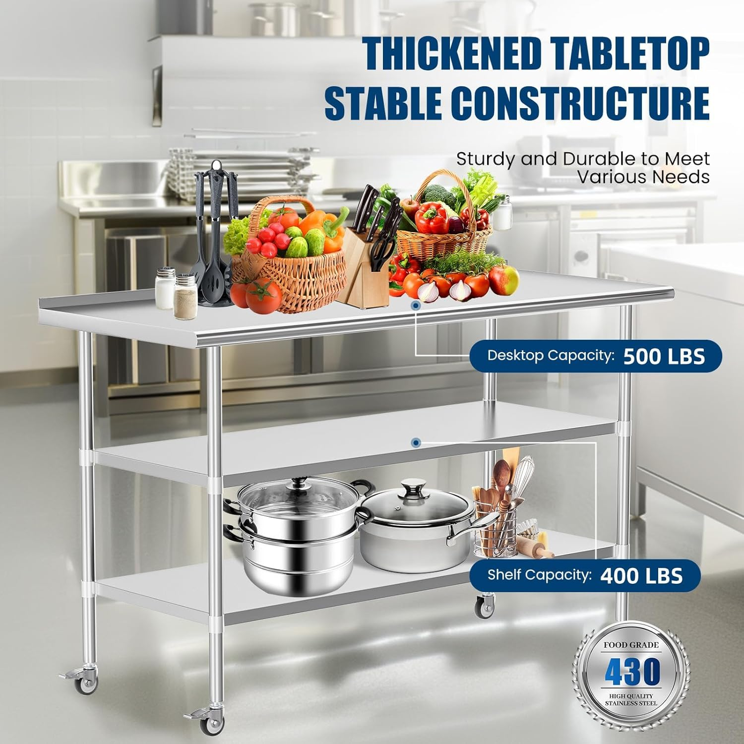 • Heavy-Duty Worktable: Measuring 60x24x34 inches, the stainless steel kitchen table provides a spacious workspace and 2 undershelves. Can support up to 500 lbs on the tabletop and 400 lbs per undershelf, accommodating various storage needs