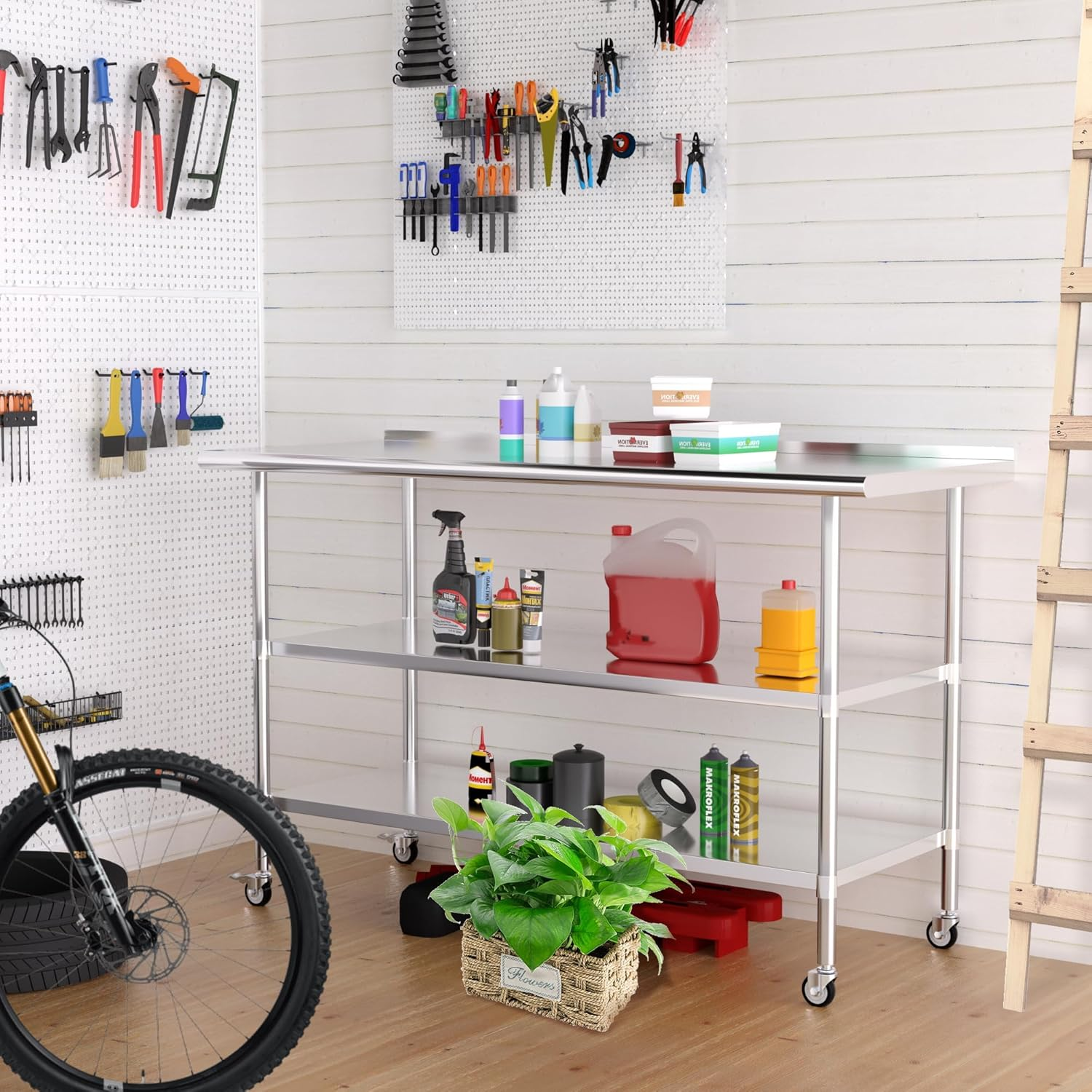 60x24 Inch Stainless Steel Table with Wheels | Commercial Prep & Work Table with 2 Adjustable Shelves