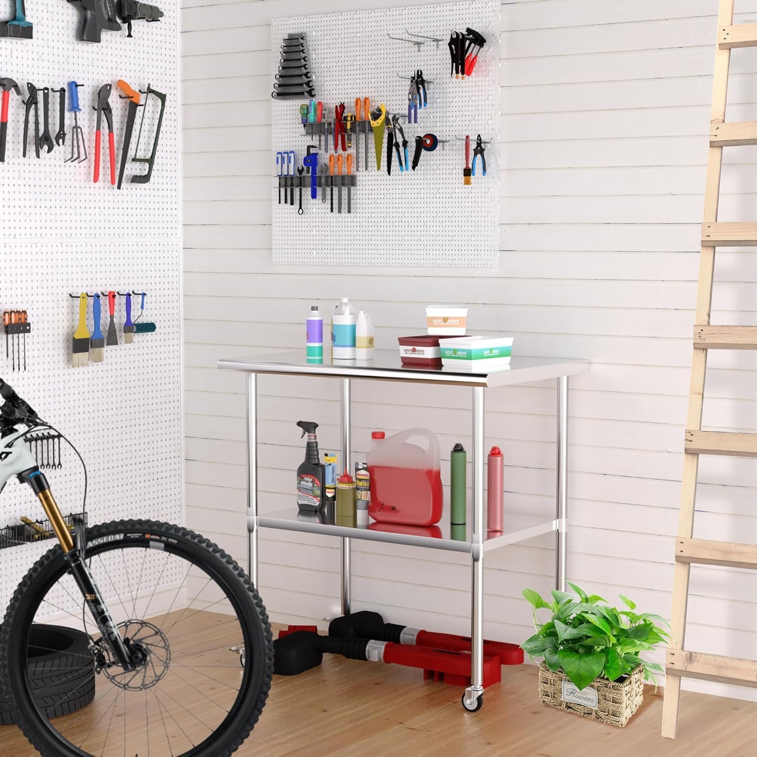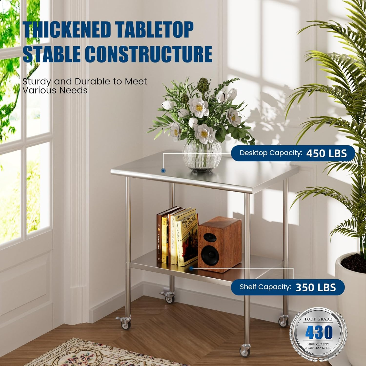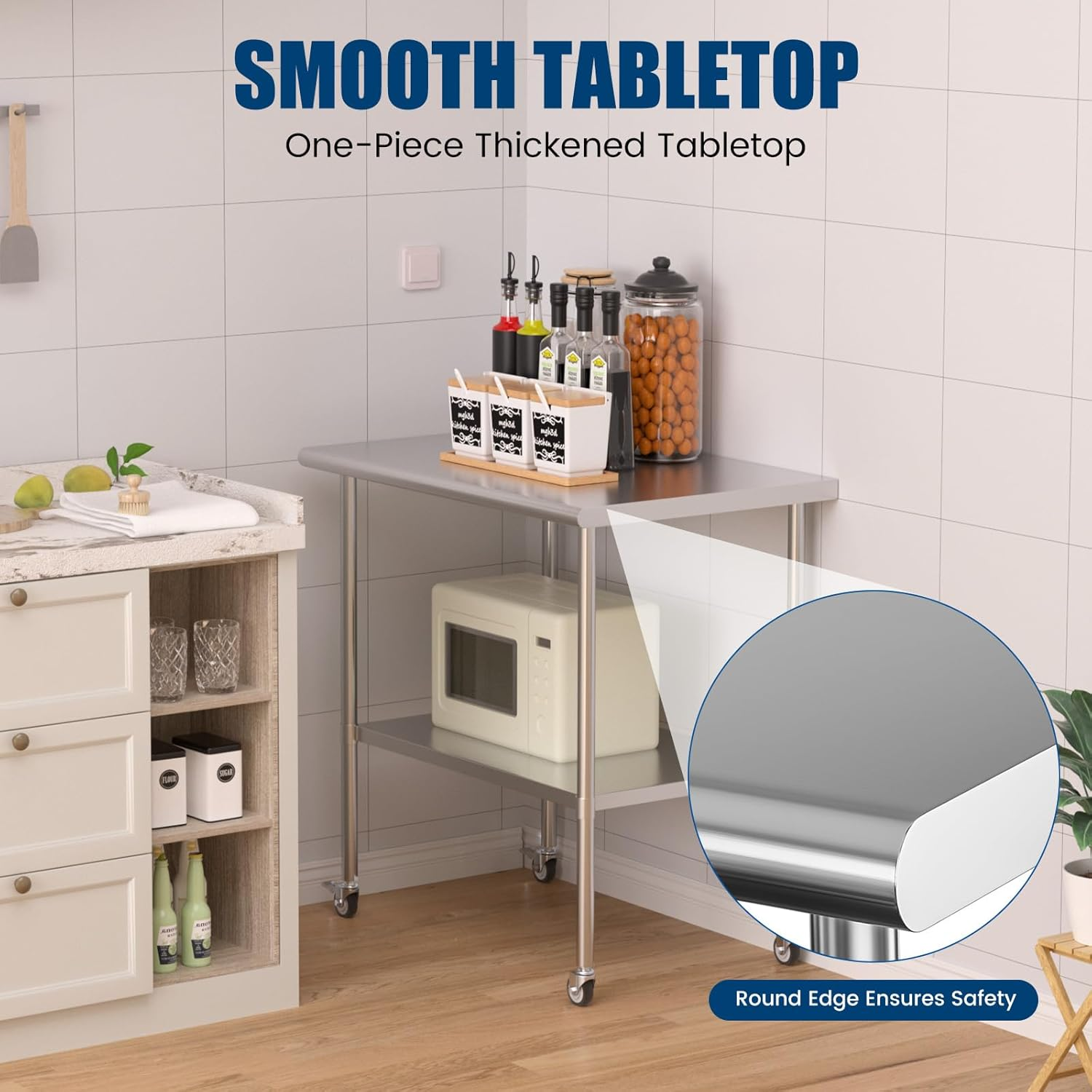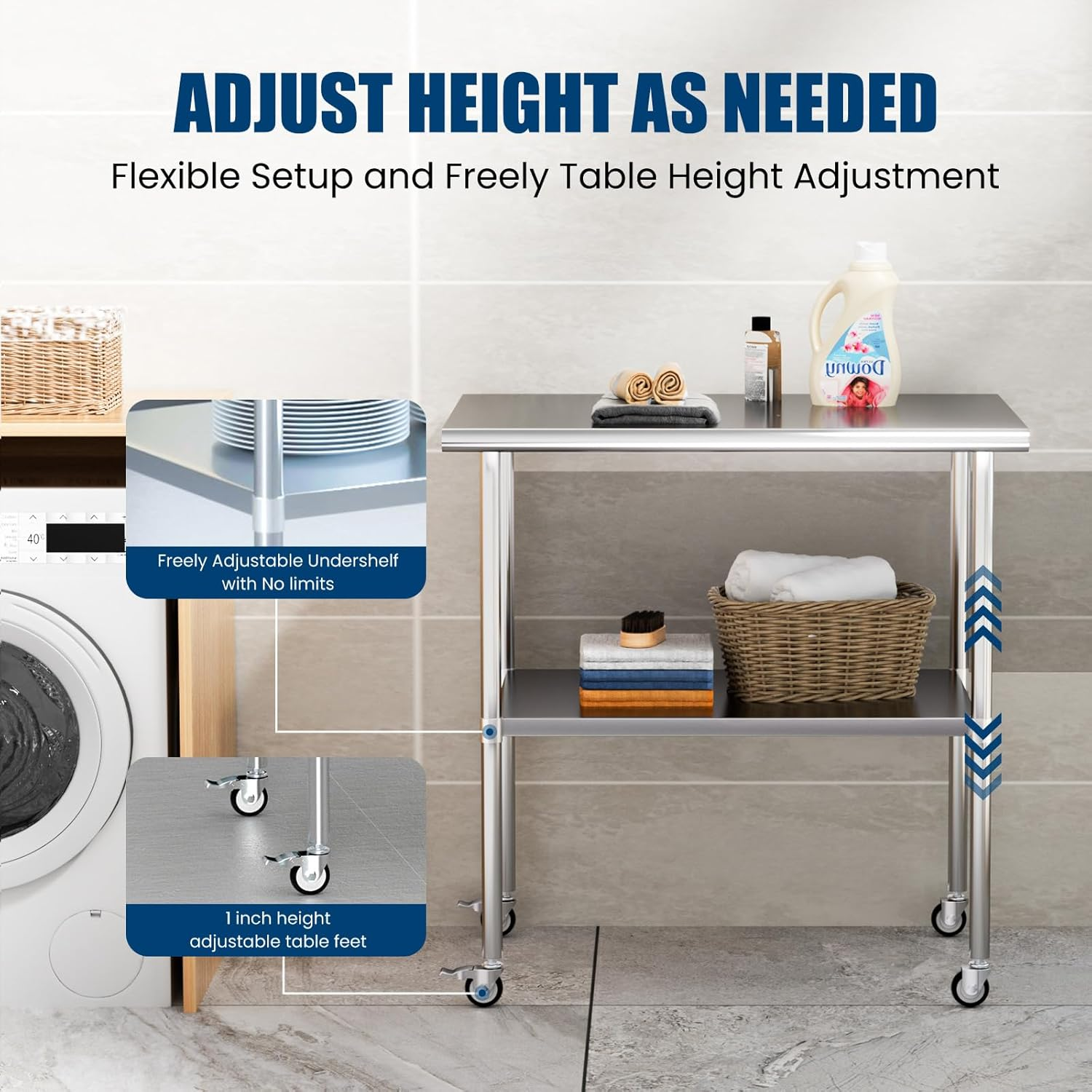 Stainless Steel Work Table 24x36 Inches with Wheels | Commercial Metal Prep Table with Adjustable Undershelf