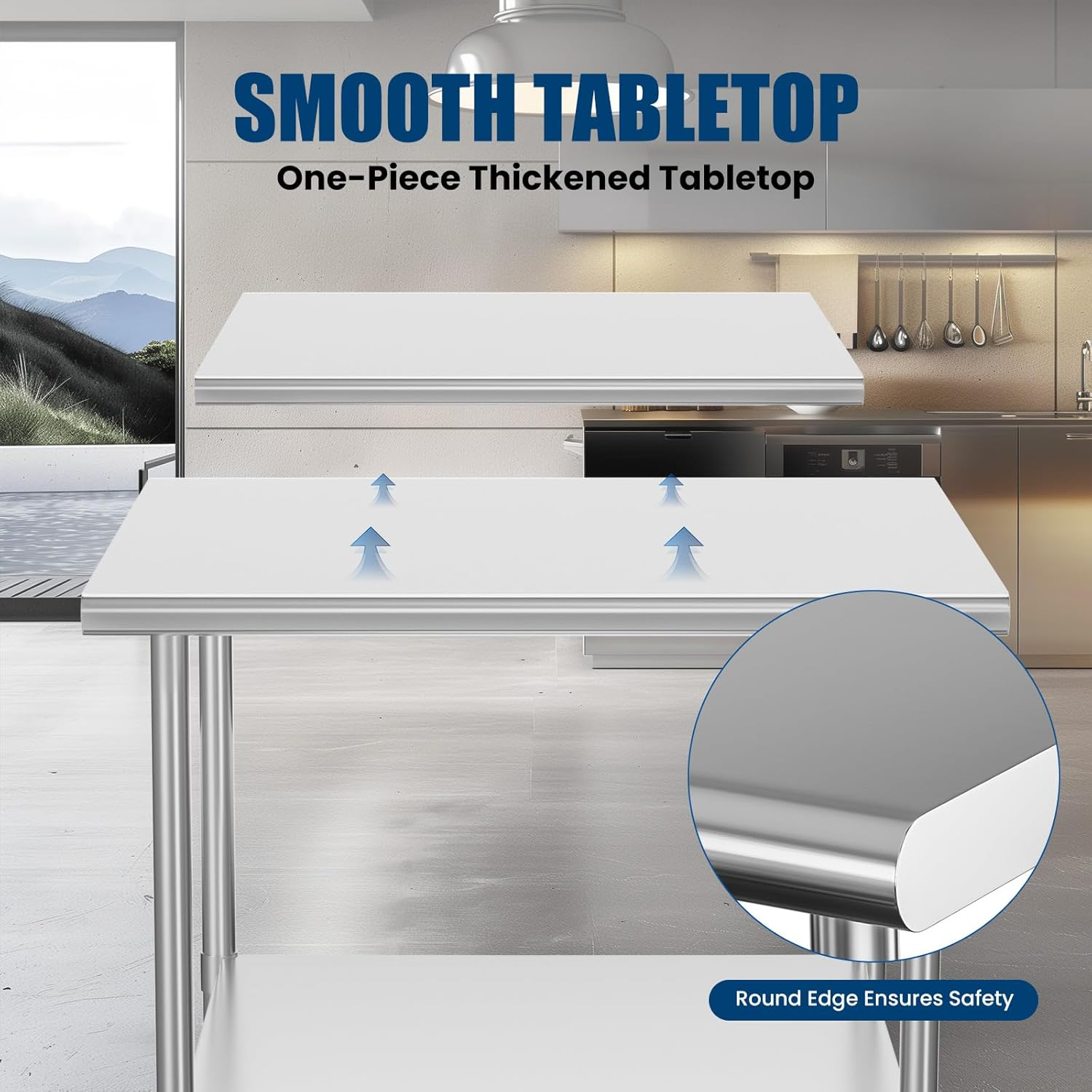 - Durable Design: NSF-certified, stainless steel table adopts a durable 430 stainless steel one-piece tabletop and a galvanized undershelf, resistant to wear and corrosion. It's the ideal choice for food preparation, ensuring safety and hygiene