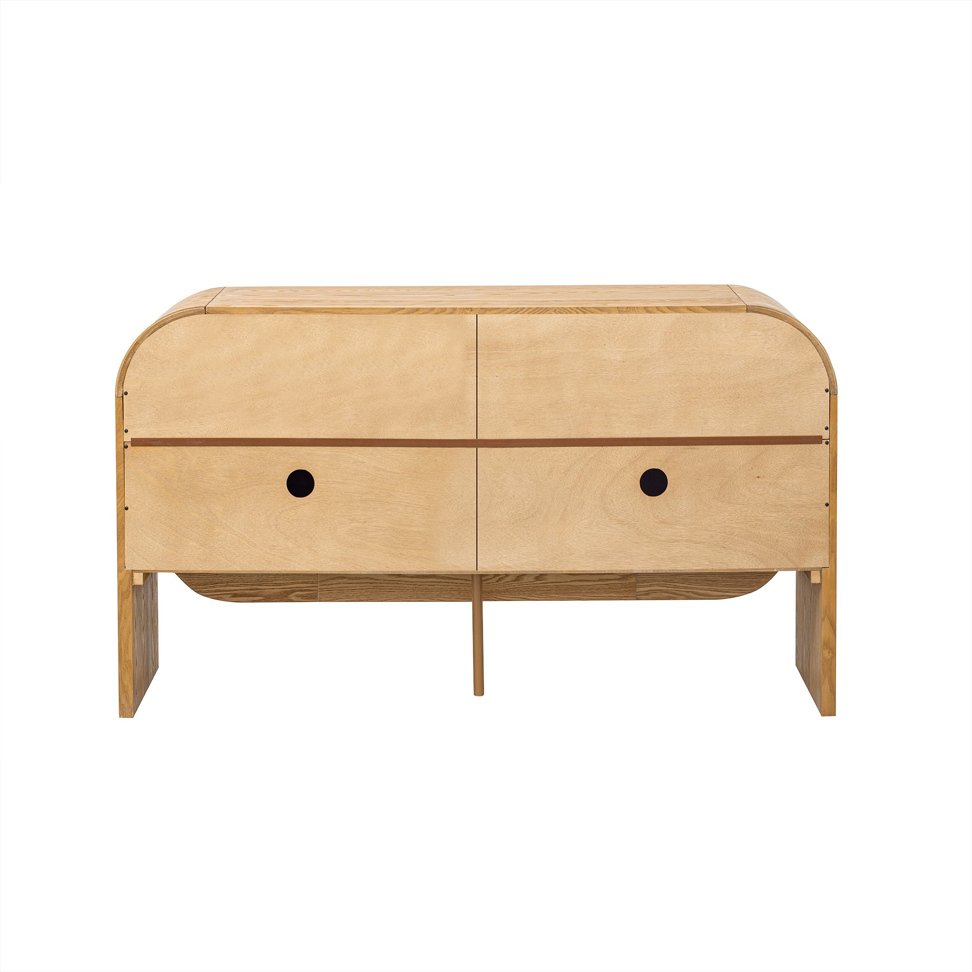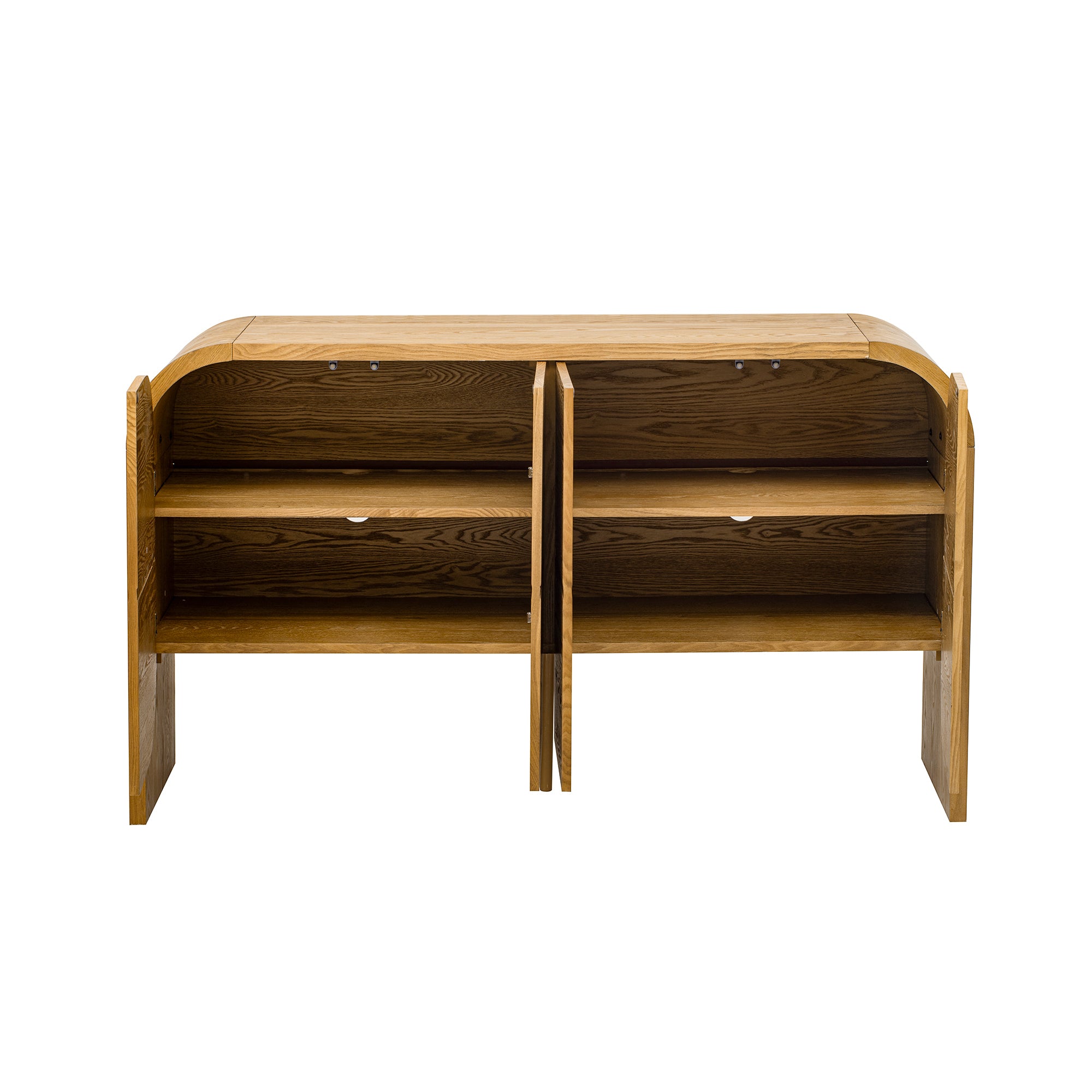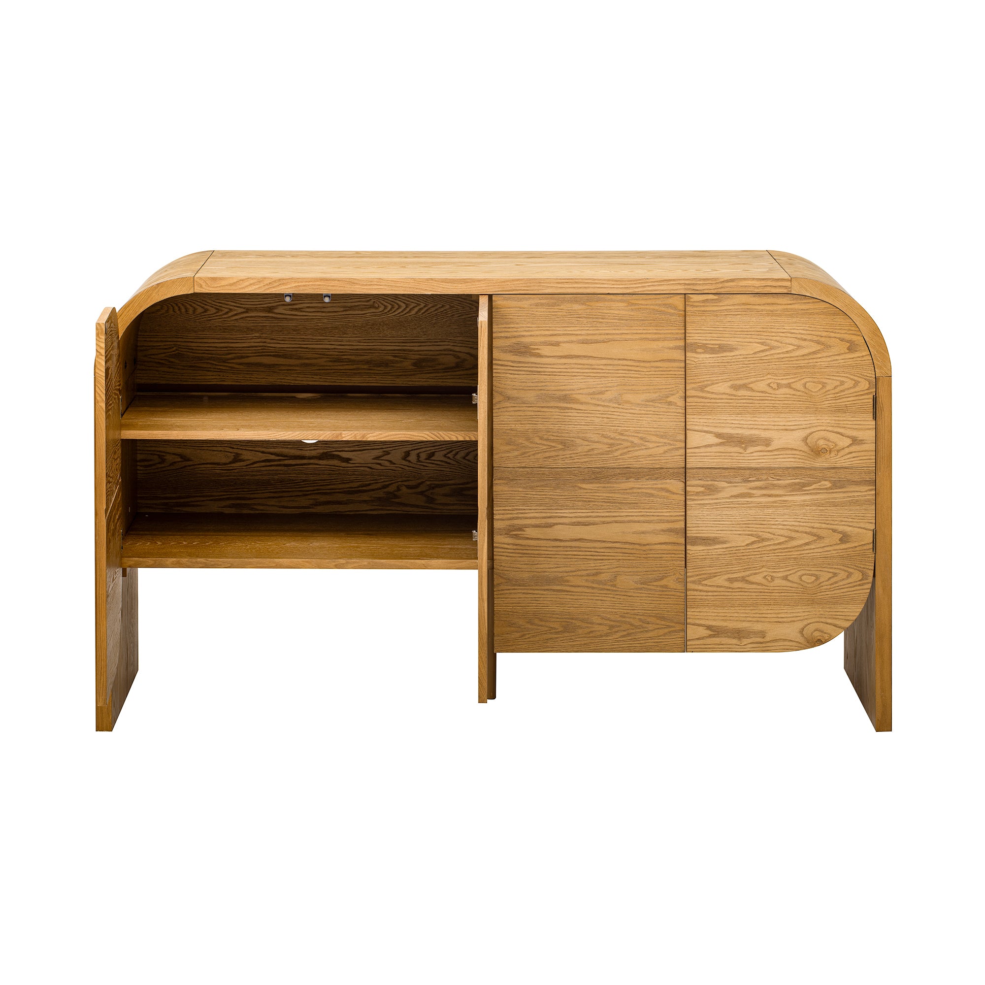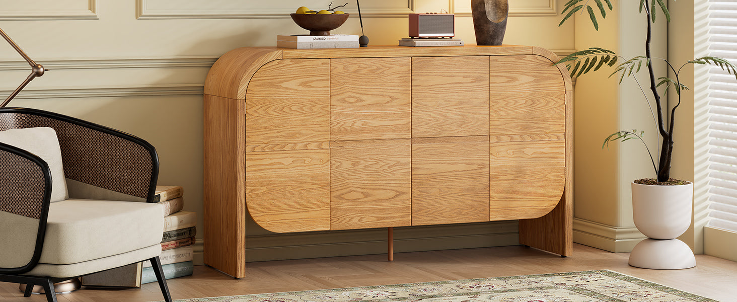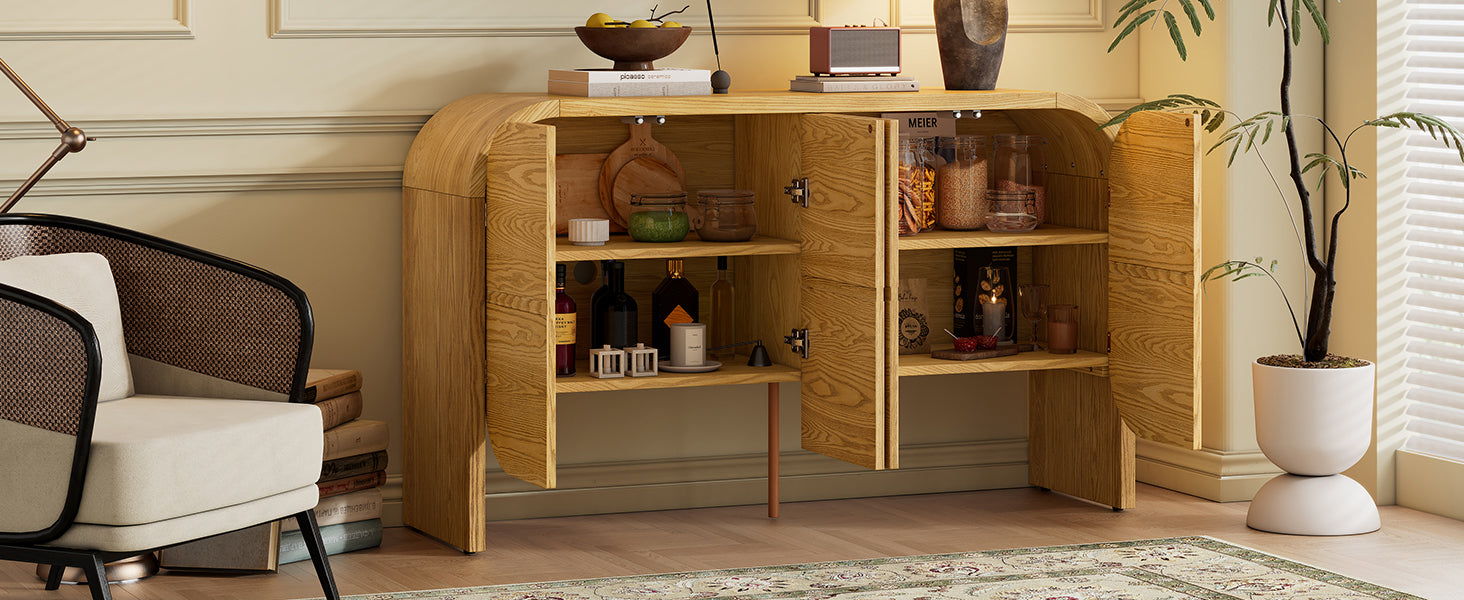 Add a touch of vintage charm to your home with the TREXM Buffet Cabinet with Storage. This elegant wood sideboard features a retro design with curvy edges, offering both style and functionality for your living room or kitchen. The 4 doors provide easy access to ample storage space, while the adjustable shelves allow for customizable organization to suit your needs. Crafted from durable wood with a natural finish, this buffet cabinet complements a variety of interior styles, from mid-century modern to rustic farmhouse. Perfect for storing dishes, linens, or décor, this credenza enhances your space while keeping your home organized.