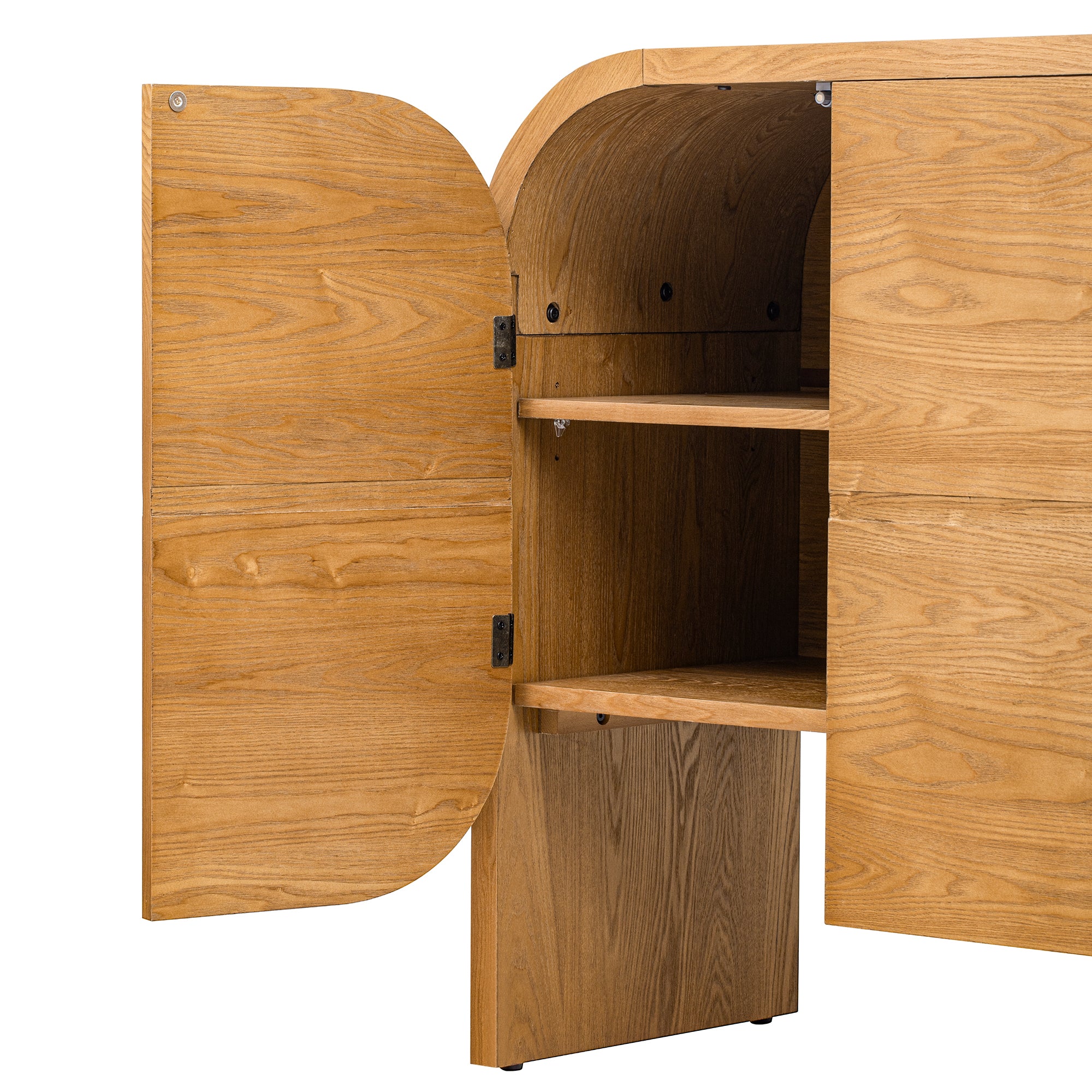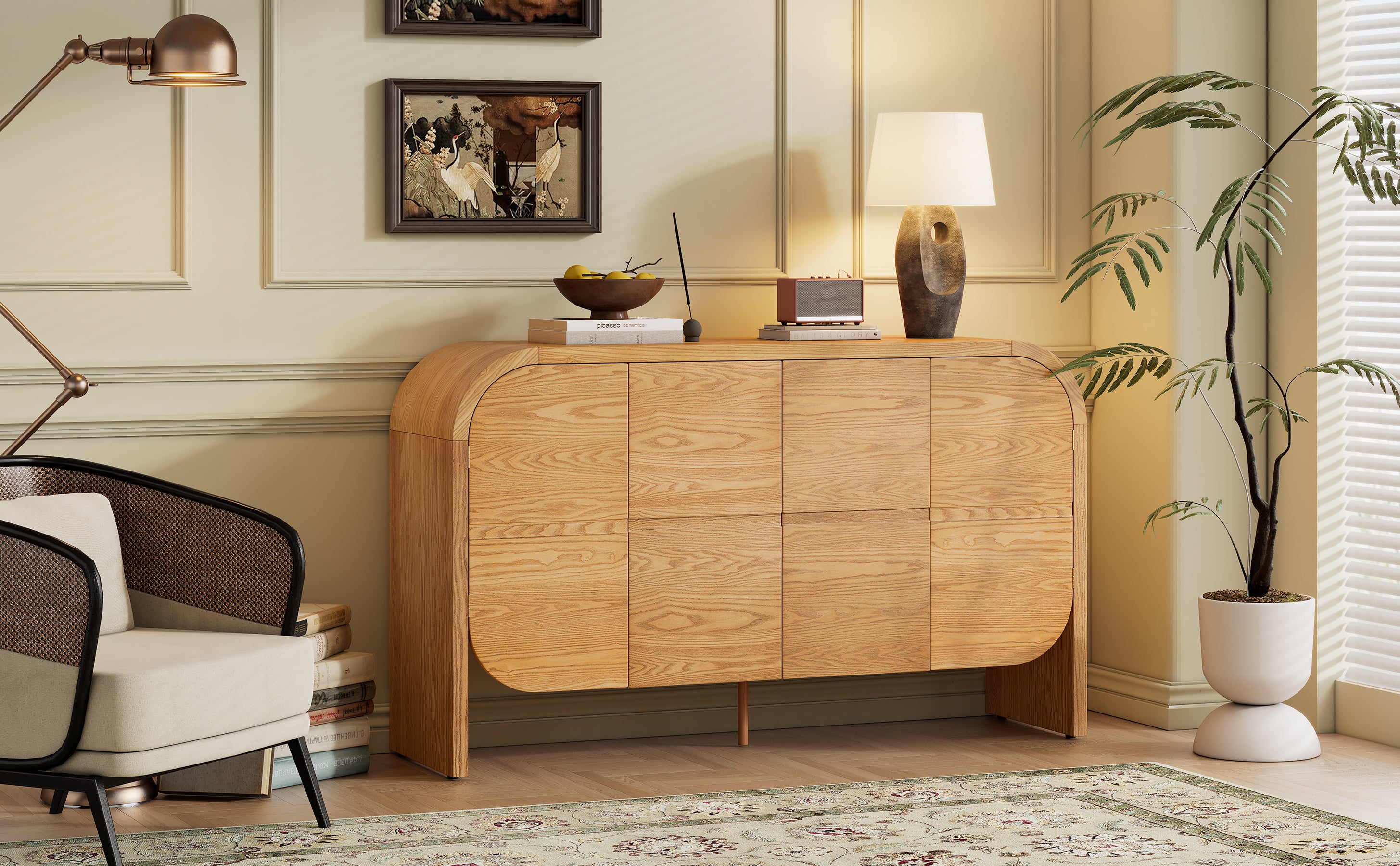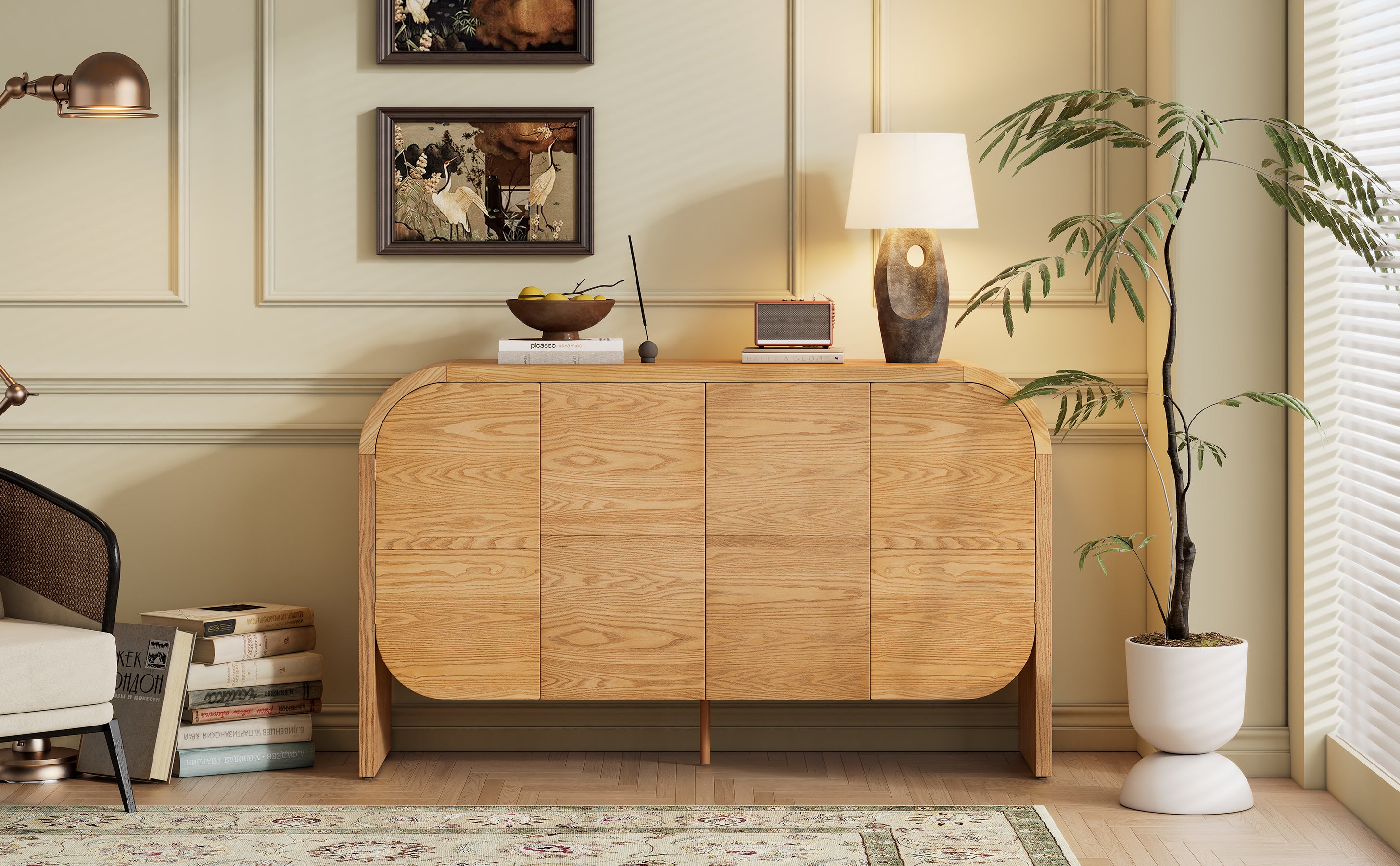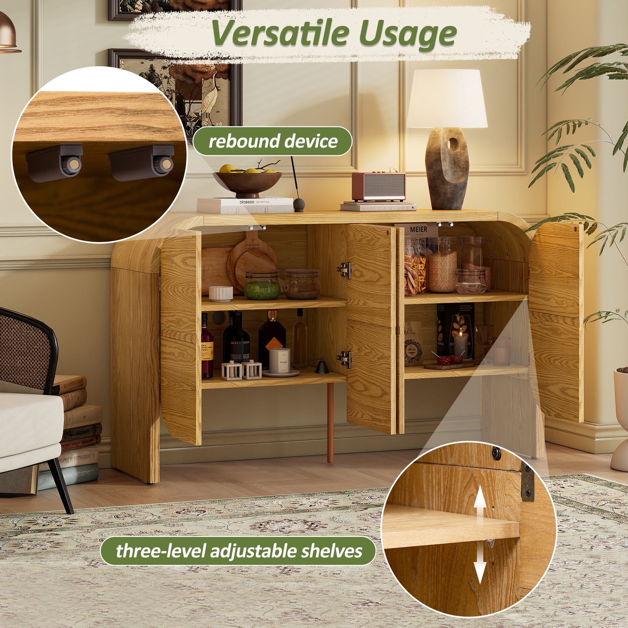 TREXM Buffet Cabinet with Storage, Wood Sideboard with Curvy Edge, 4 Doors Retro Credenza with Adjustable Shelves for Living Room, Kitchen – Natural